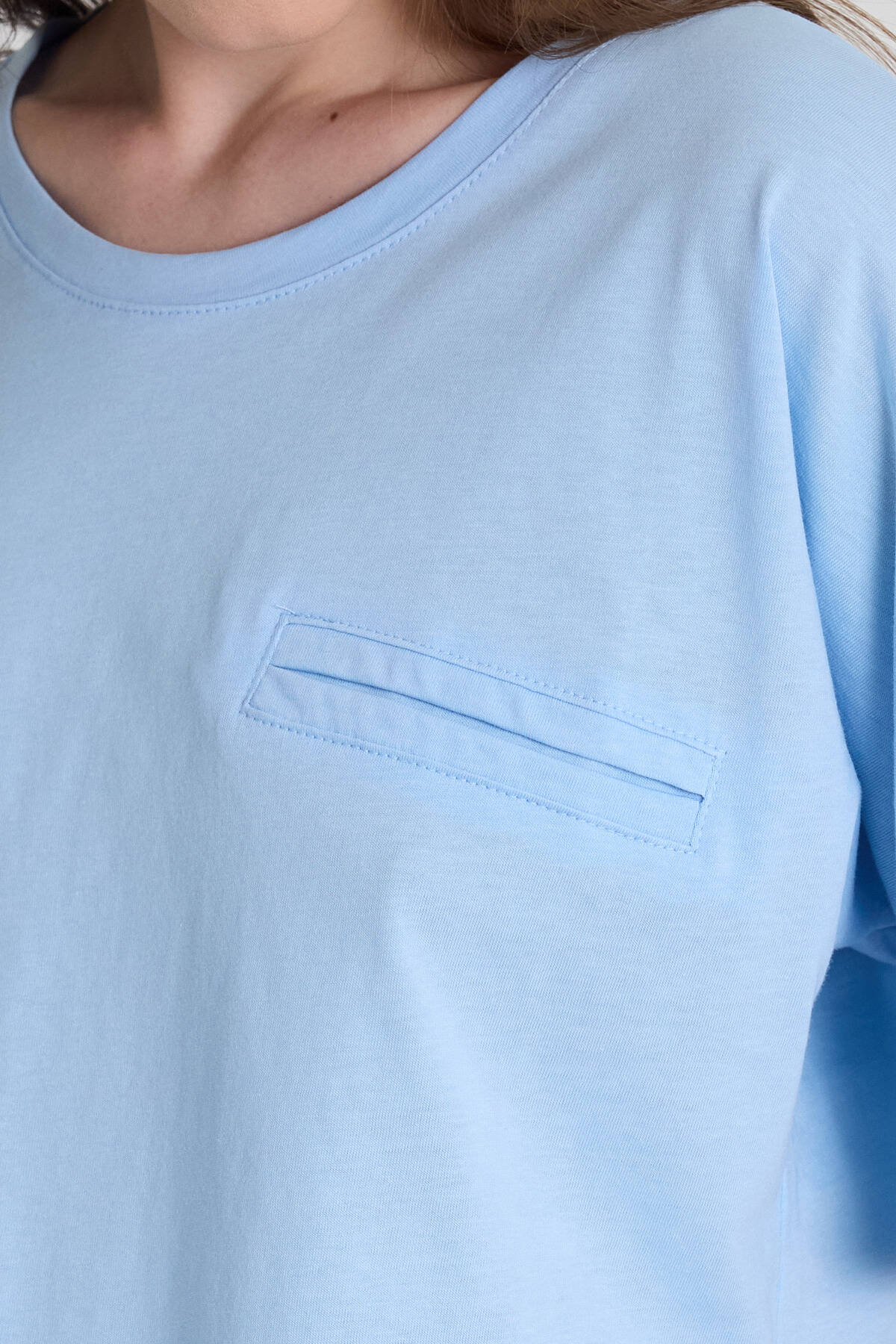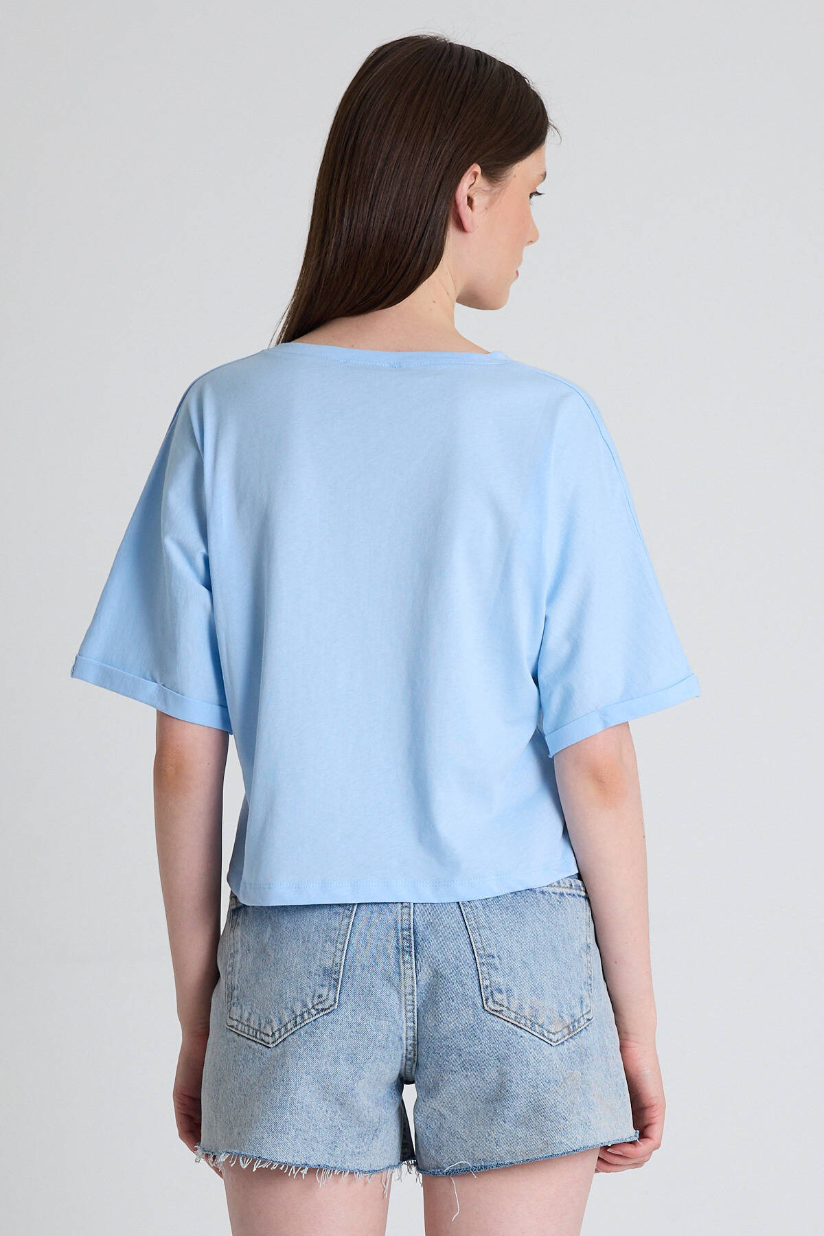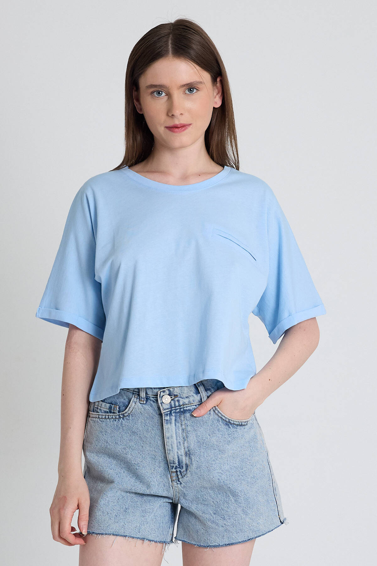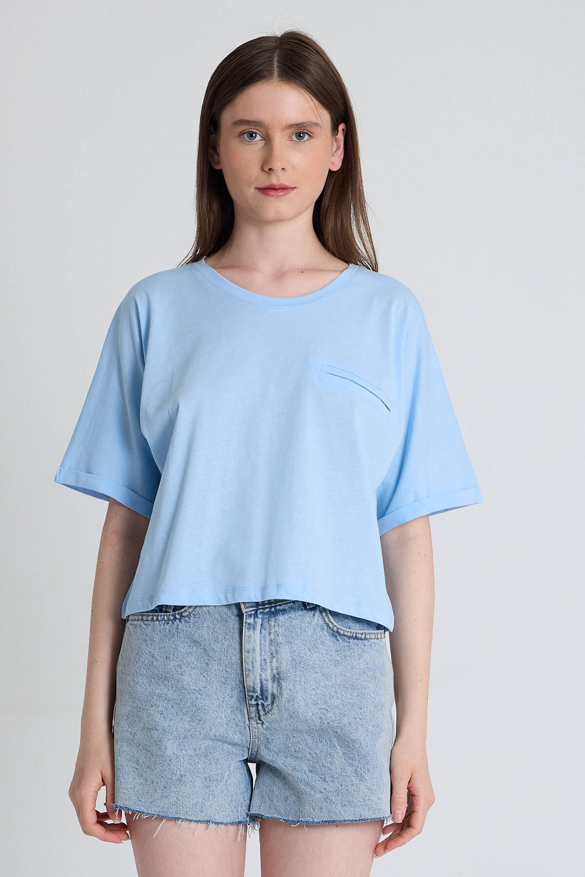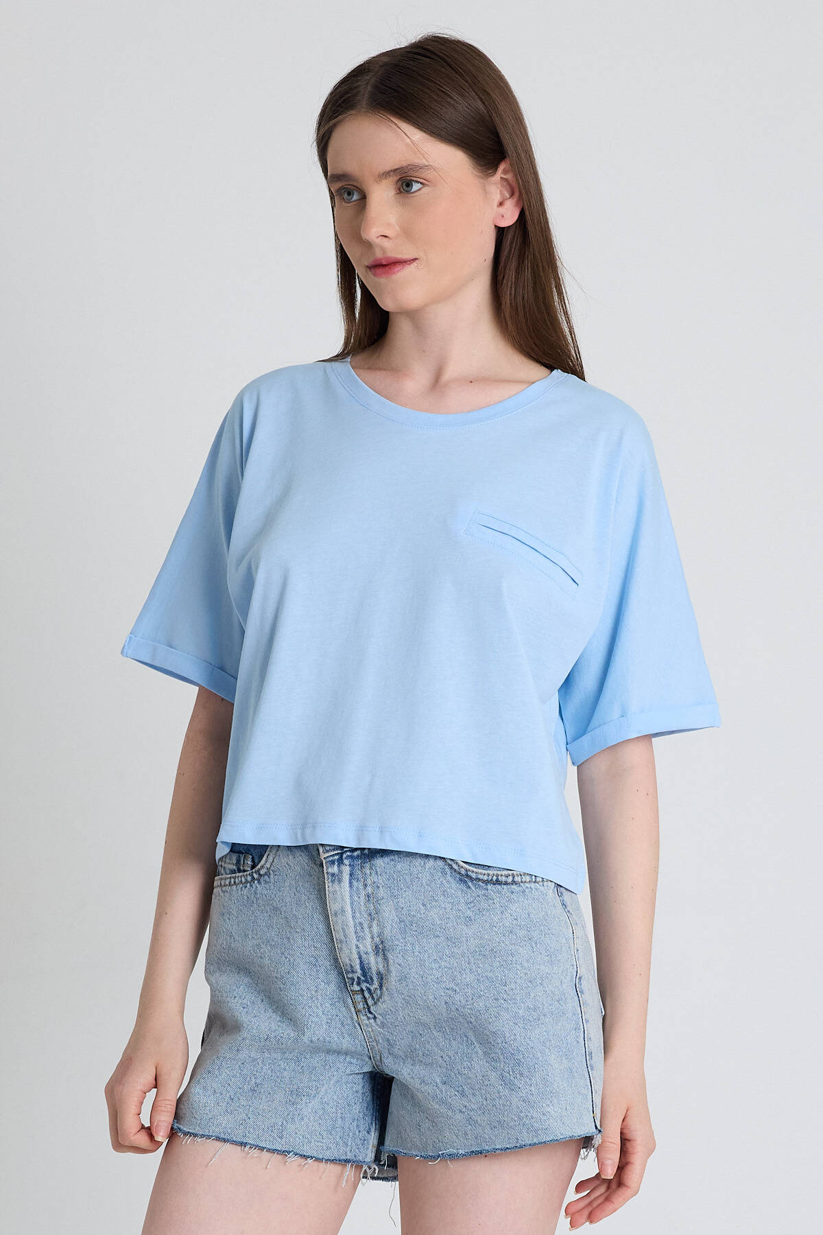 Mavi Cep Detaylı Bisiklet Yaka Crop Tişört 2136M