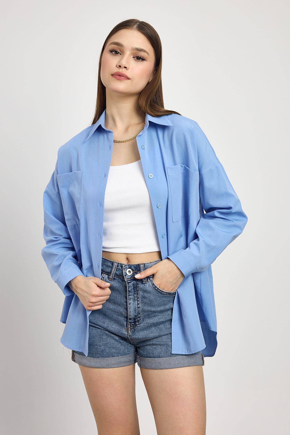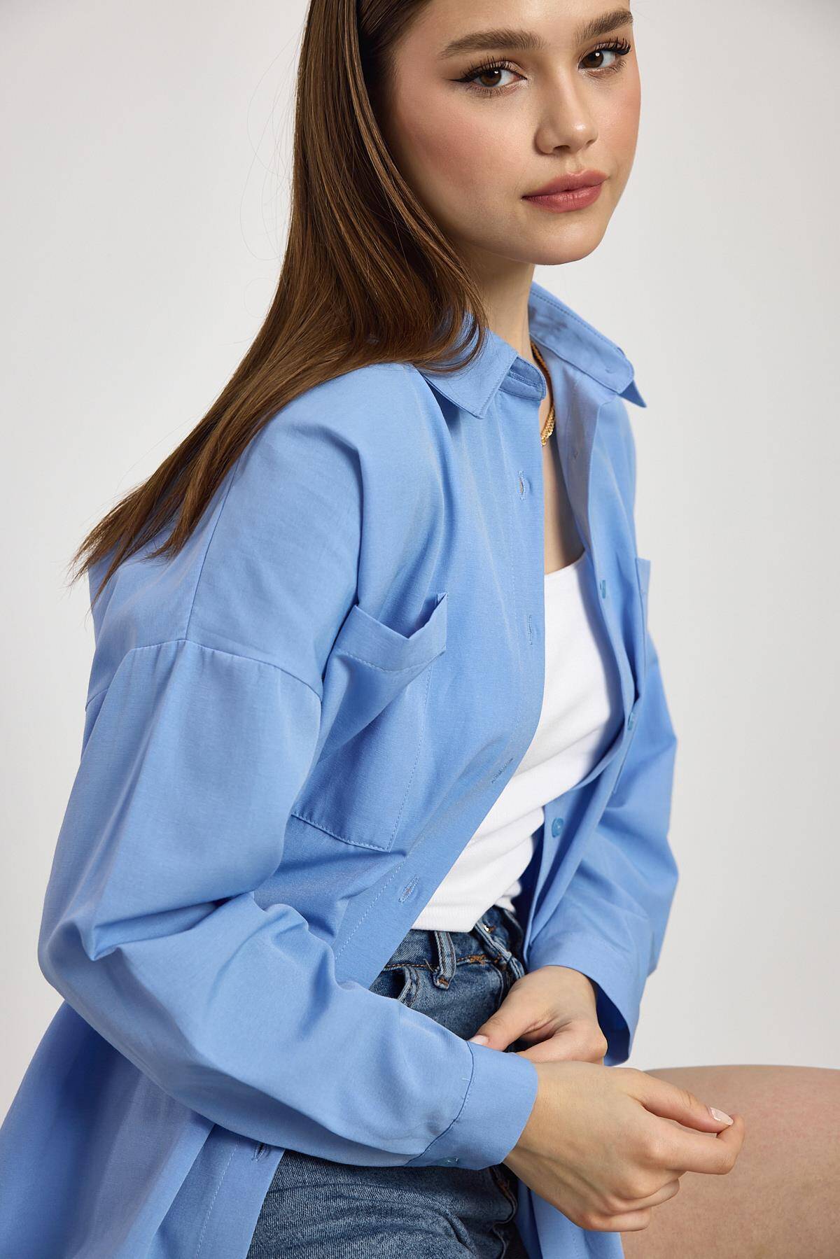 Mavi Çift Cepli Oversize Uzun Basic Gömlek TCR 6256A