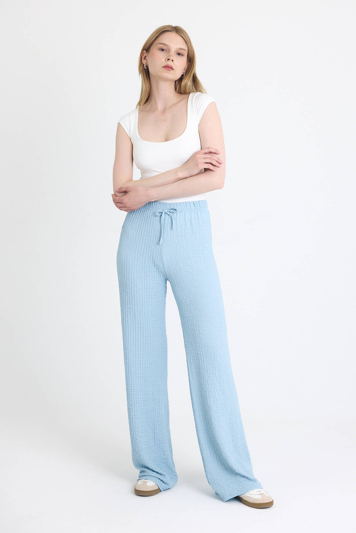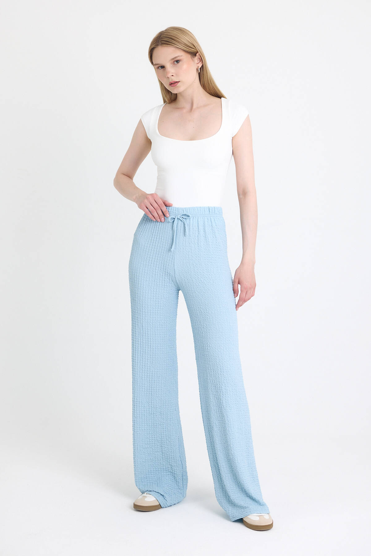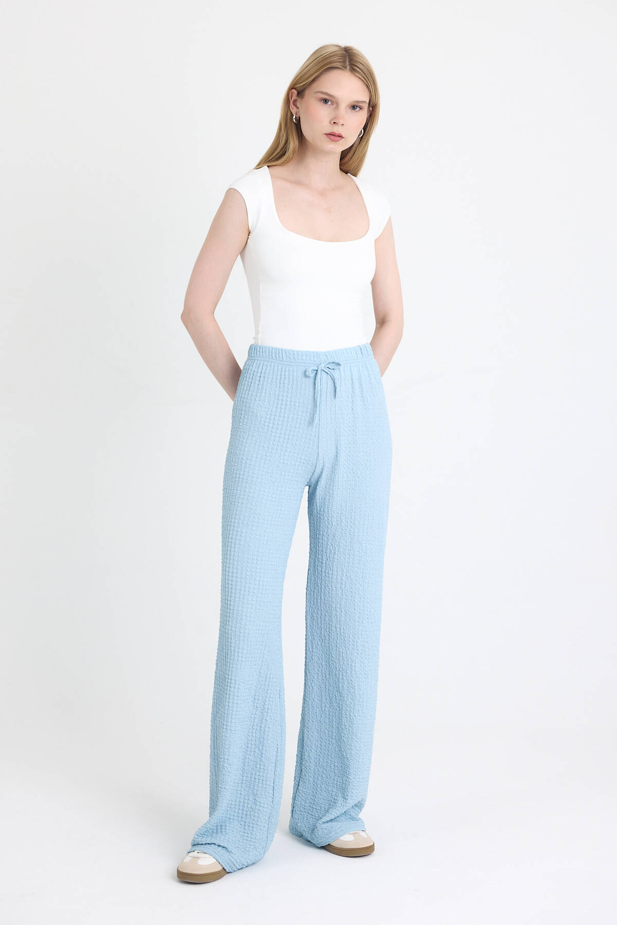 Mavi Geniş Paça Dökümlü Bürümcük Kumaş Pantolon 326