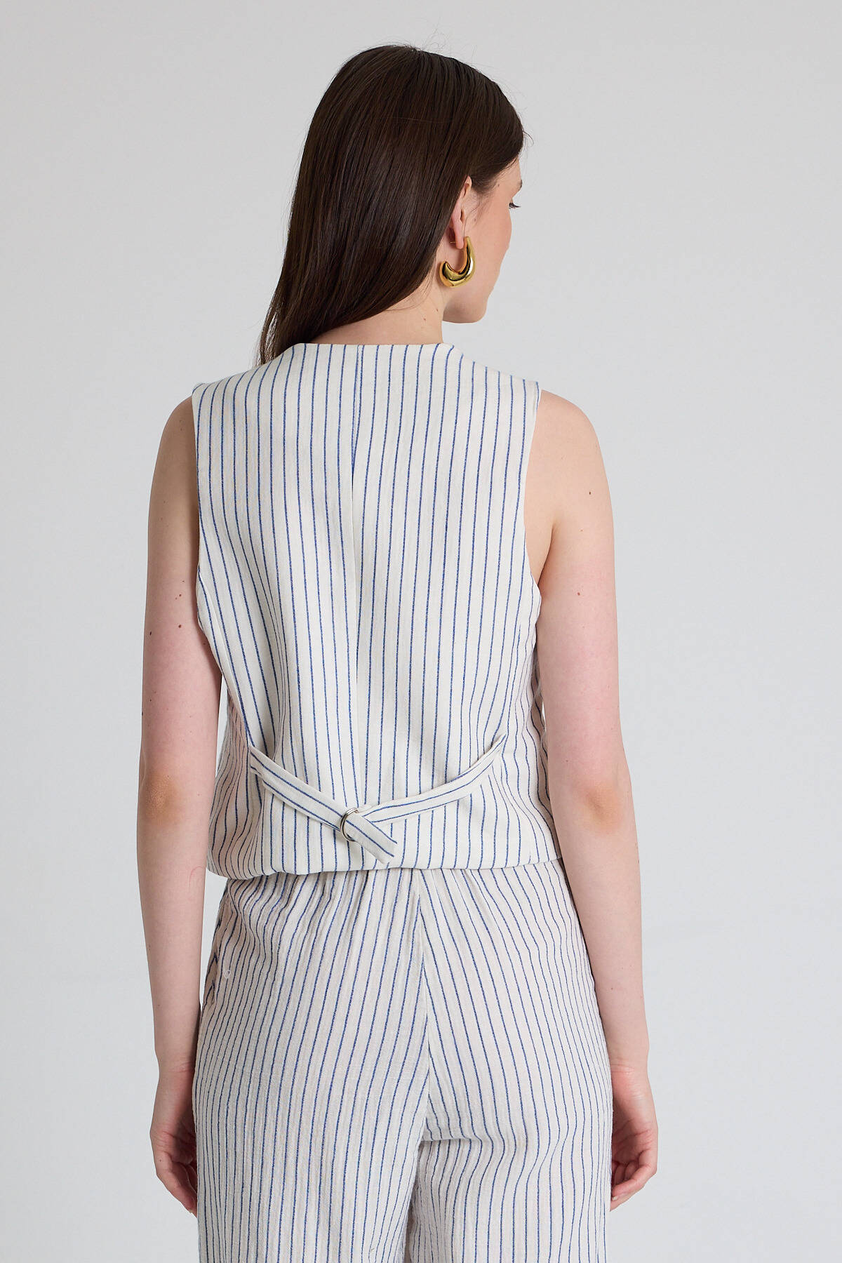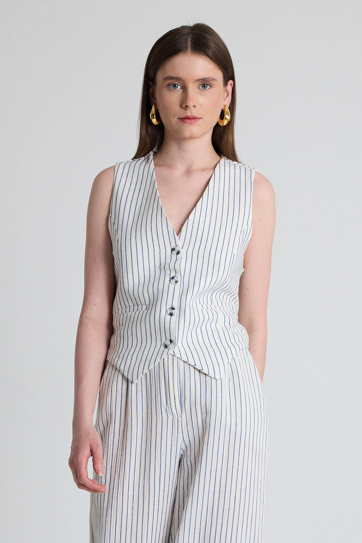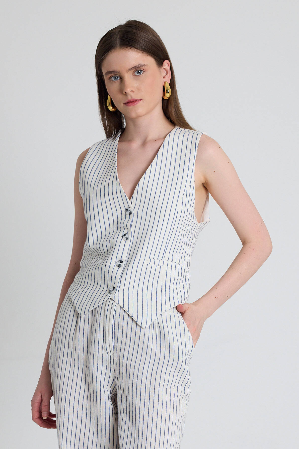 Mavi Keten Görünümlü %100 Pamuk Çizgili Yelek 2323