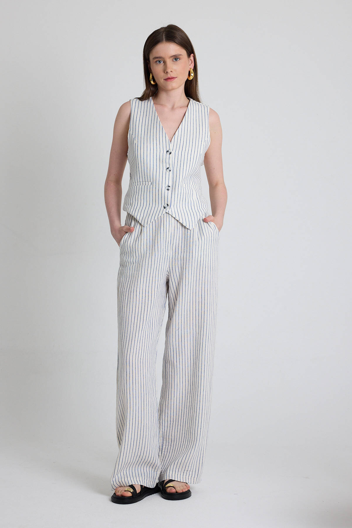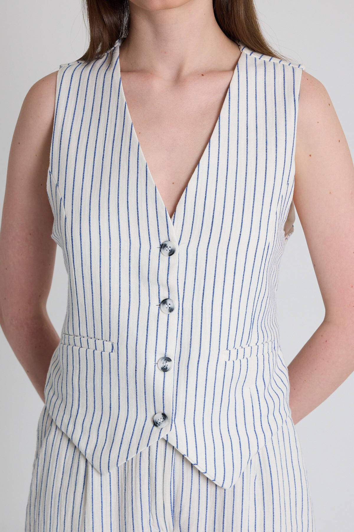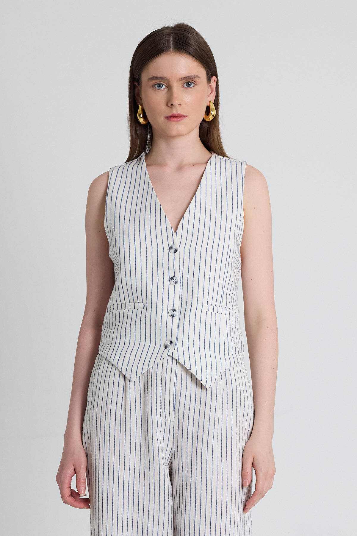 Mavi Keten Görünümlü %100 Pamuk Çizgili Yelek 2323