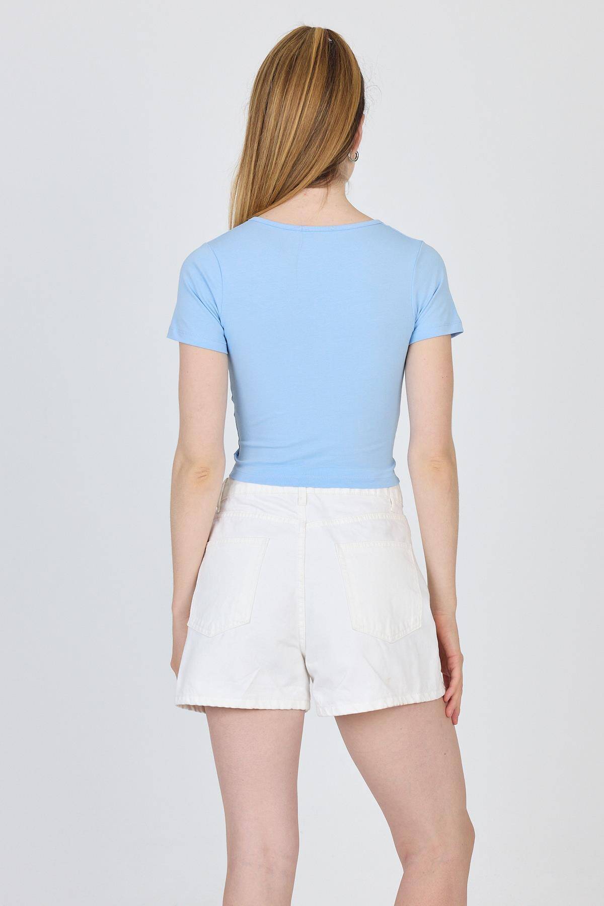 Mavi V Yaka Büzgülü Crop Tişört 9201M