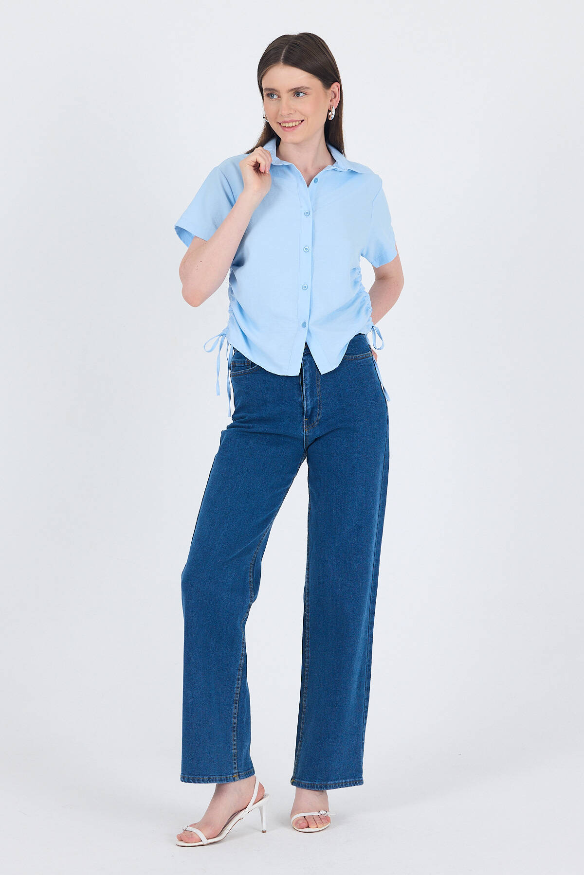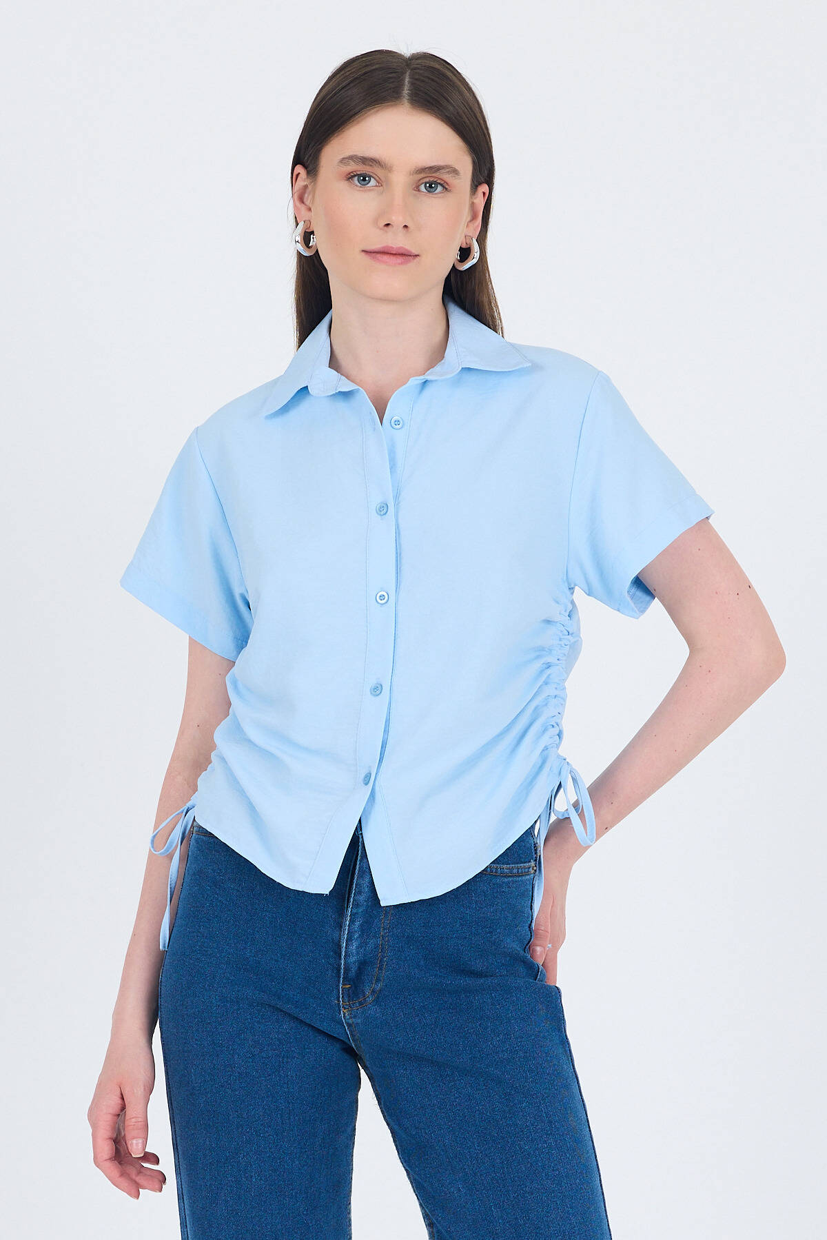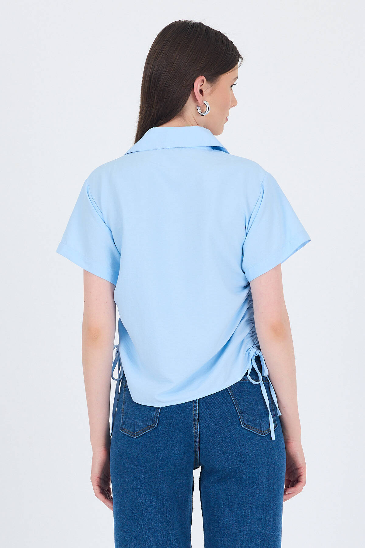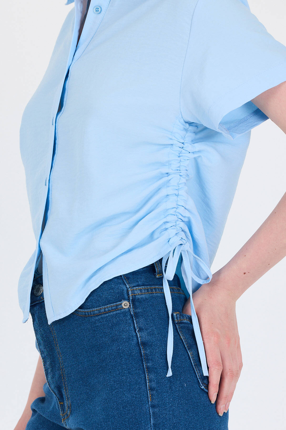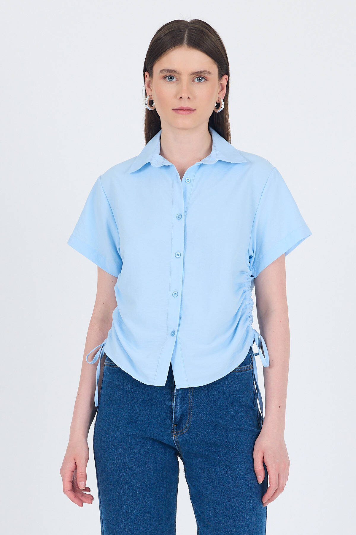 Mavi Yanları Büzgülü Bağcıklı Kısa Kollu Gömlek 4368A