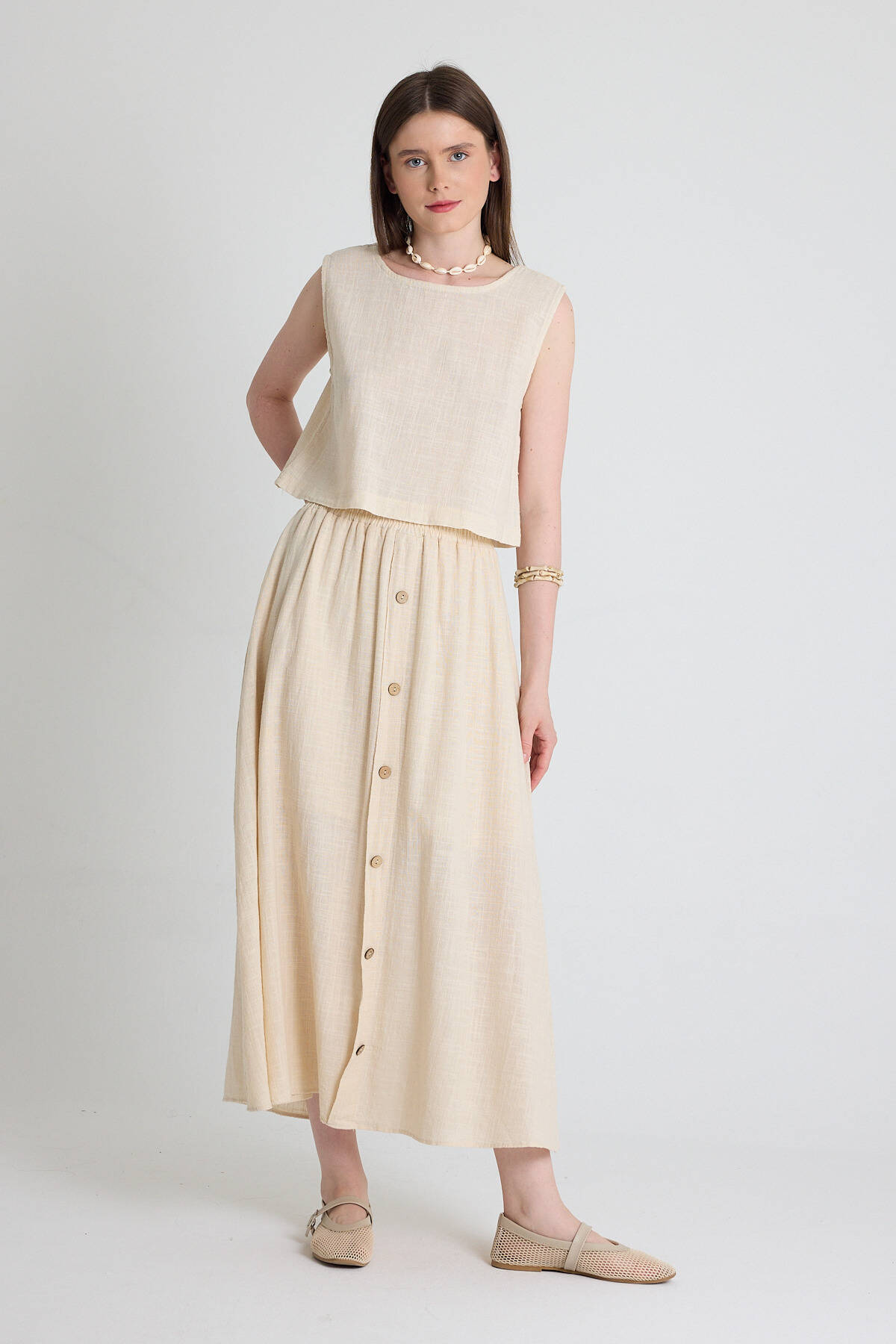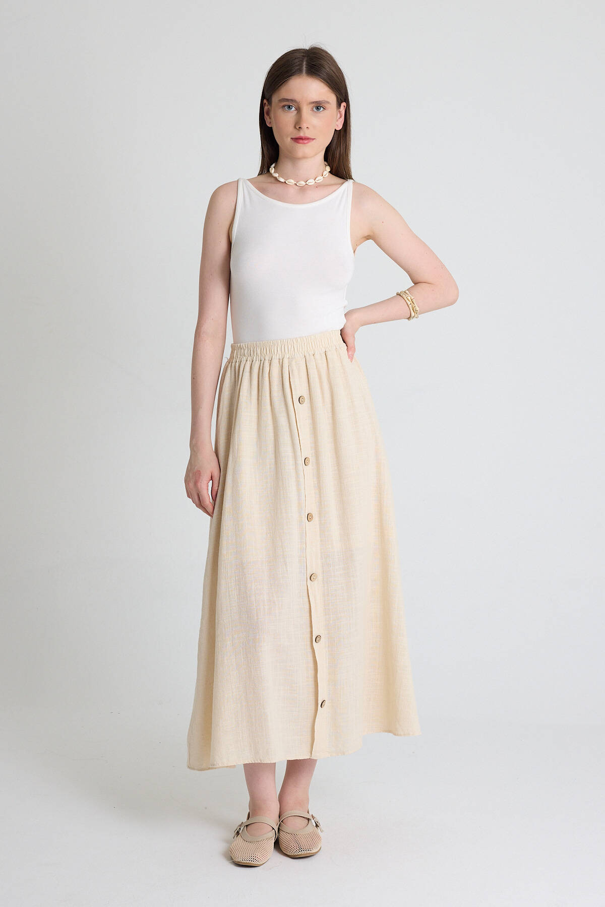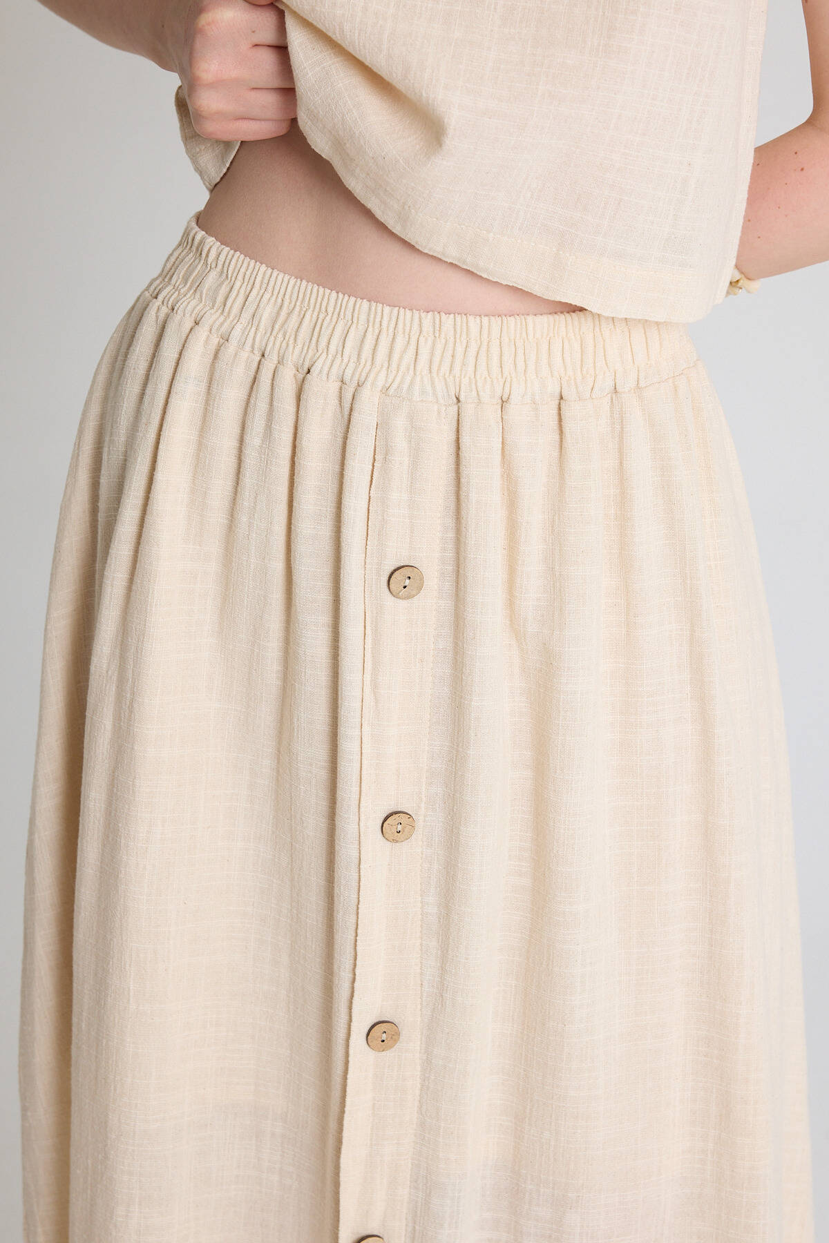Natural Keten Görünümlü %100 Pamuk Düğmeli Midi Etek 3419
