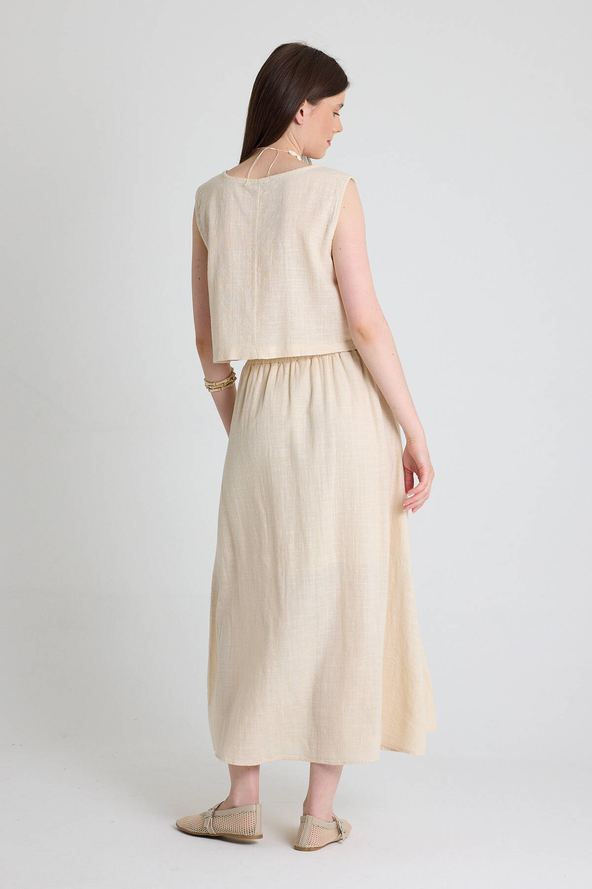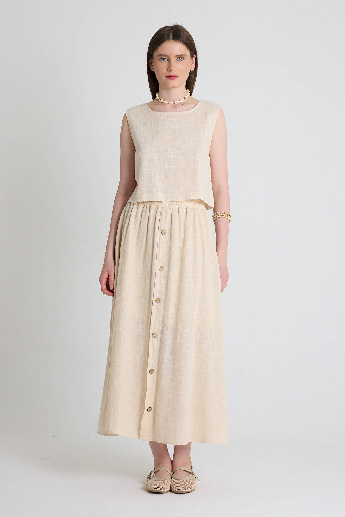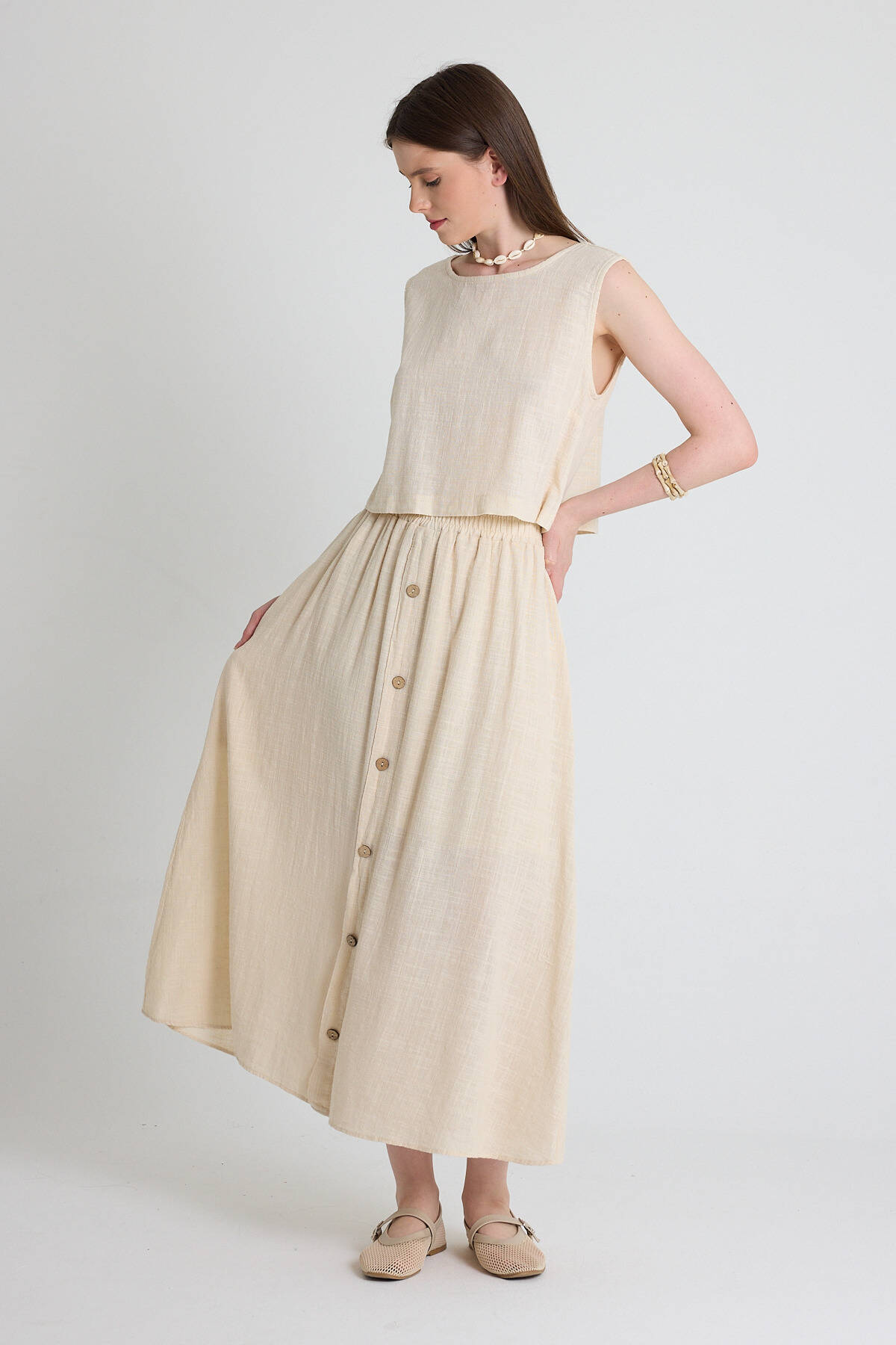 Natural Keten Görünümlü %100 Pamuk Düğmeli Midi Etek 3419