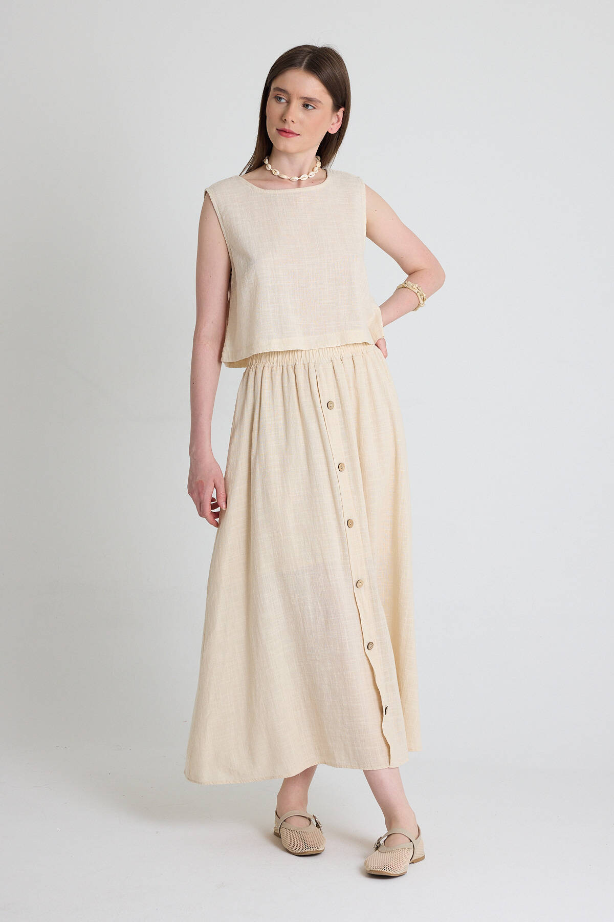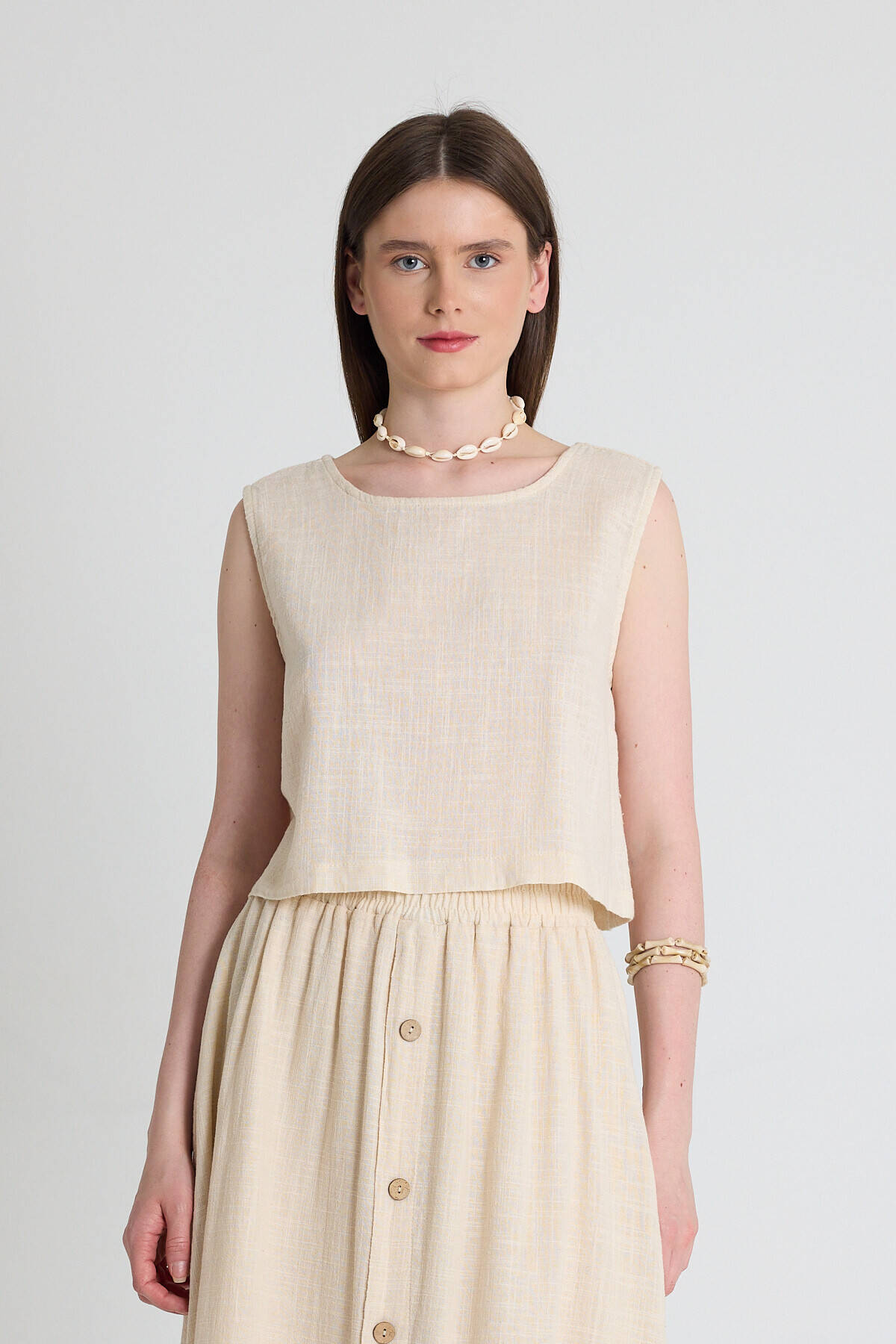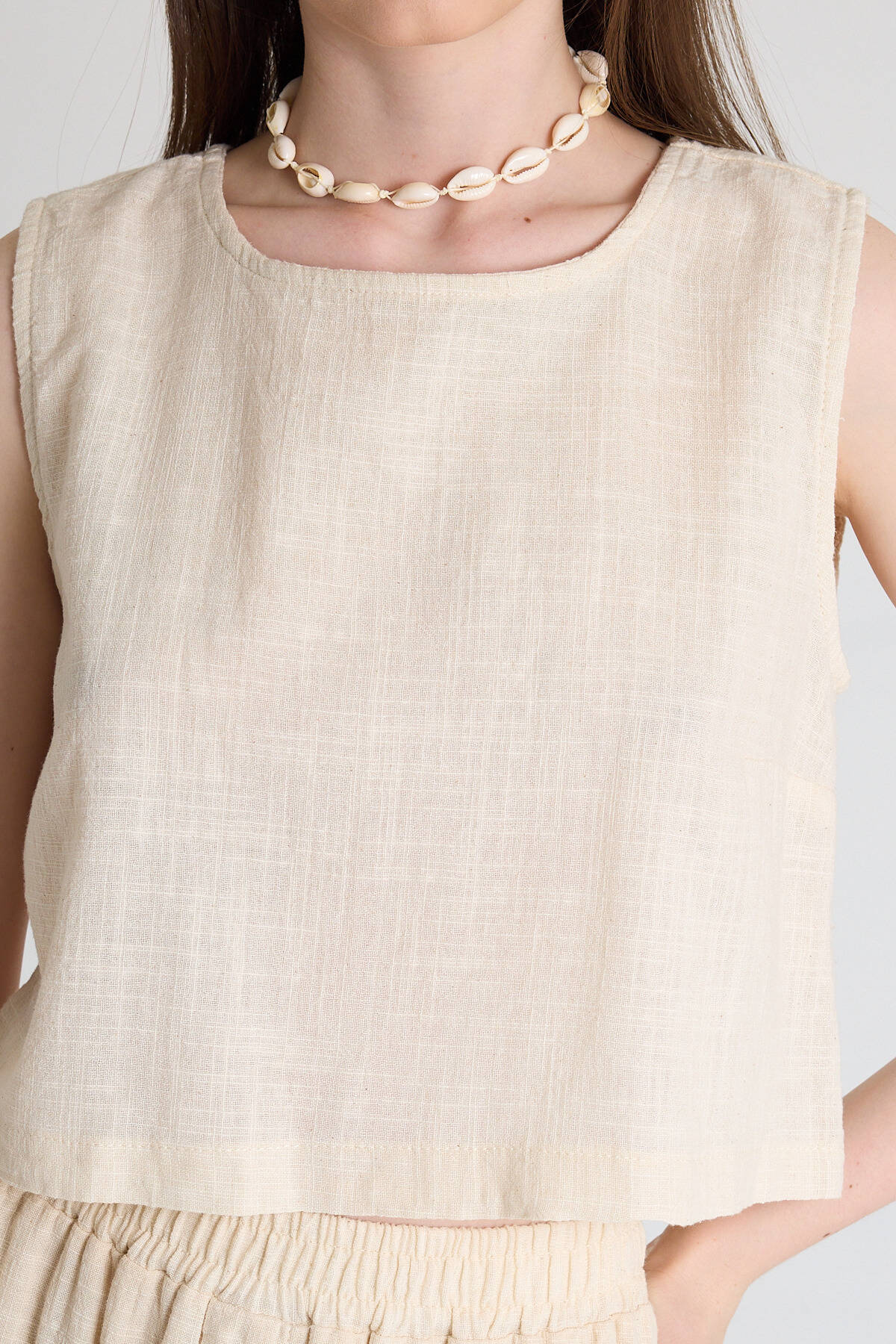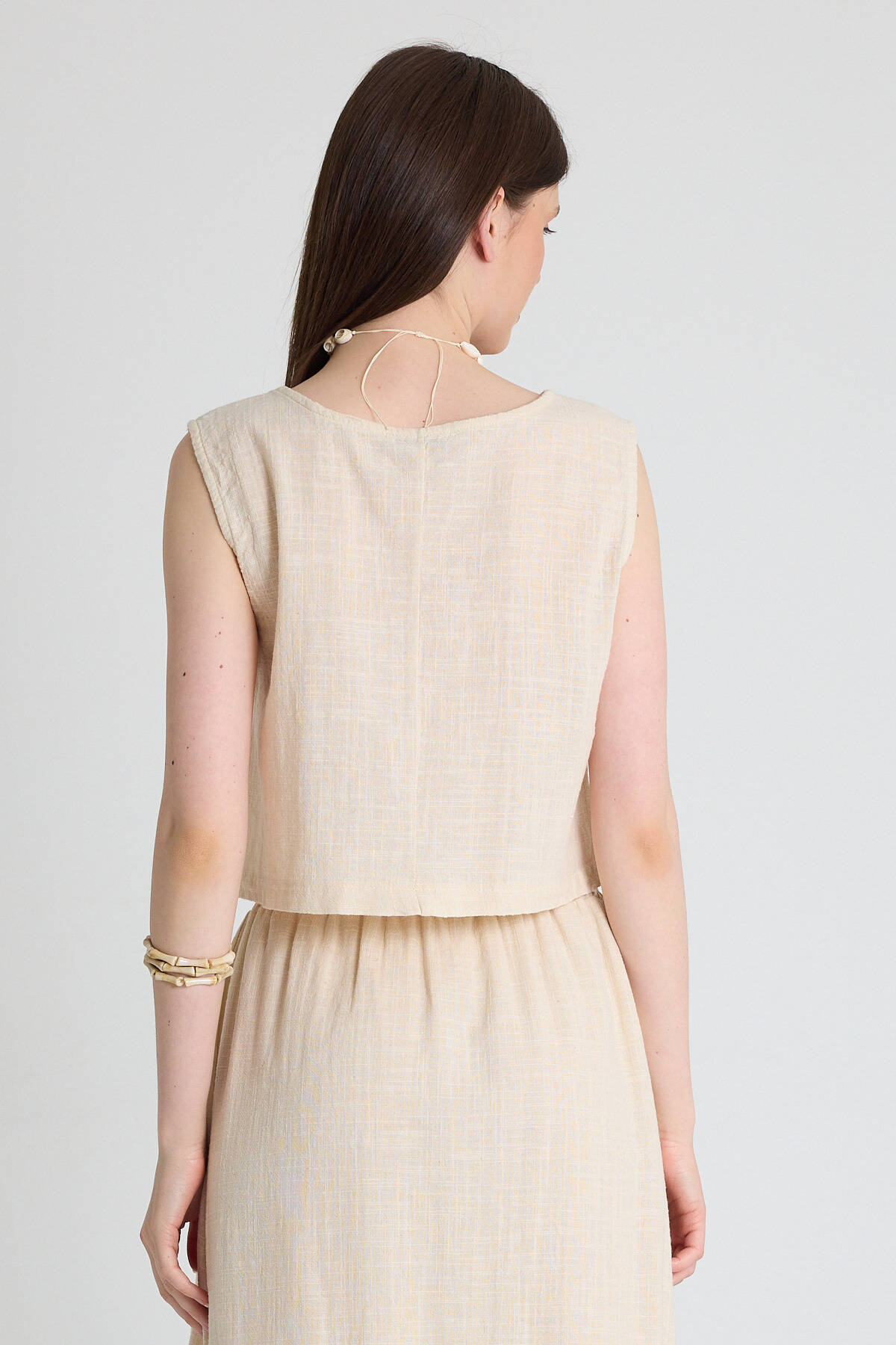 Natural Keten Görünümlü %100 Pamuk Kolsuz Crop Bluz 3419-1