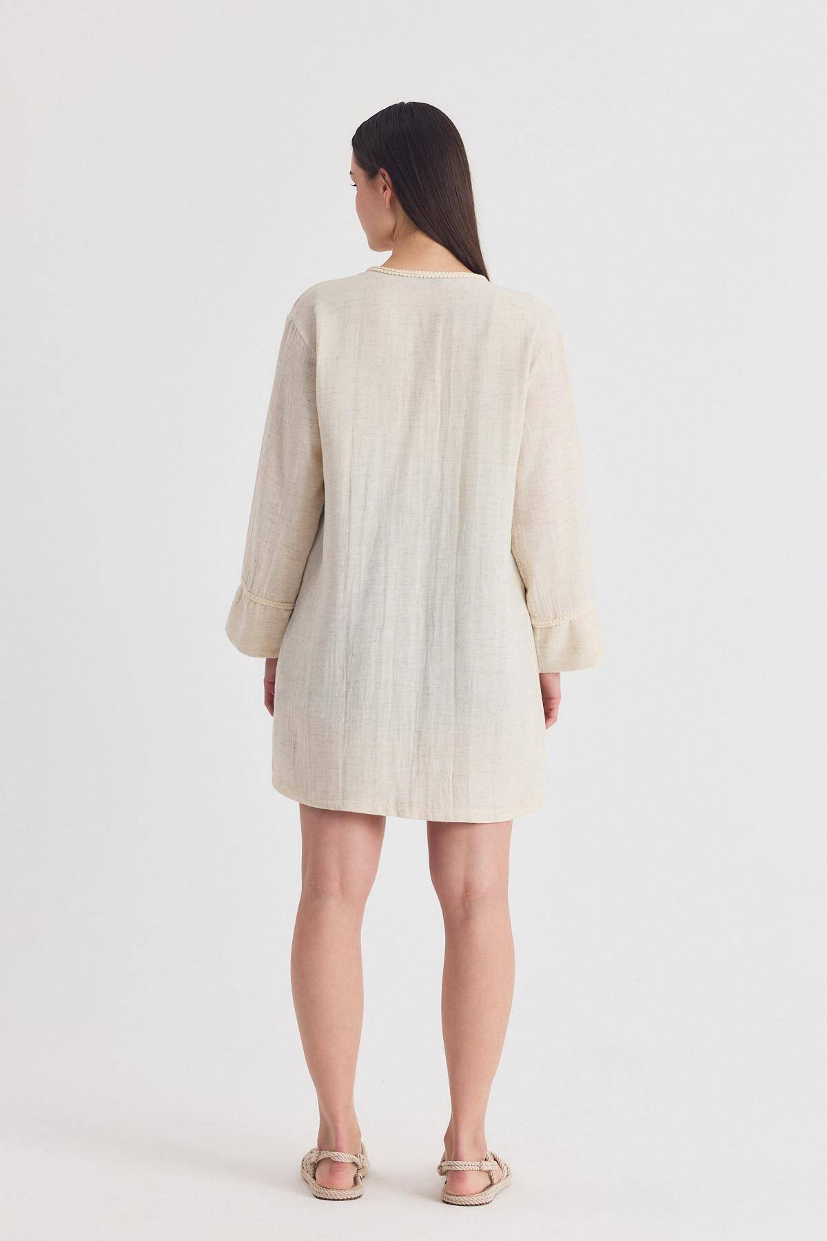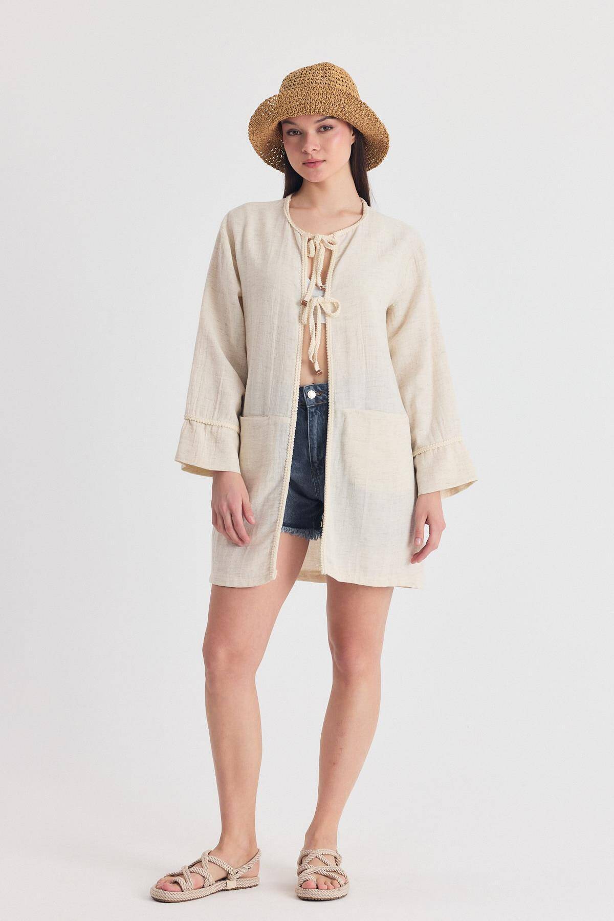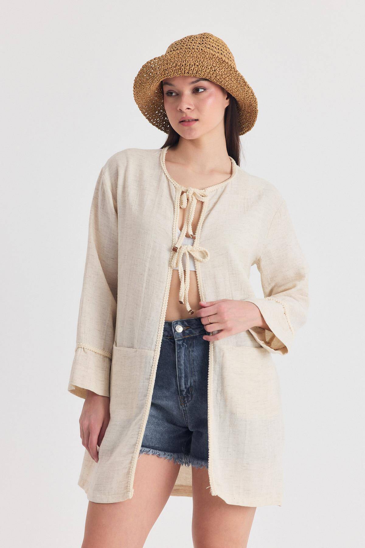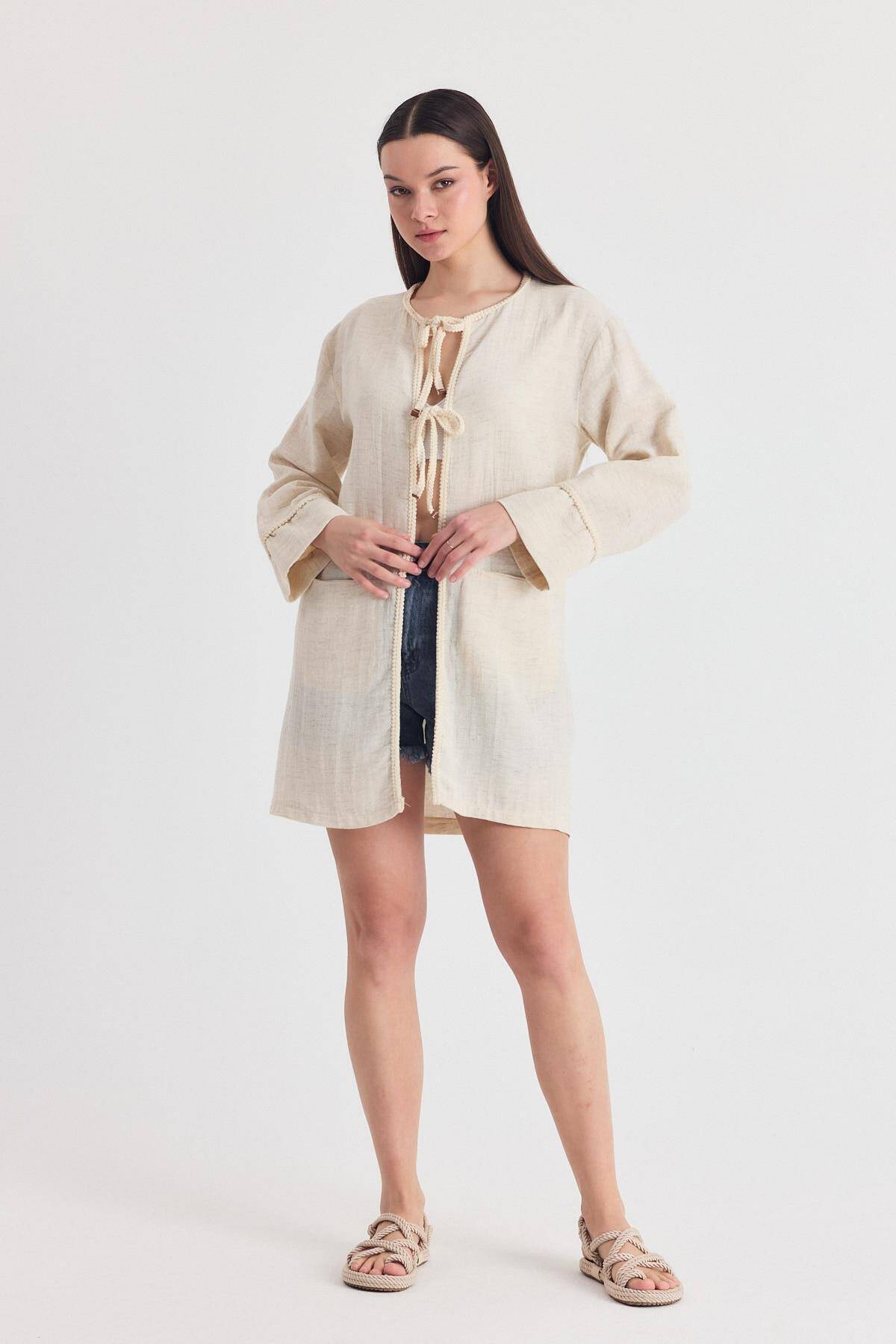 Natural Yaka Örgü Trim Detaylı Bağcıklı Kimono 4411A