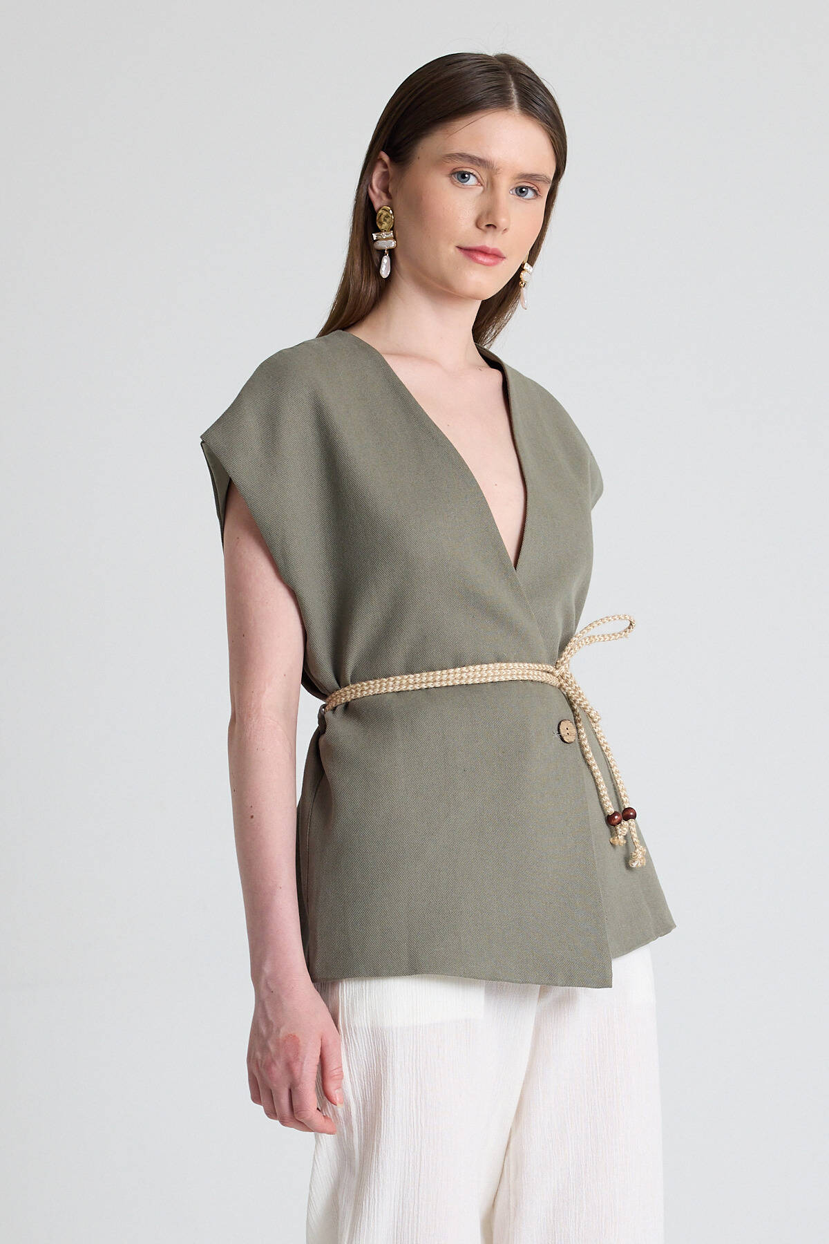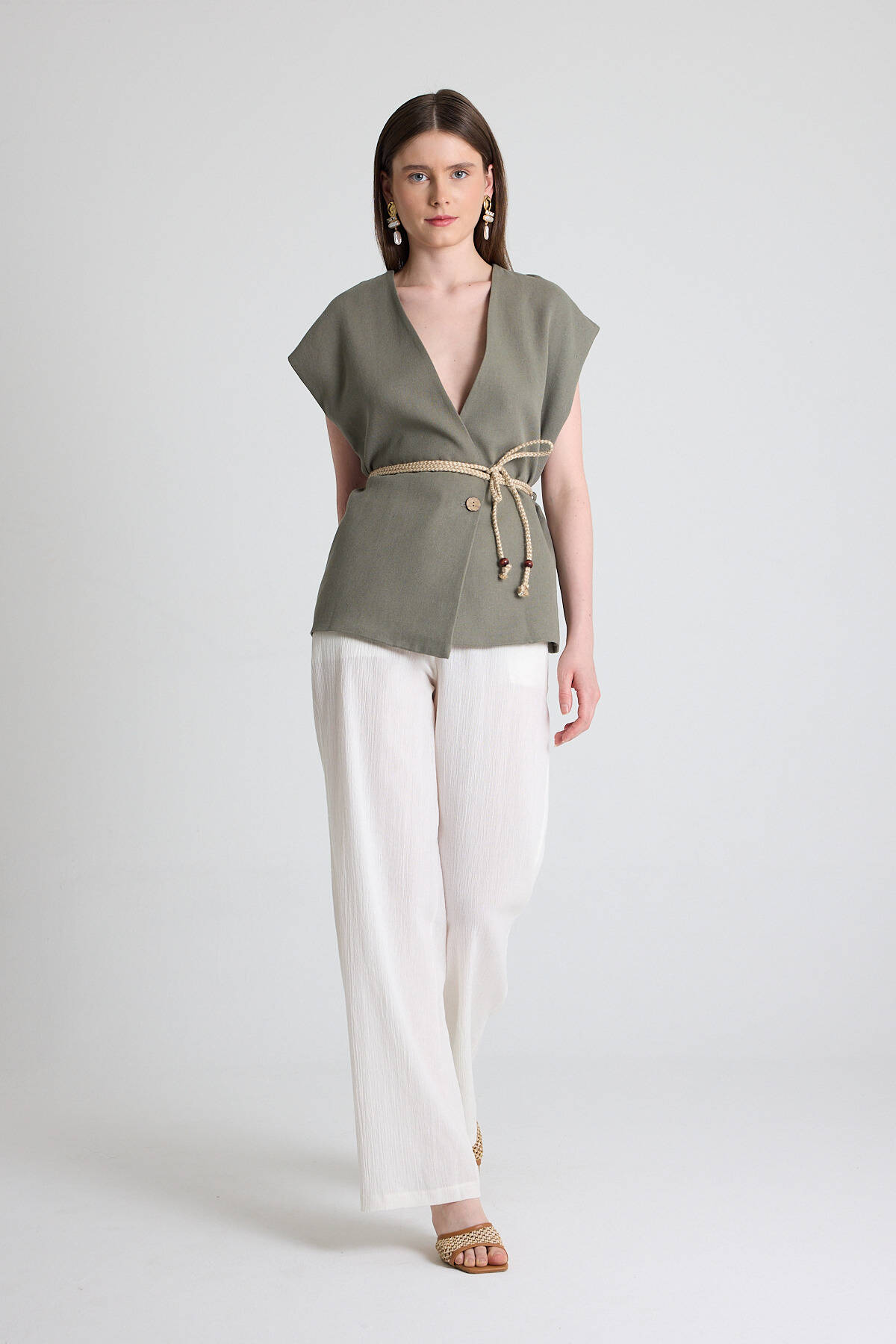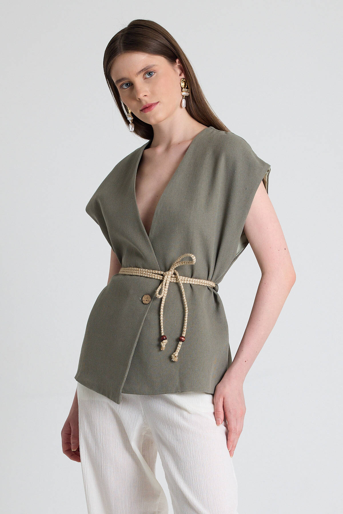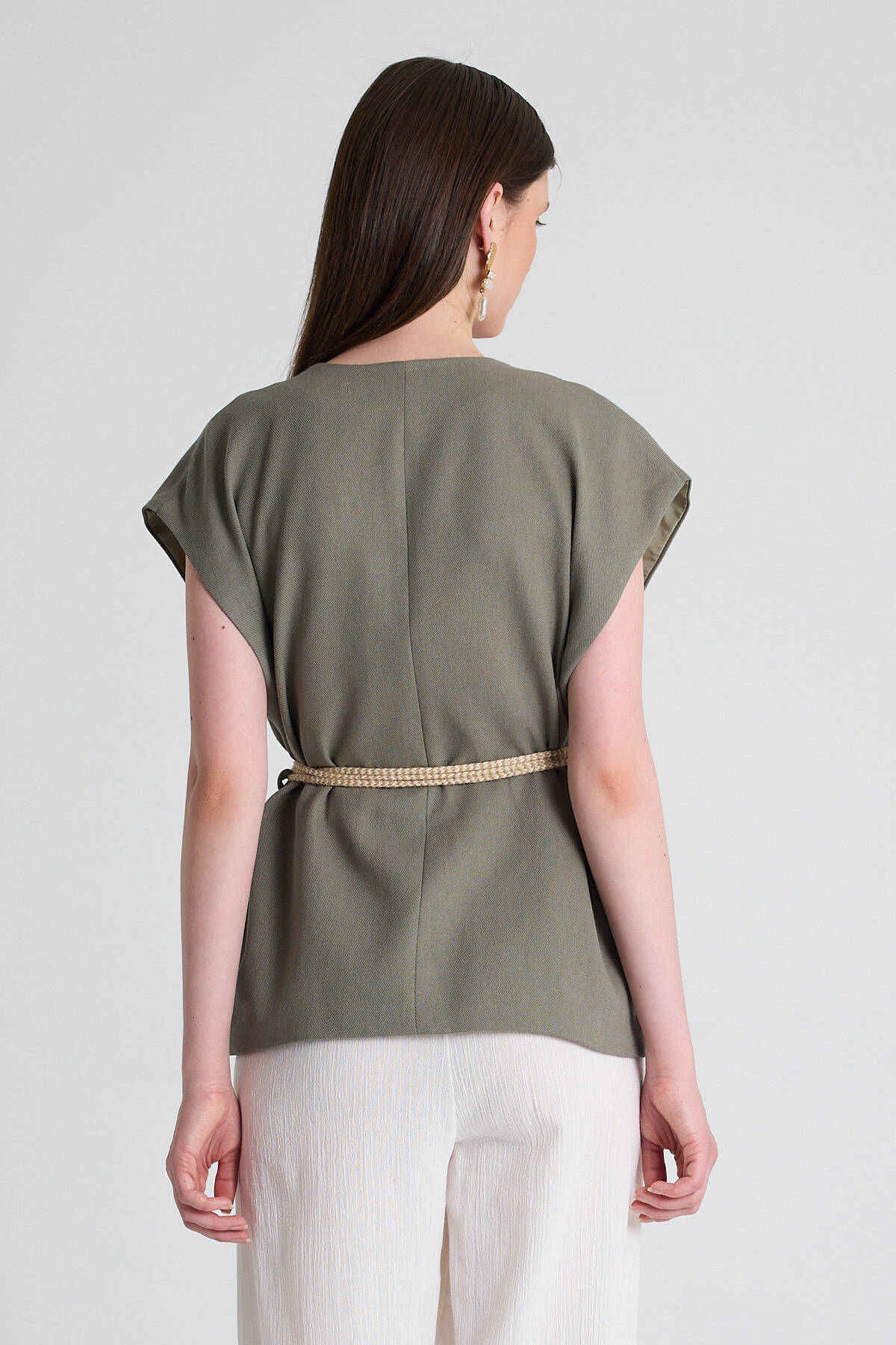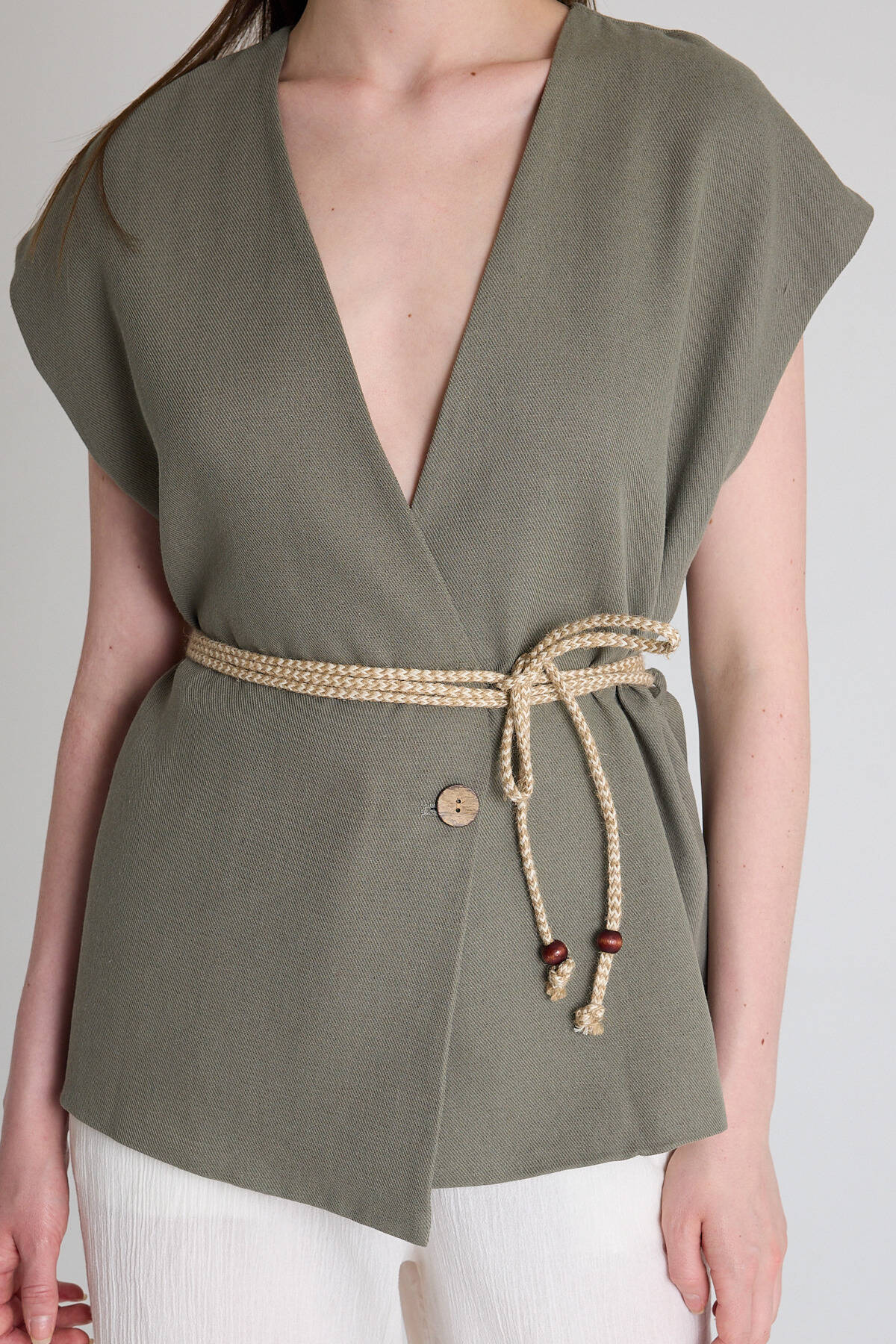 Olive Yeşili Hasır Kemerli V Yaka Kısa Kollu Ceket Yelek 2378