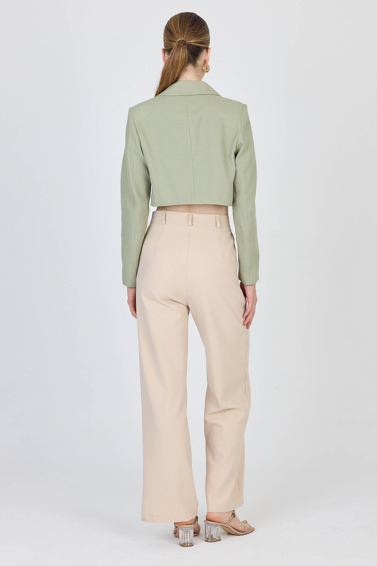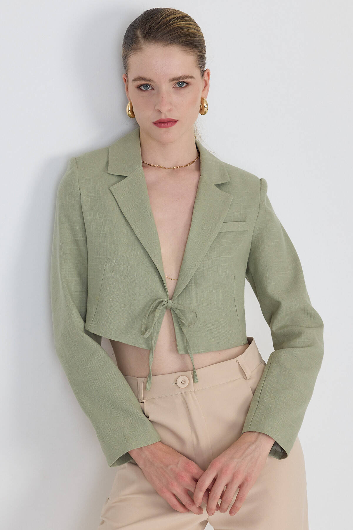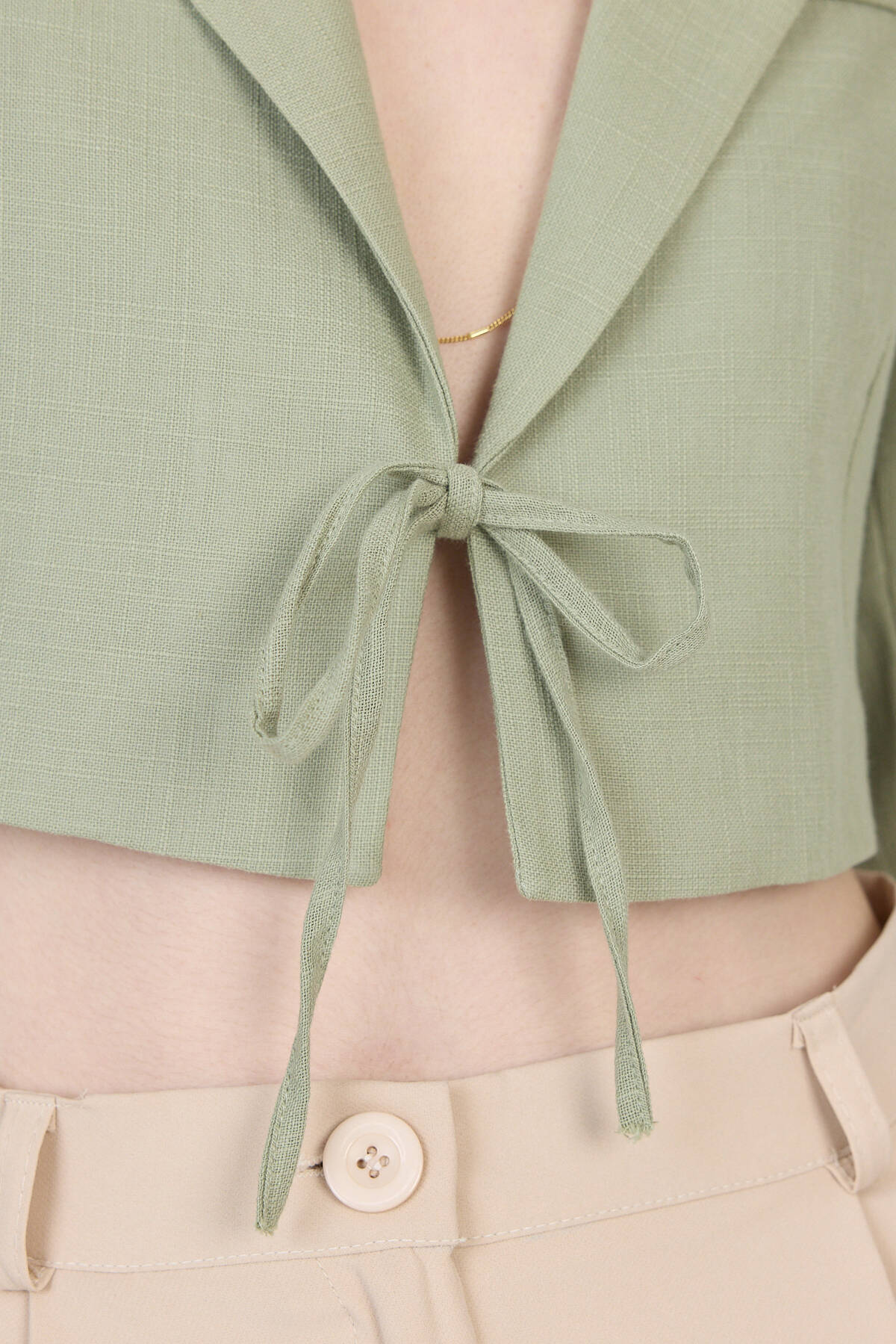 Olive Yeşili Keten Görünümlü %100 Pamuk Bağlama Detaylı Crop Blazer Ceket 7070