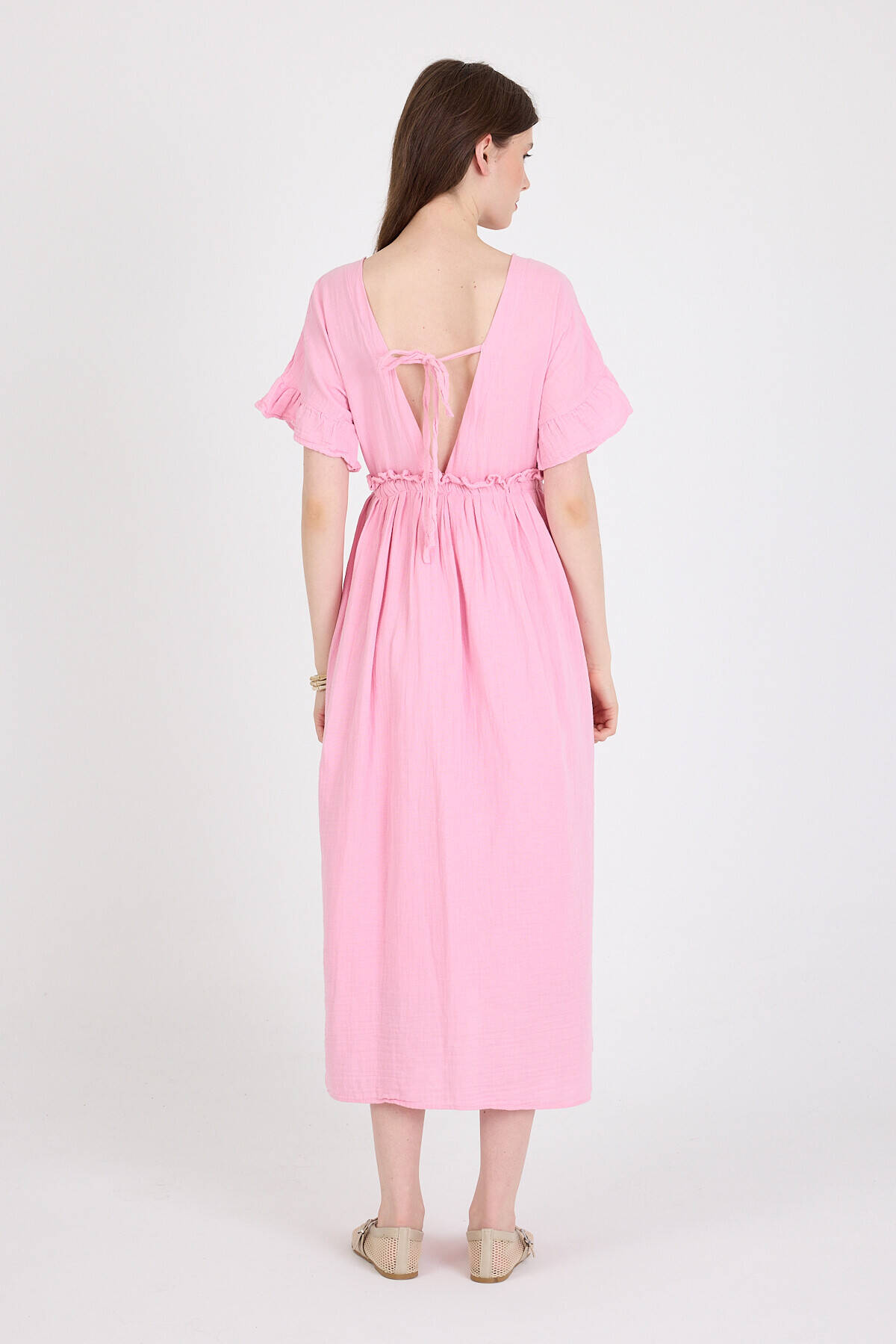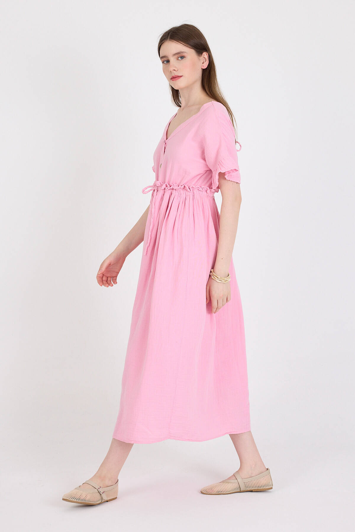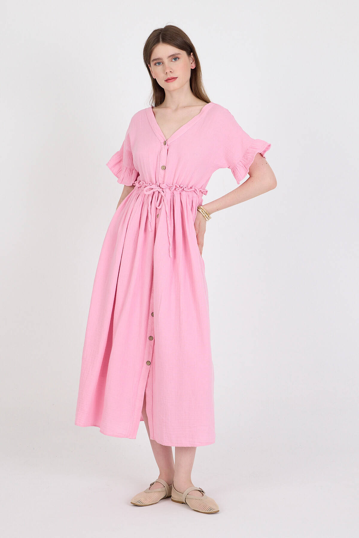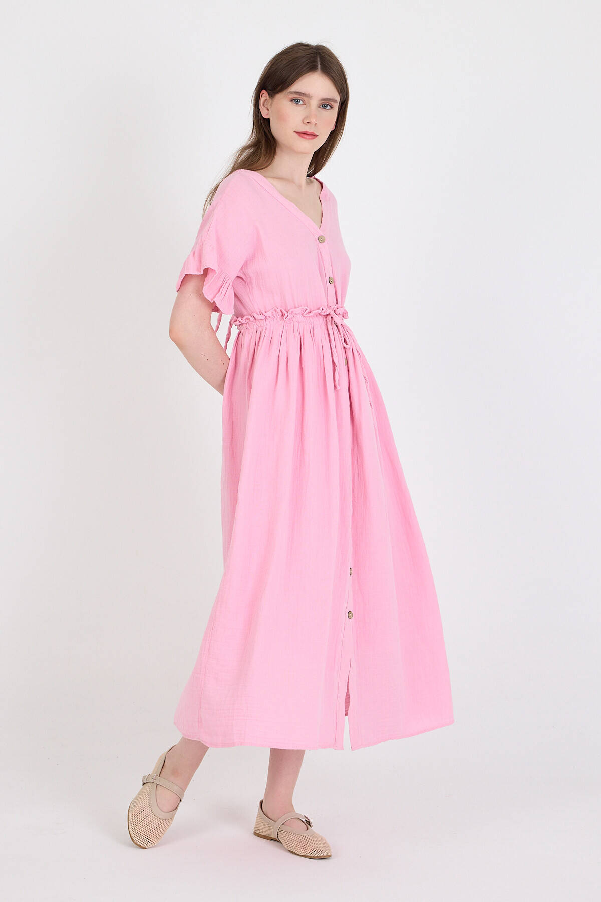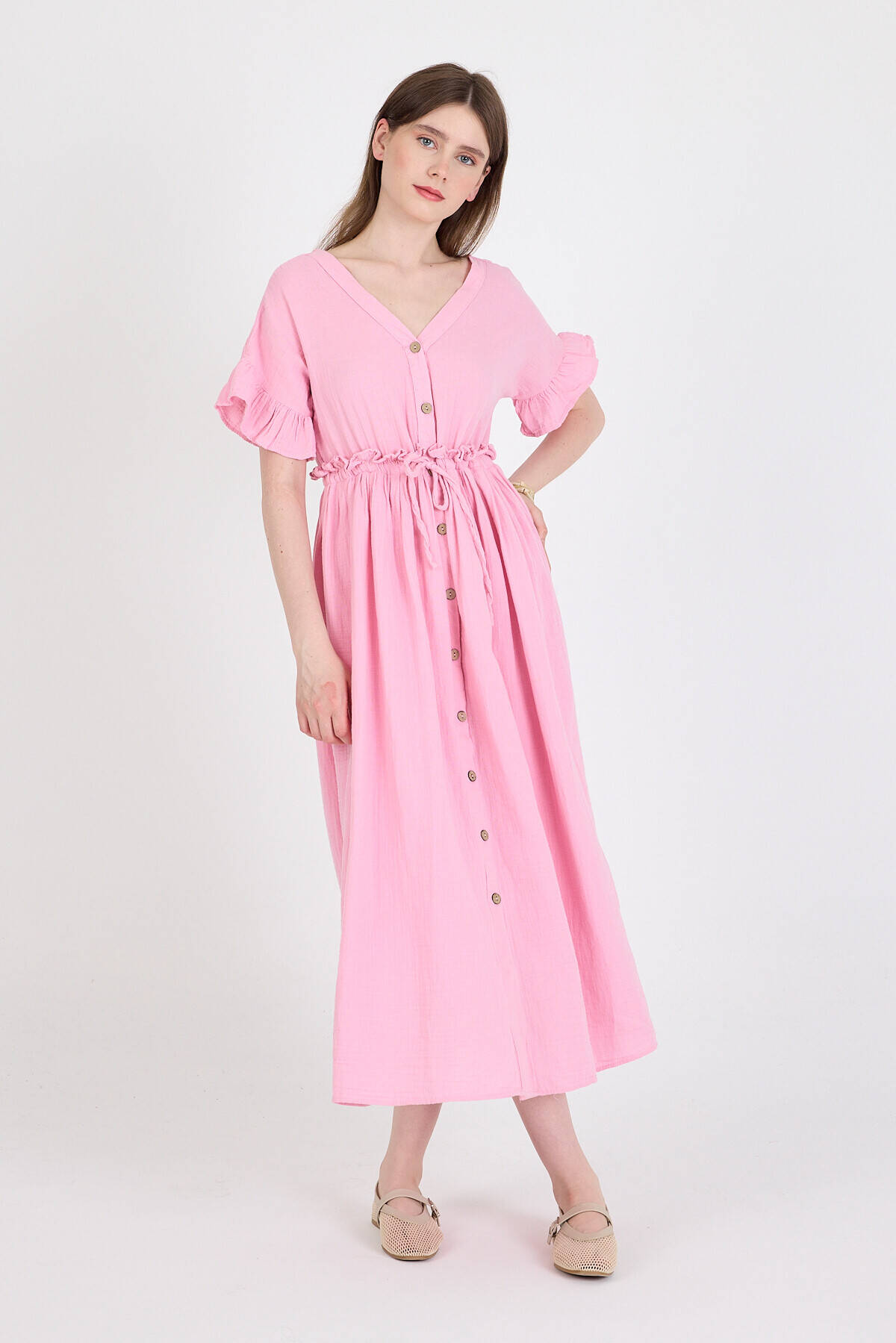 Pembe %100 Pamuk Fırfır Kol Detaylı Düğmeli Elbise 4781A