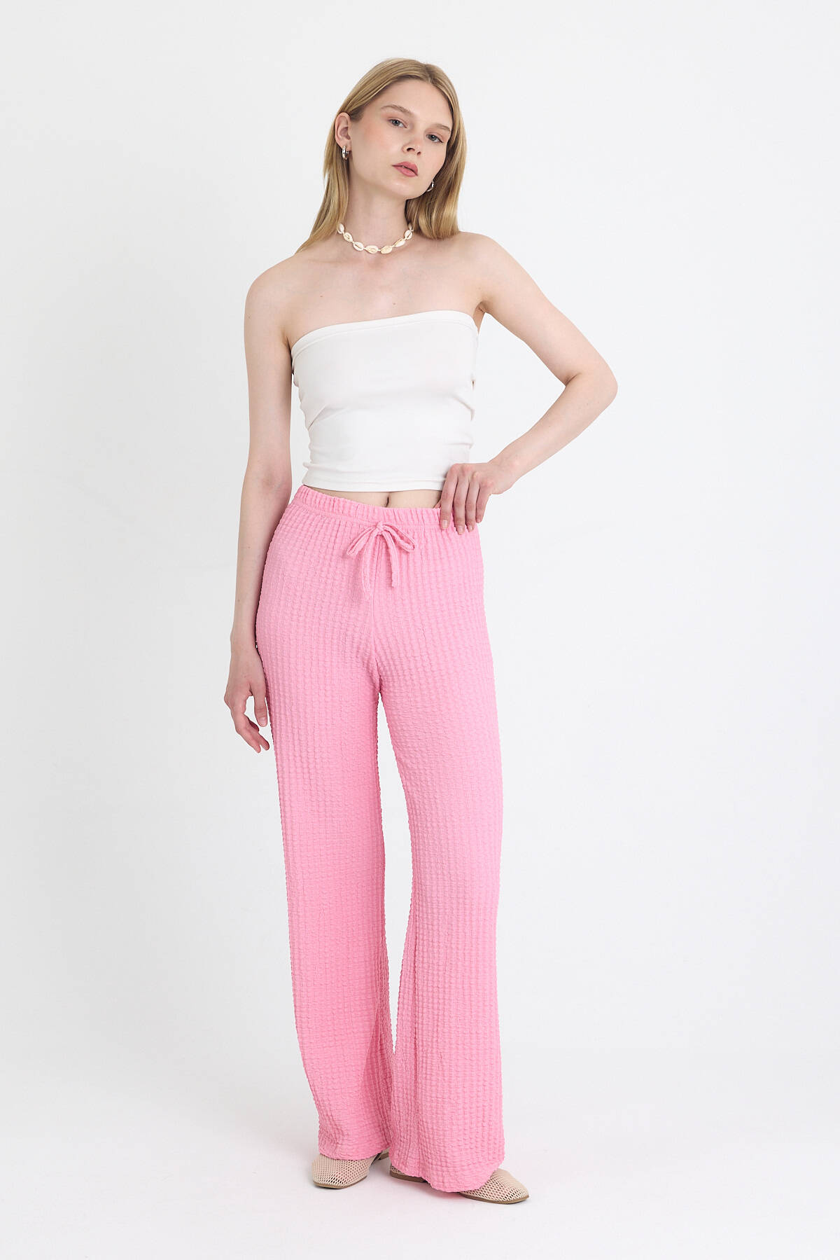 Pembe Geniş Paça Dökümlü Bürümcük Kumaş Pantolon 326