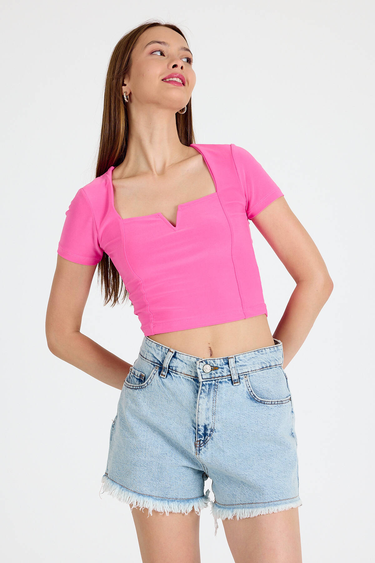 Pembe Kare Yaka V Kesim Detaylı Crop Bluz 10432