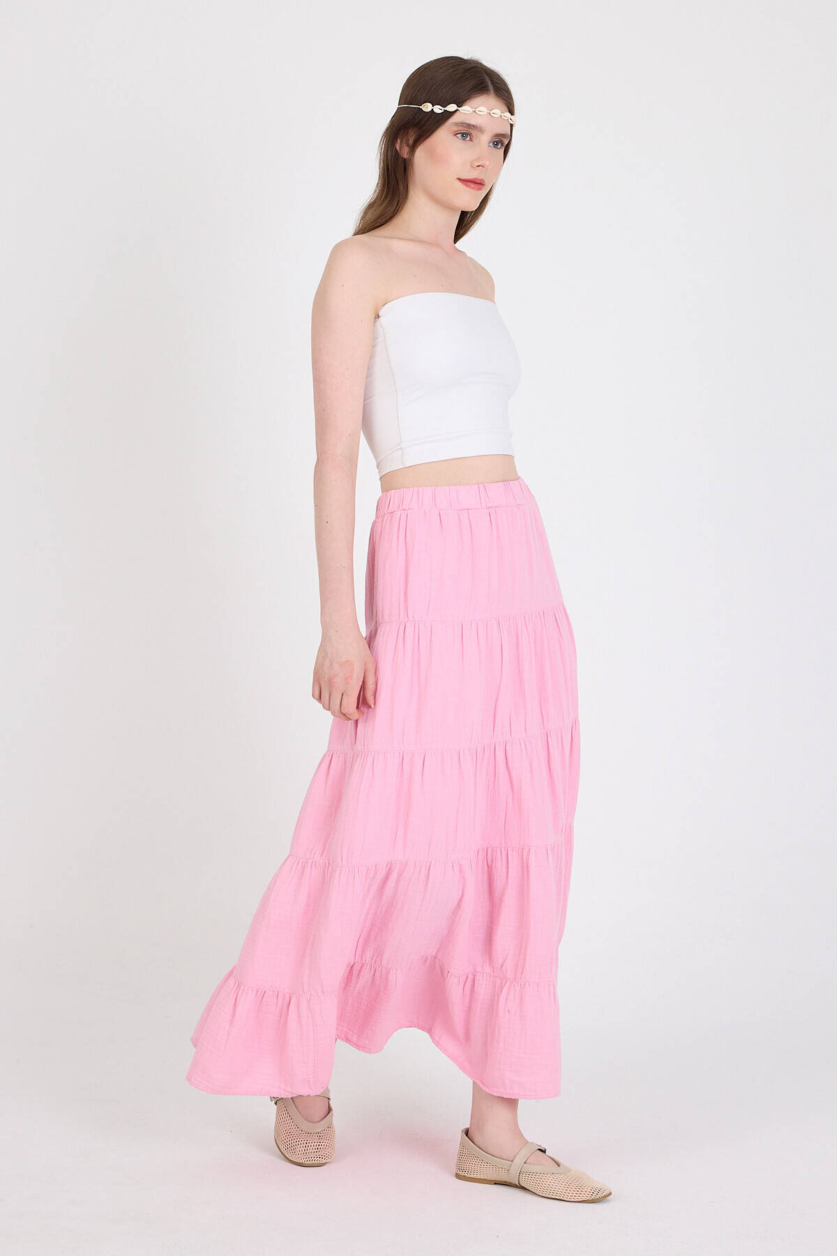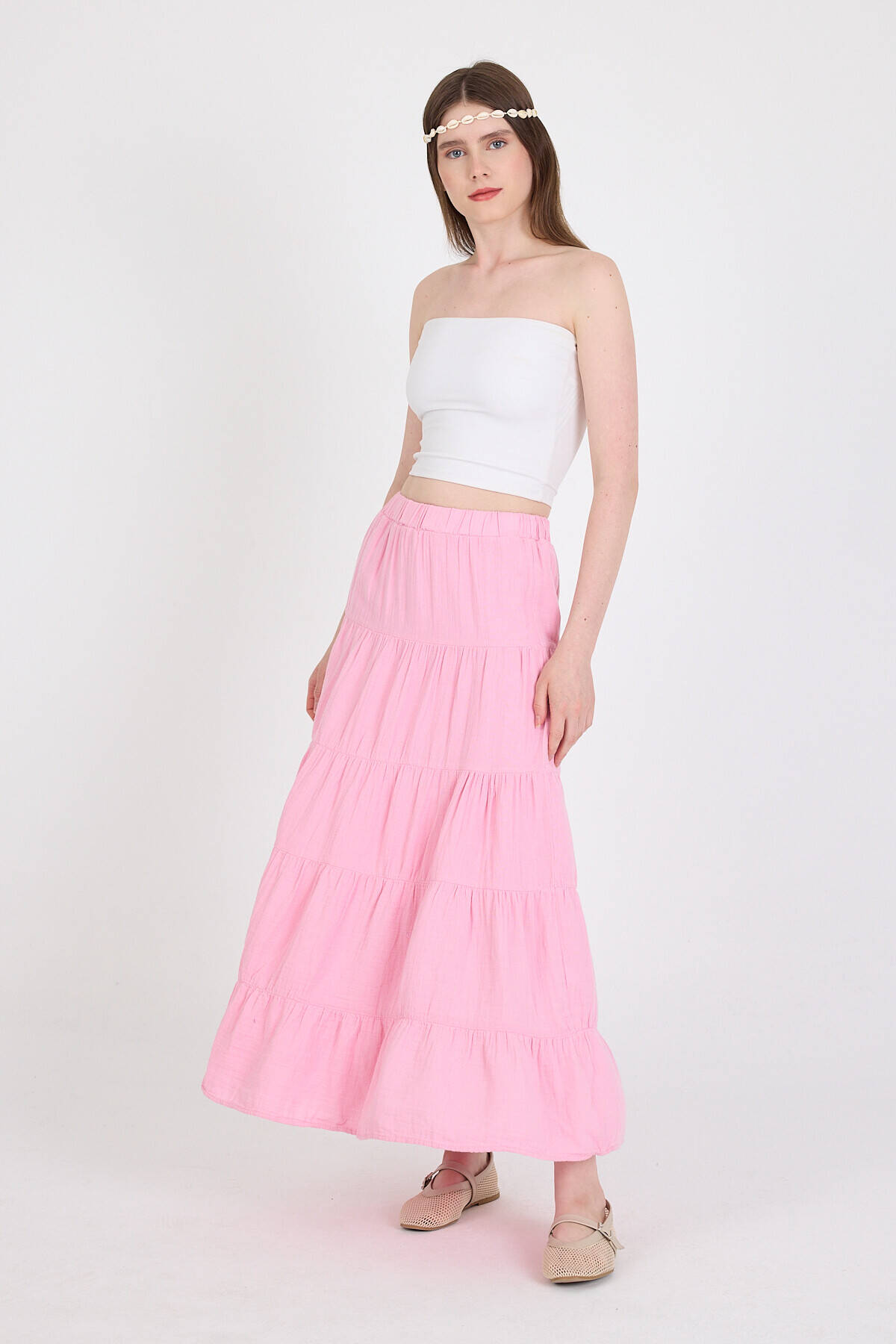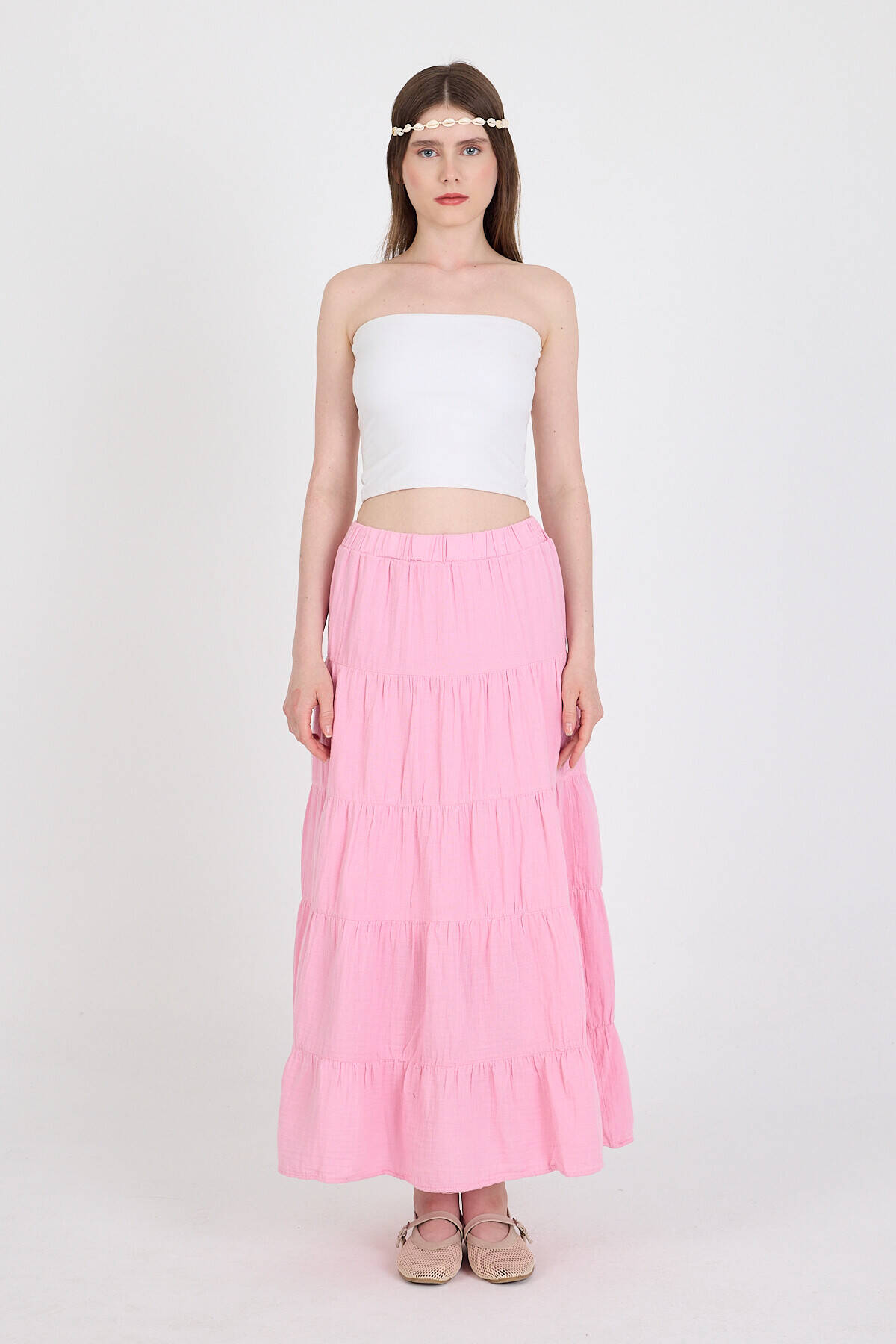 Pembe Keten Görünümlü %100 Pamuk Kat Kat Uzun Etek 4801A
