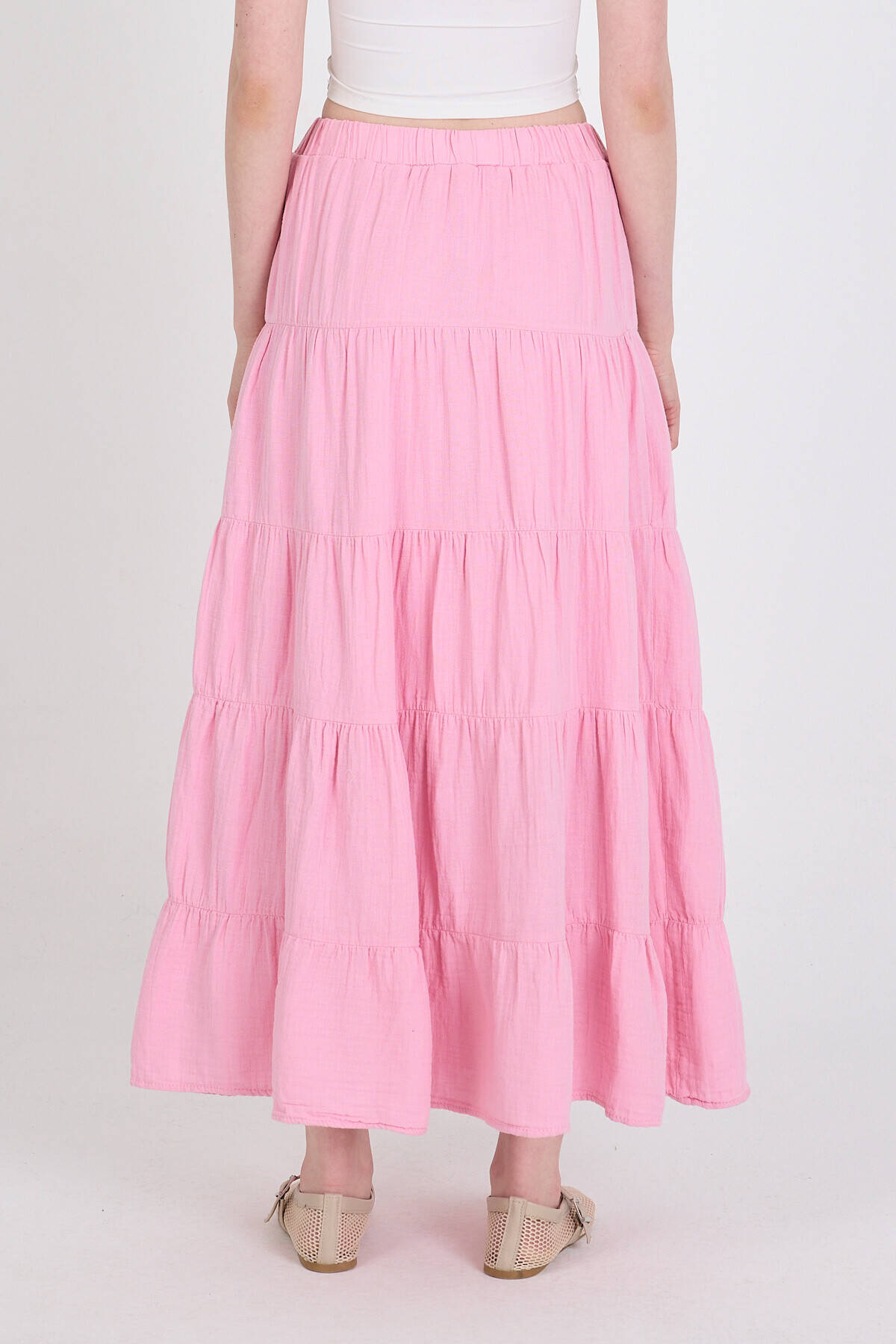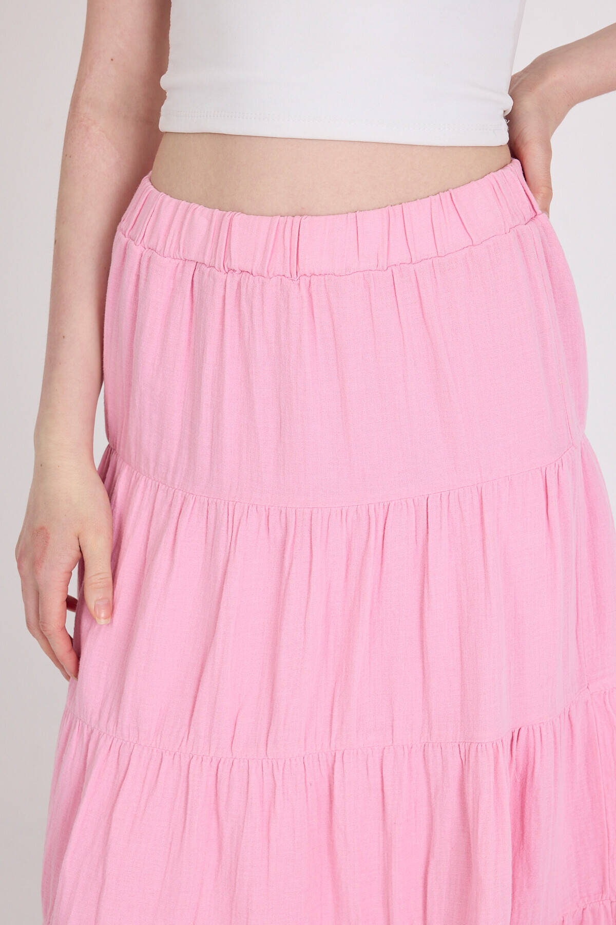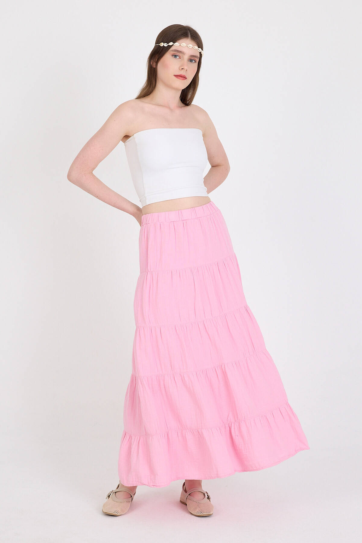 Pembe Keten Görünümlü %100 Pamuk Kat Kat Uzun Etek 4801A