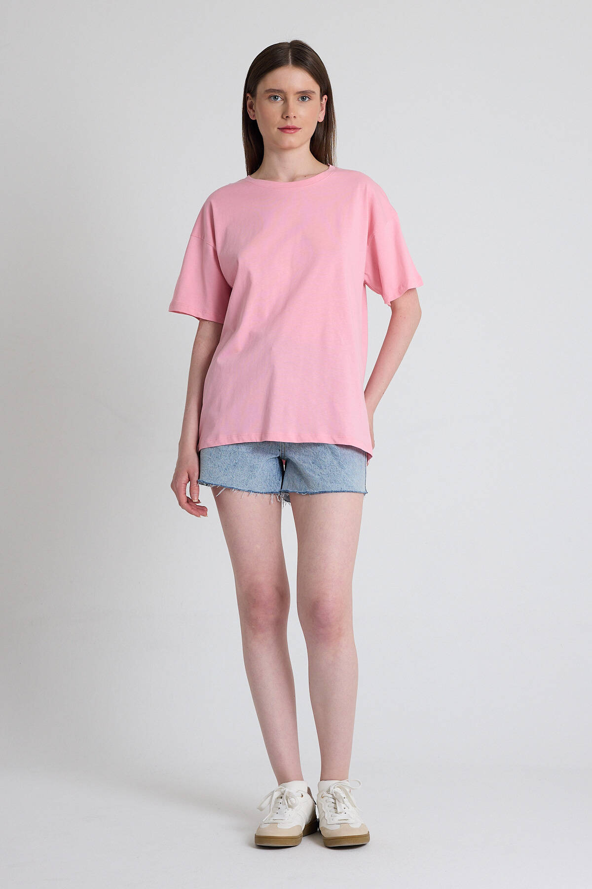 Pembe Omuz Yazı Baskılı %100 Pamuk Oversize Tişört 2150-30M