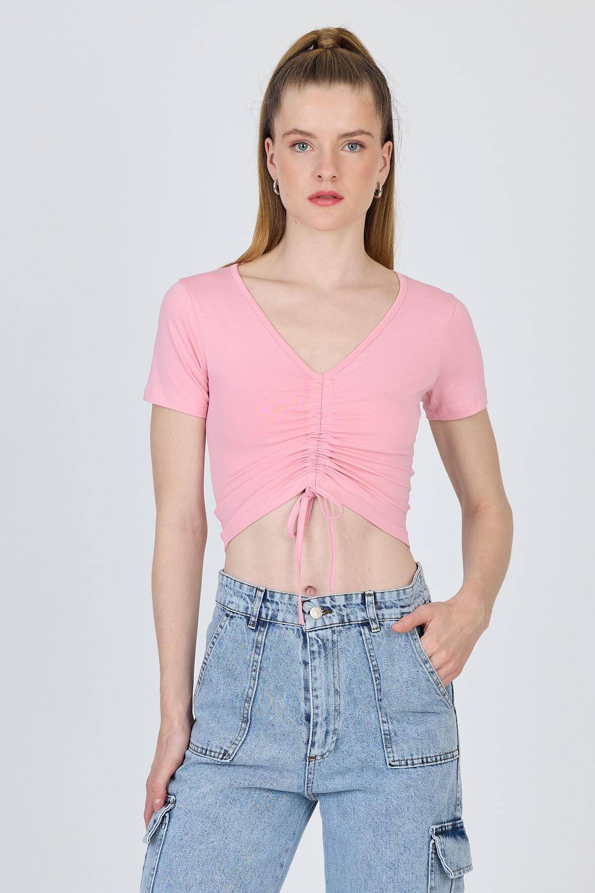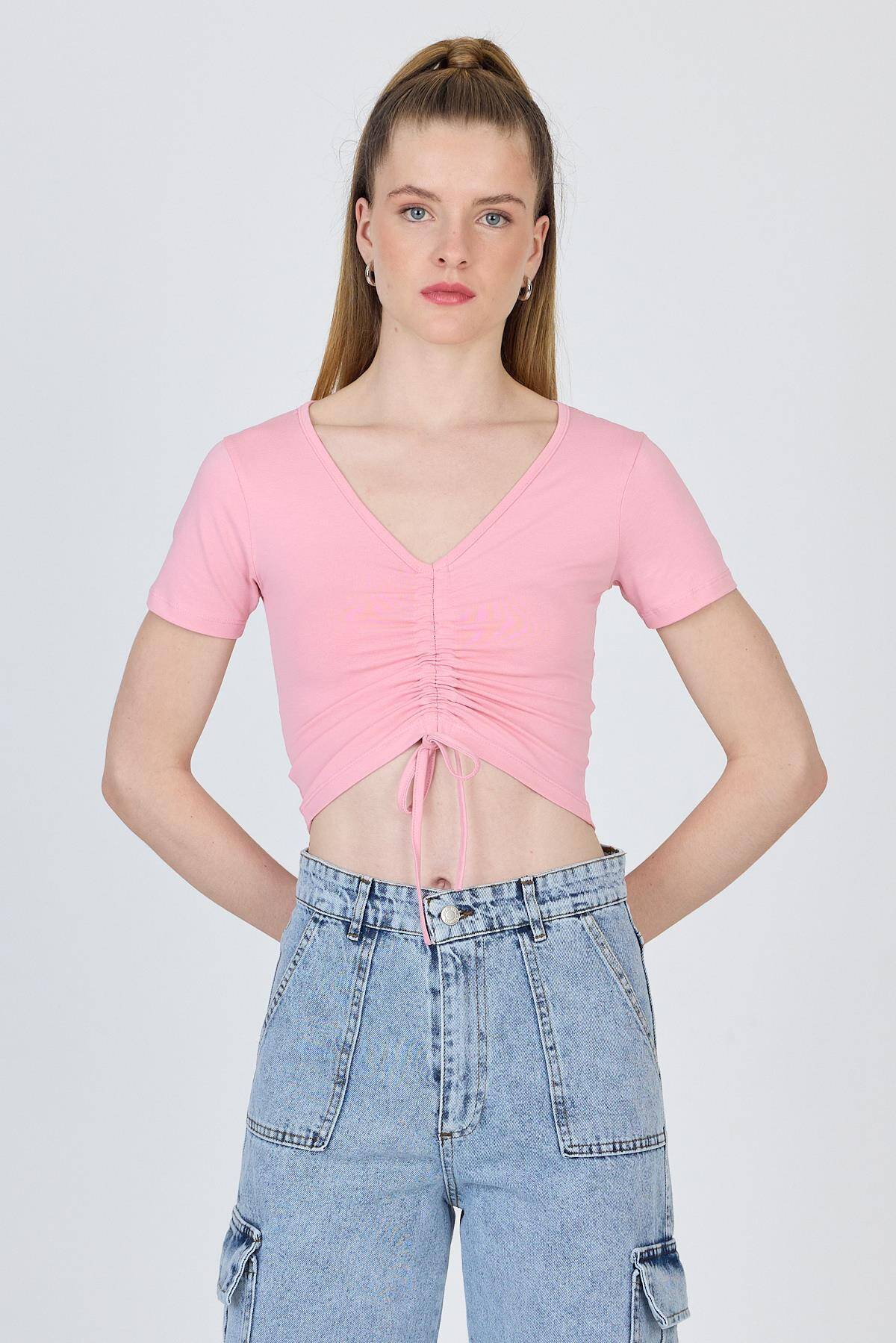 Pembe V Yaka Büzgülü Crop Tişört 9201M