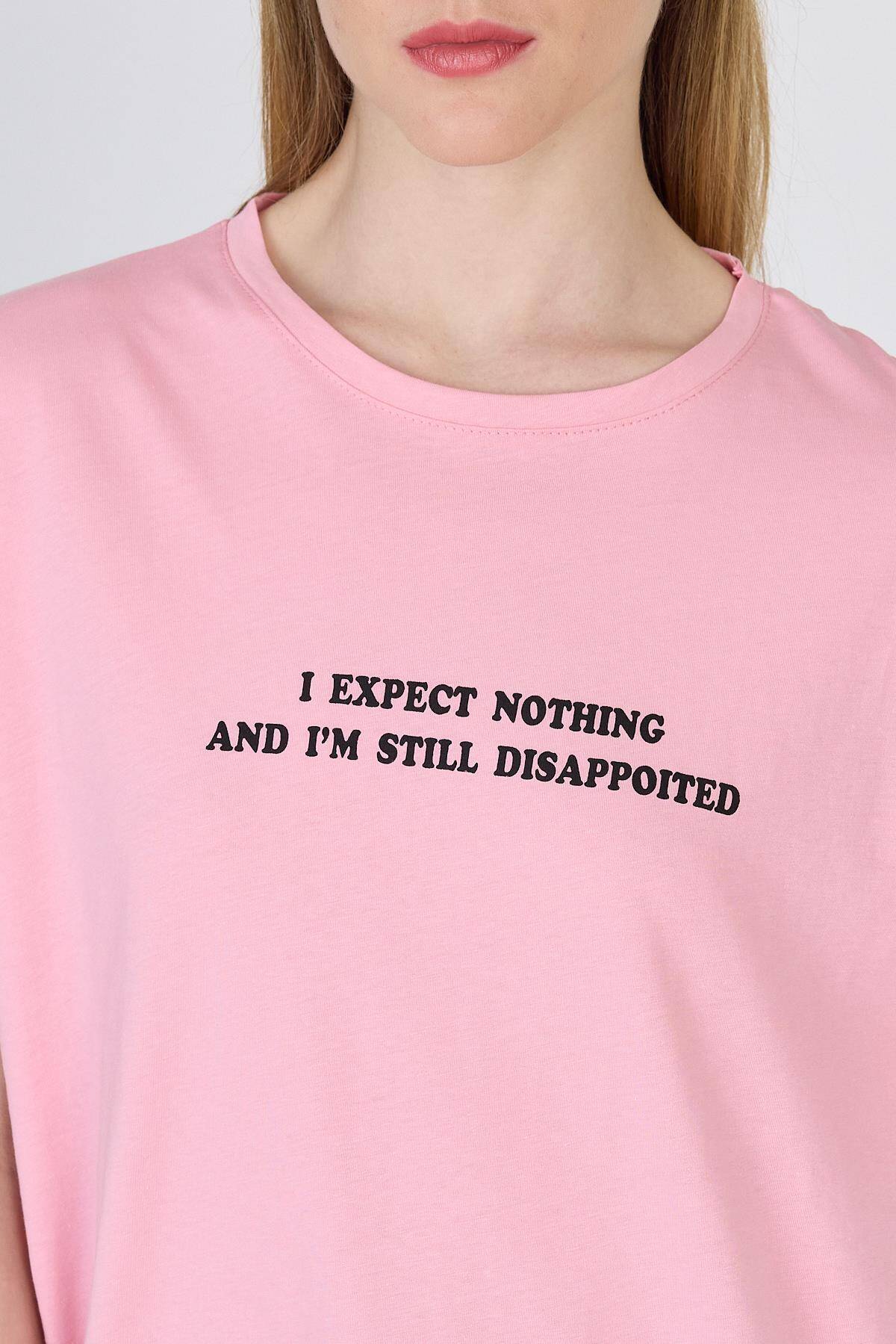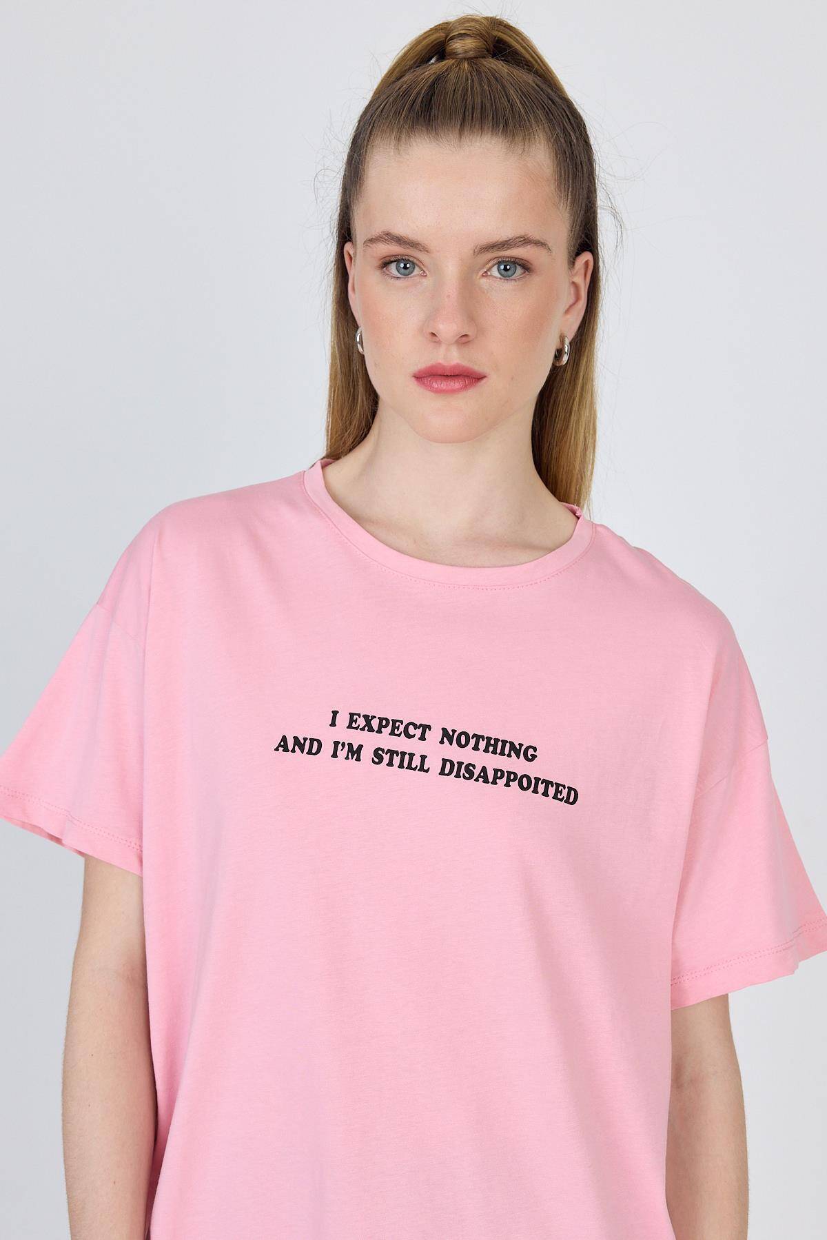 Pembe Yazı Baskılı %100 Pamuk Oversize Tişört 2150-8M