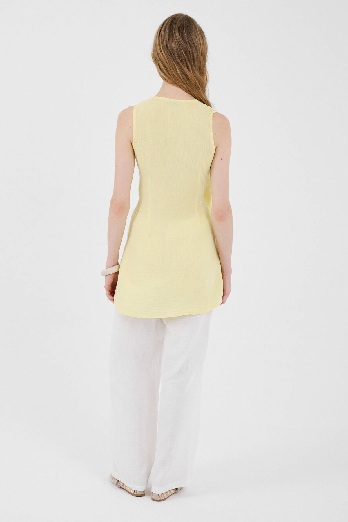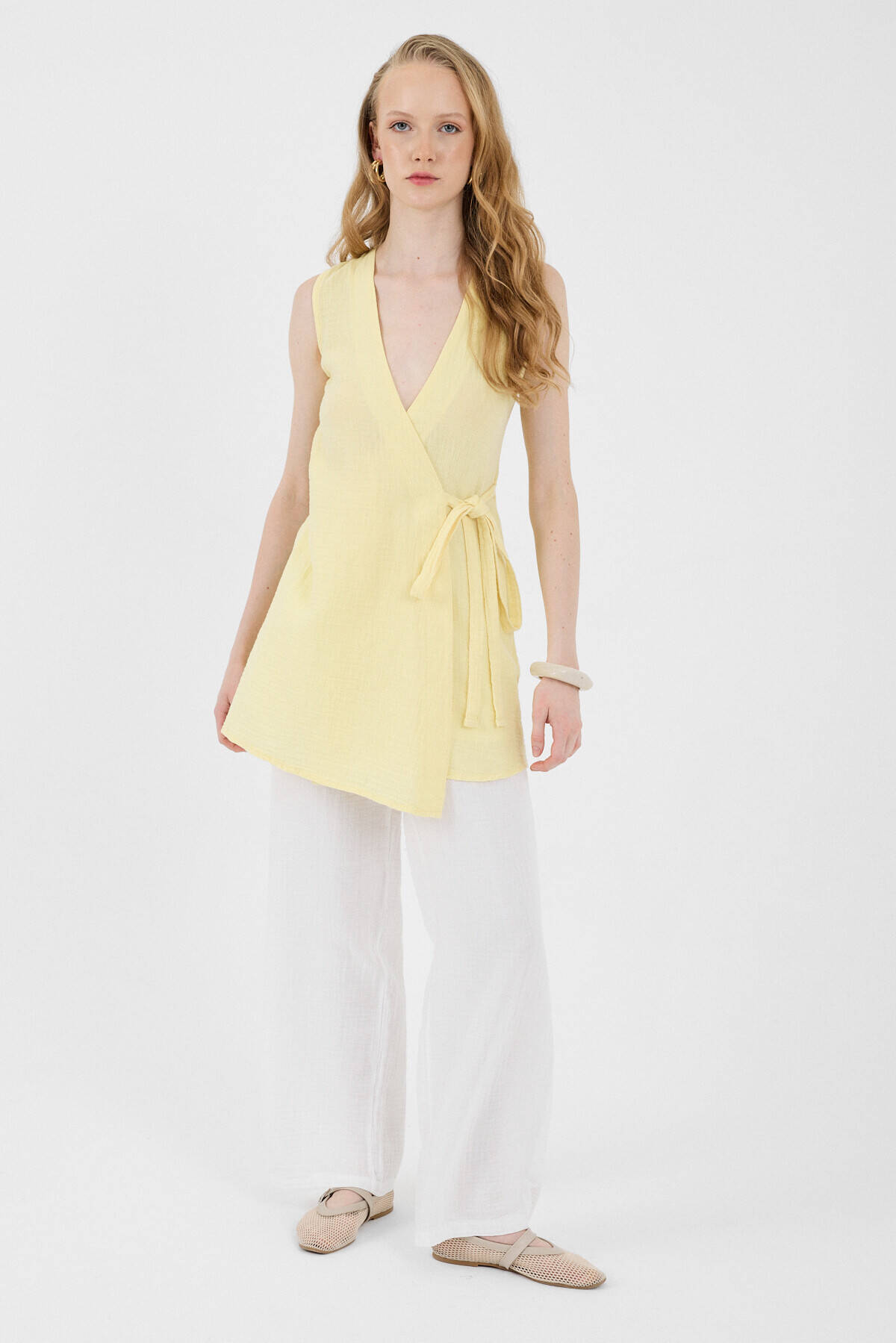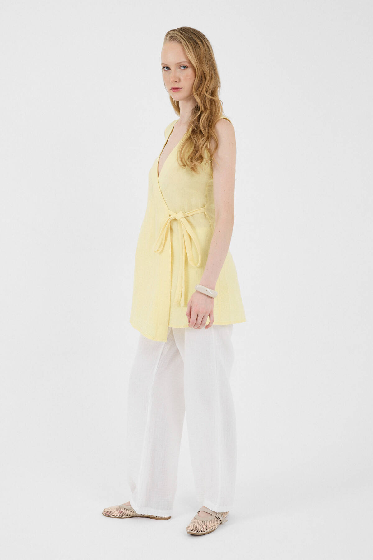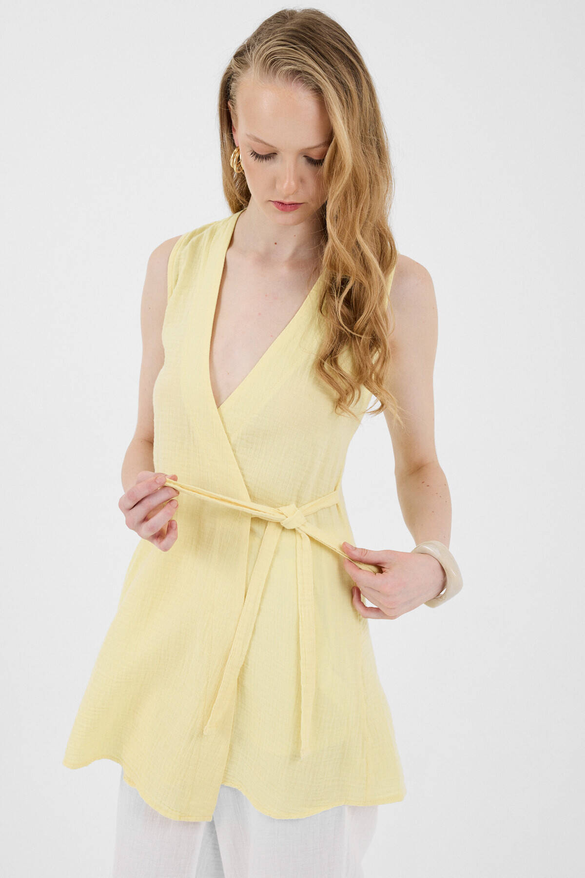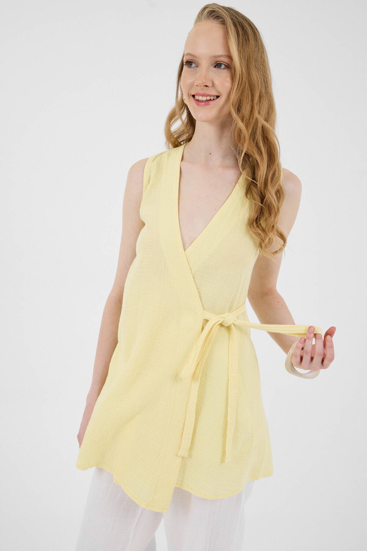 Sarı %100 Pamuk Müslin Yandan Bağlamalı Kuşaklı Yelek 8017A