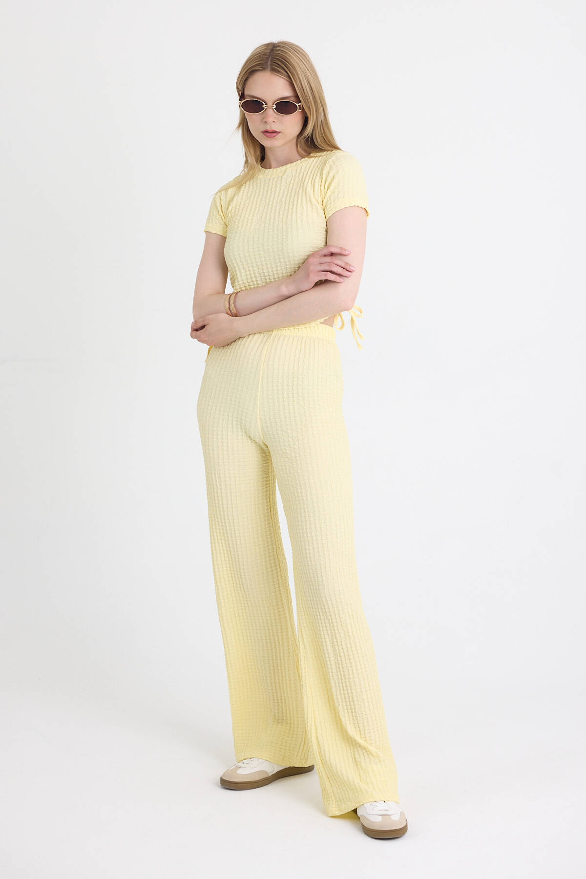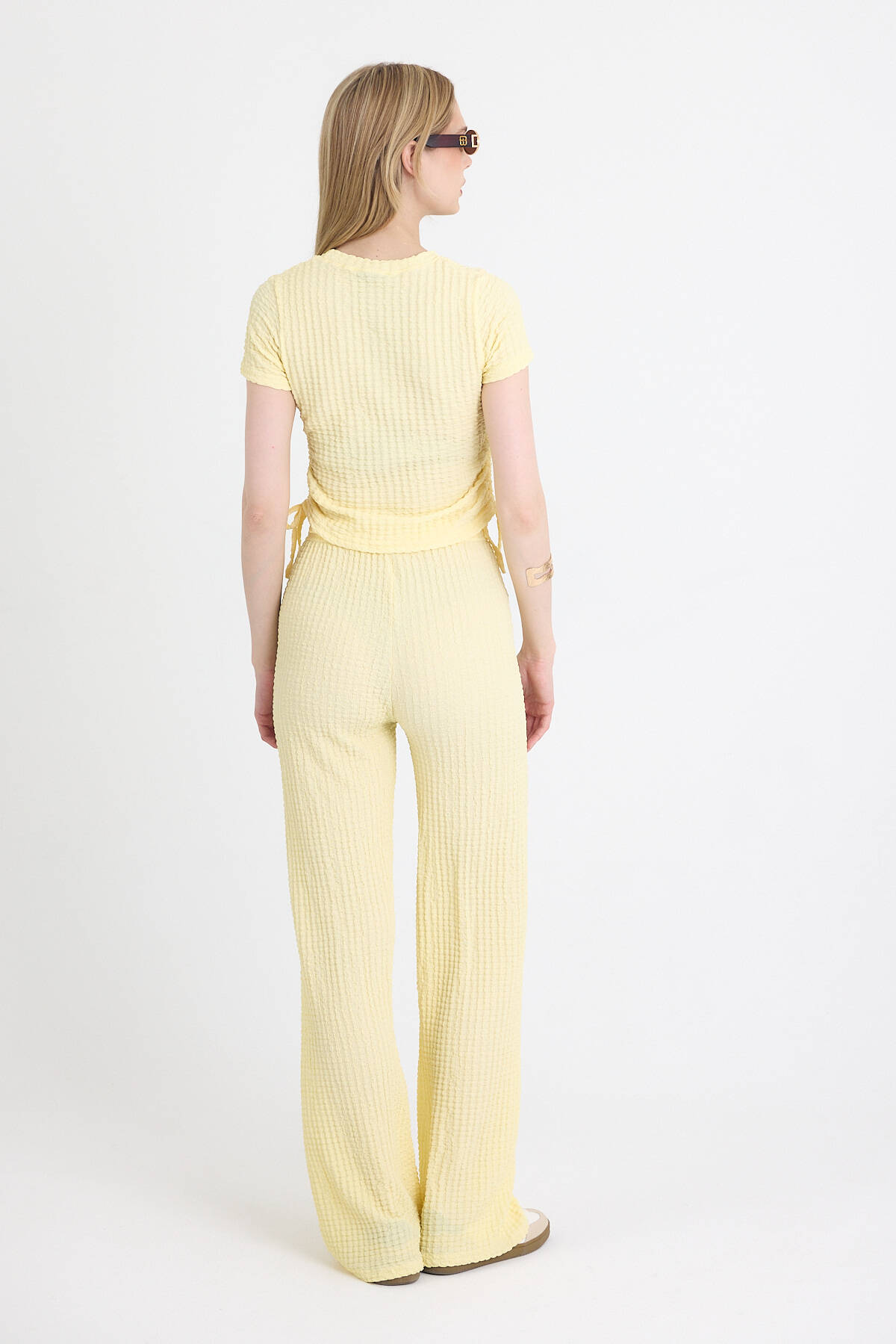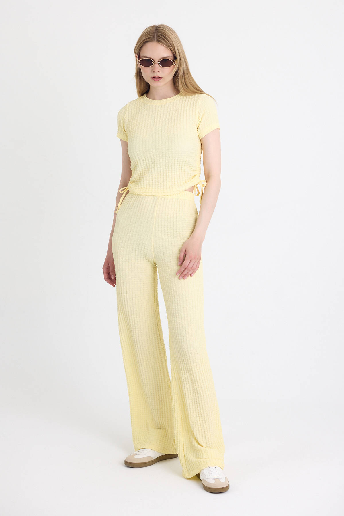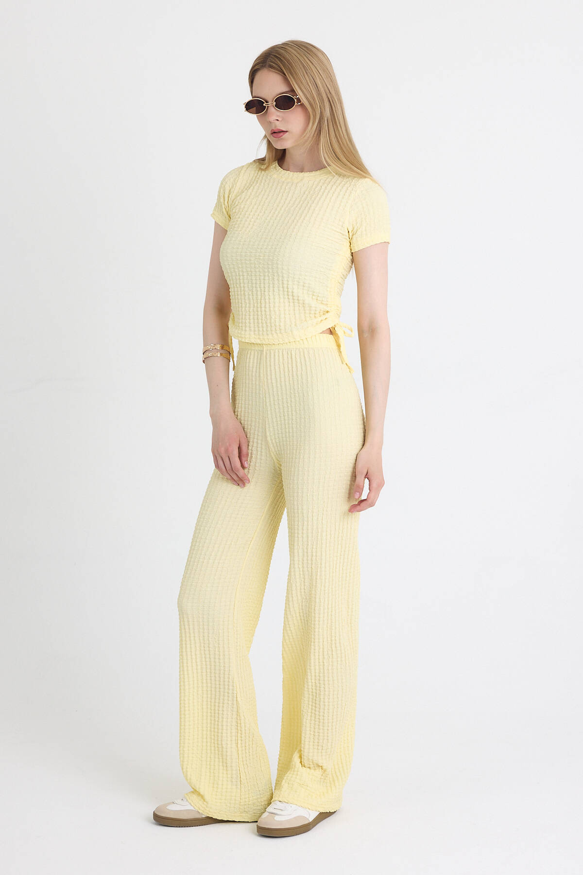 Sarı Bürümcük Dokulu Büzgülü Crop ve Geniş Paça Pantolon Takımı 3001