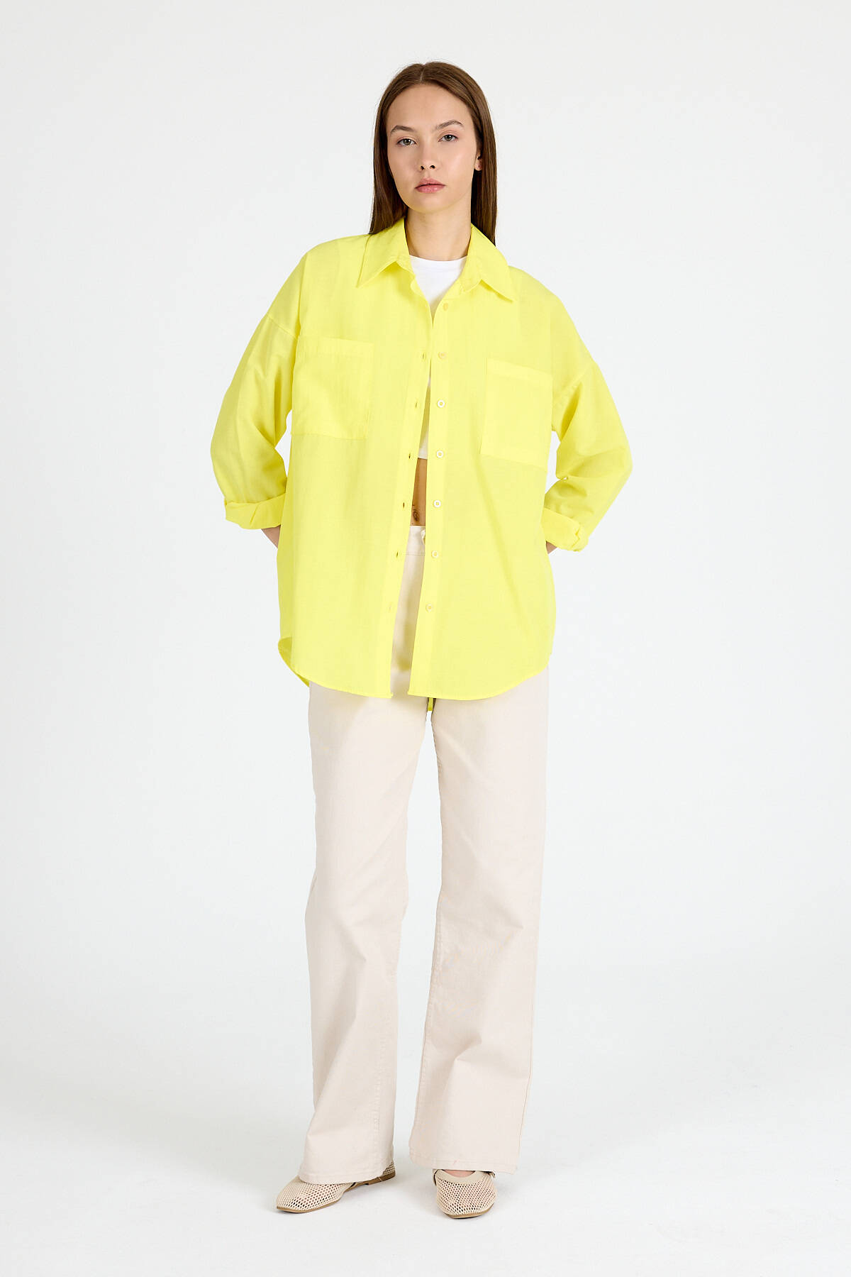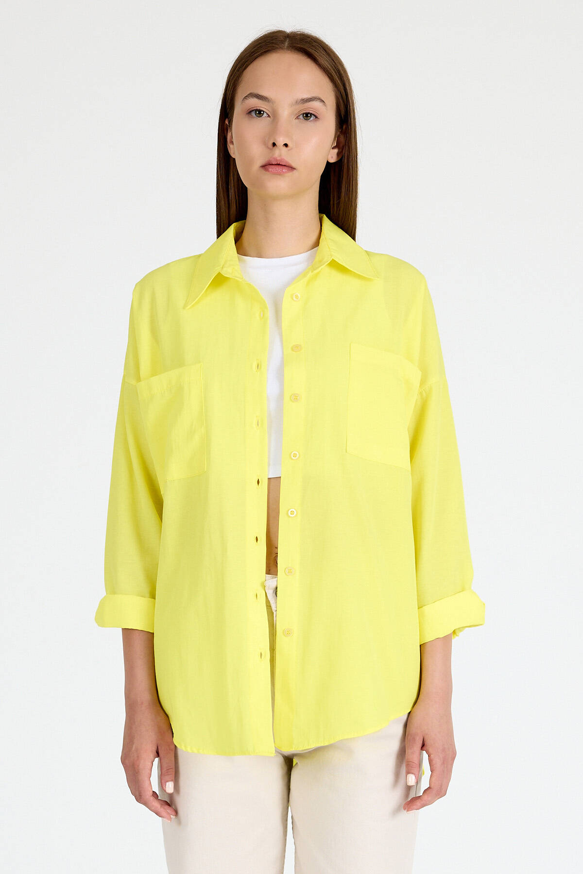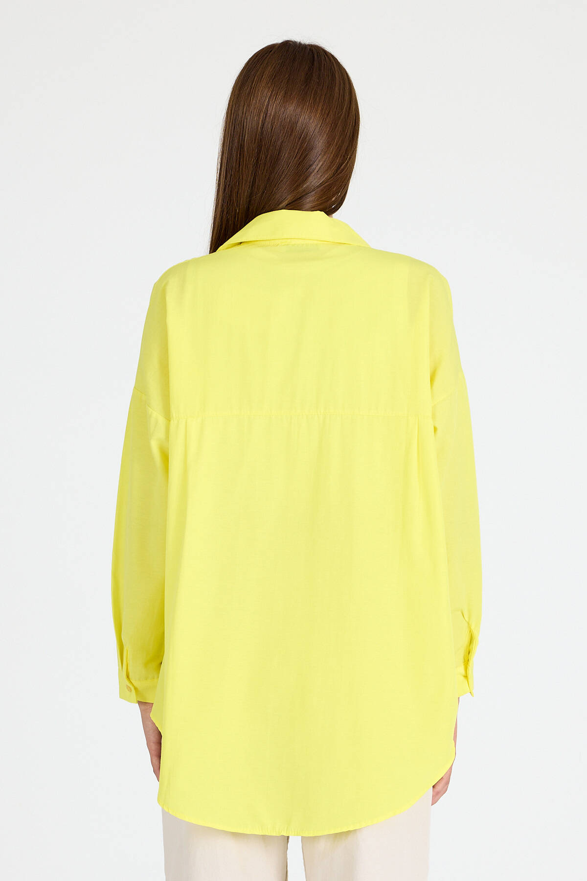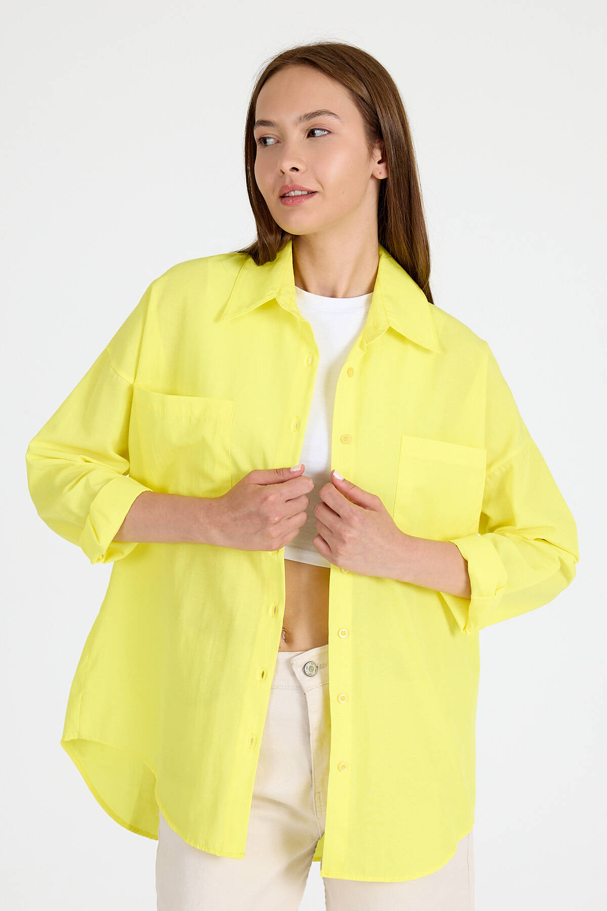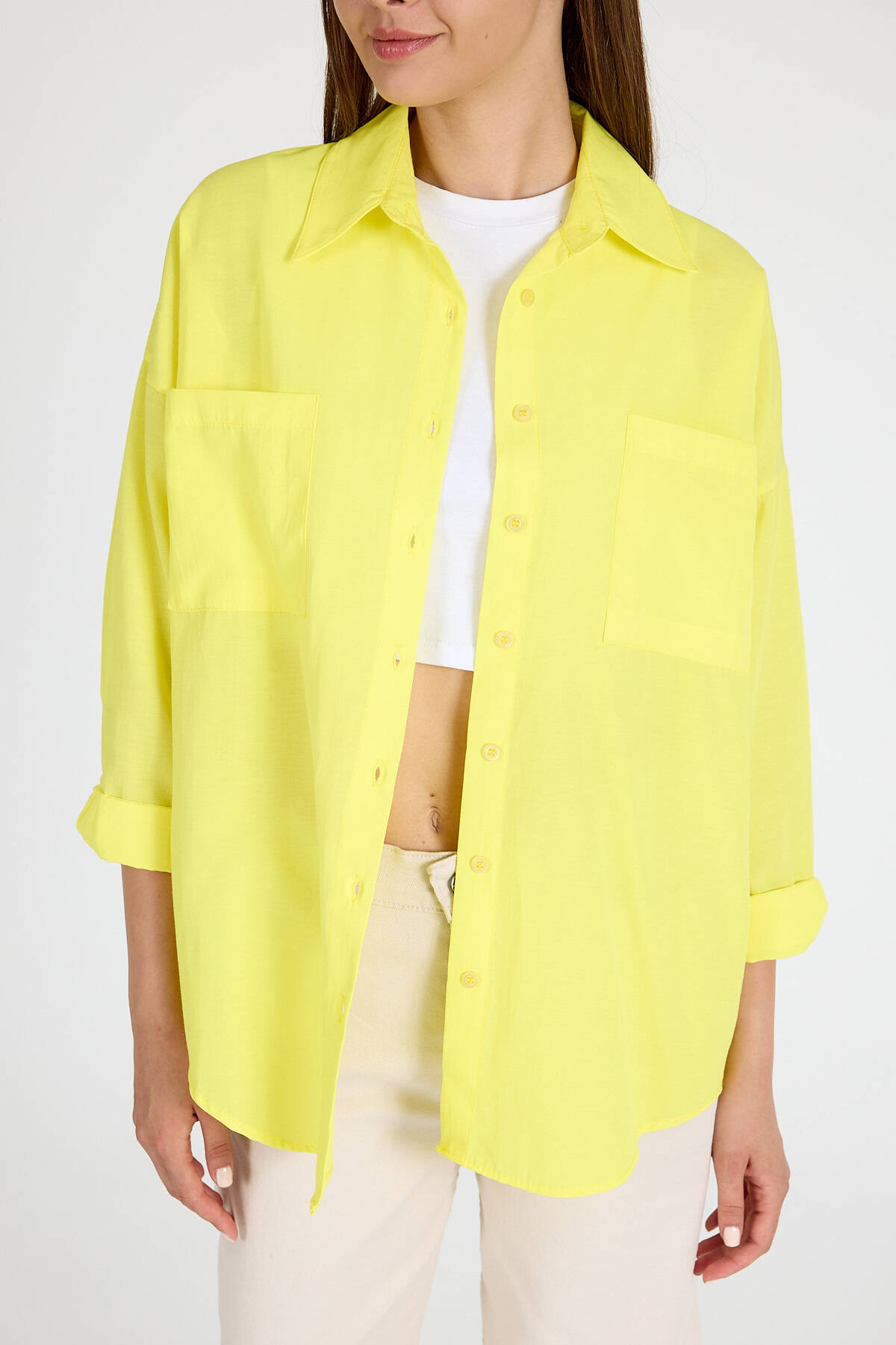 Sarı Çift Cepli Oversize Uzun Basic Gömlek TCR 6256A