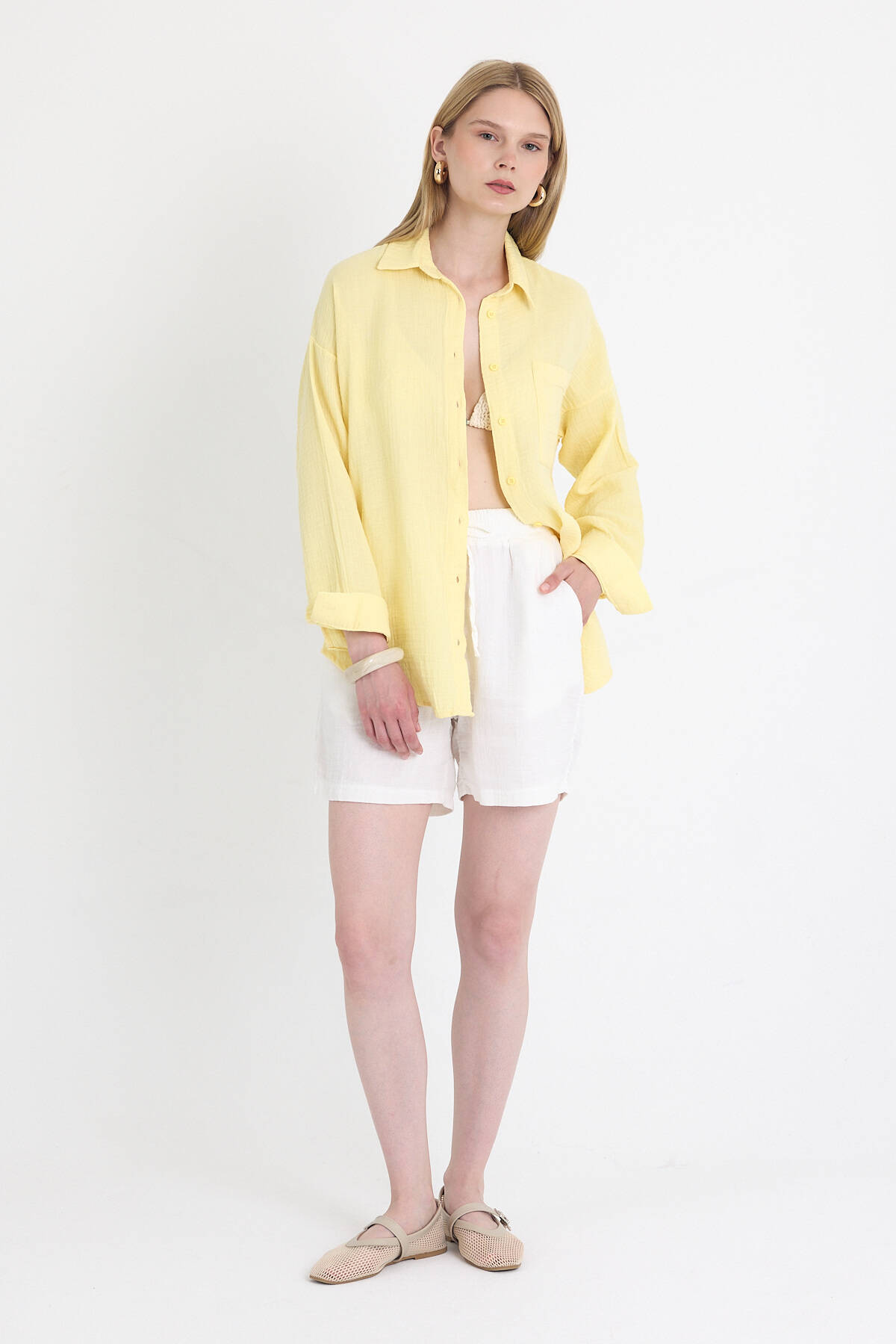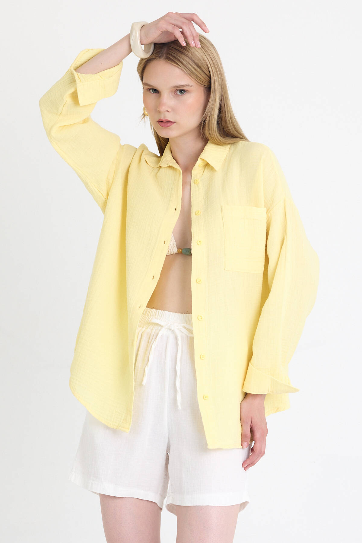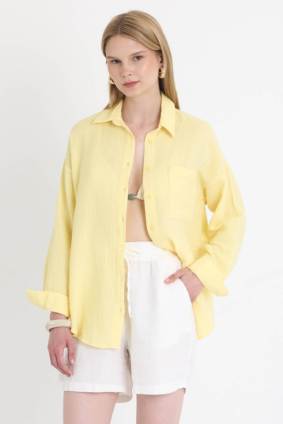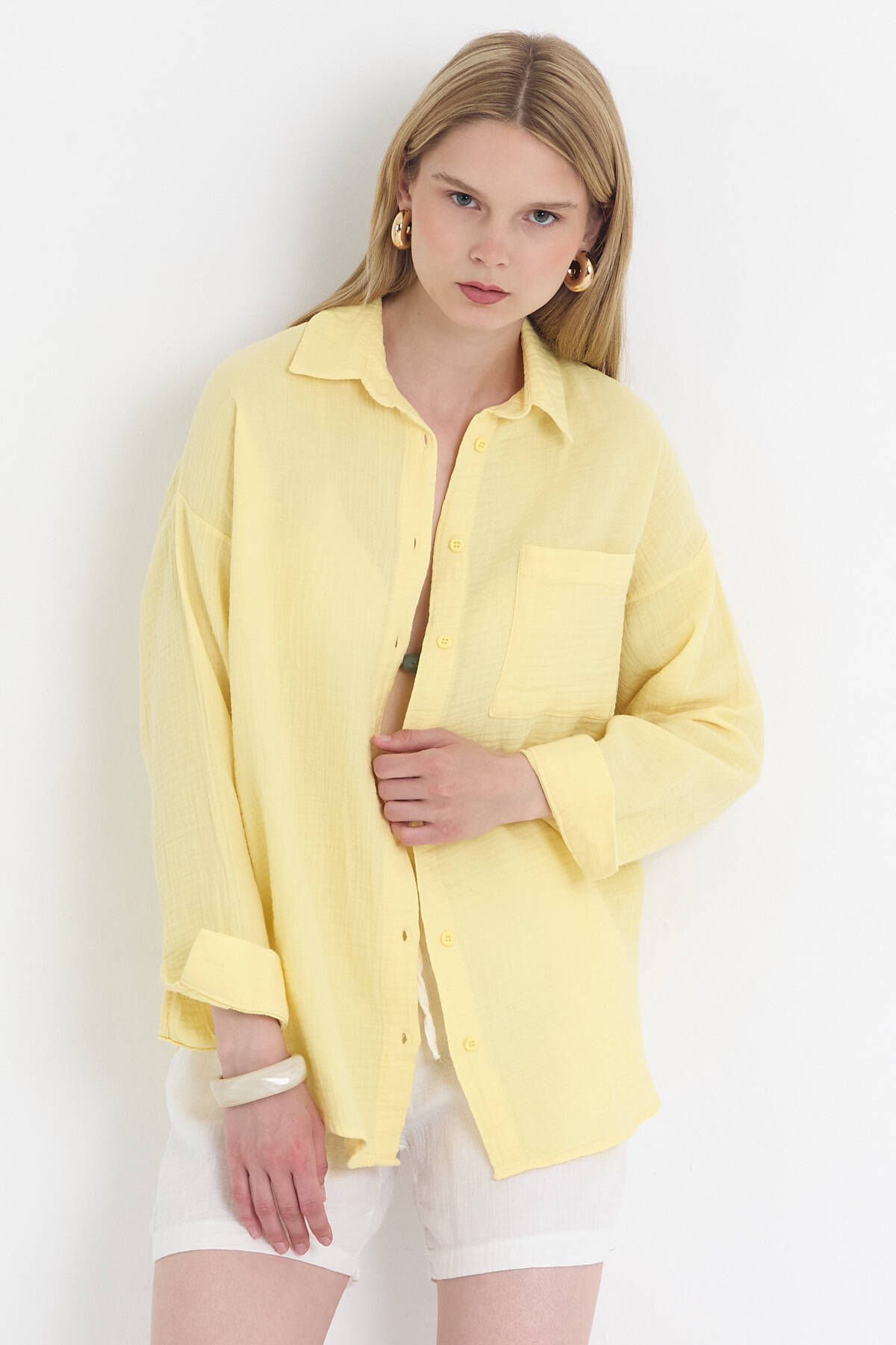 Sarı Tek Cepli %100 Pamuk Oversize Müslin Gömlek 4697A