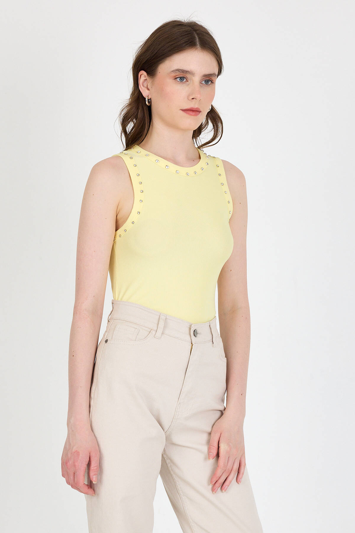 Sarı Yaka Ve Omuz Taş Detaylı Ribanalı Örme Atlet 1249