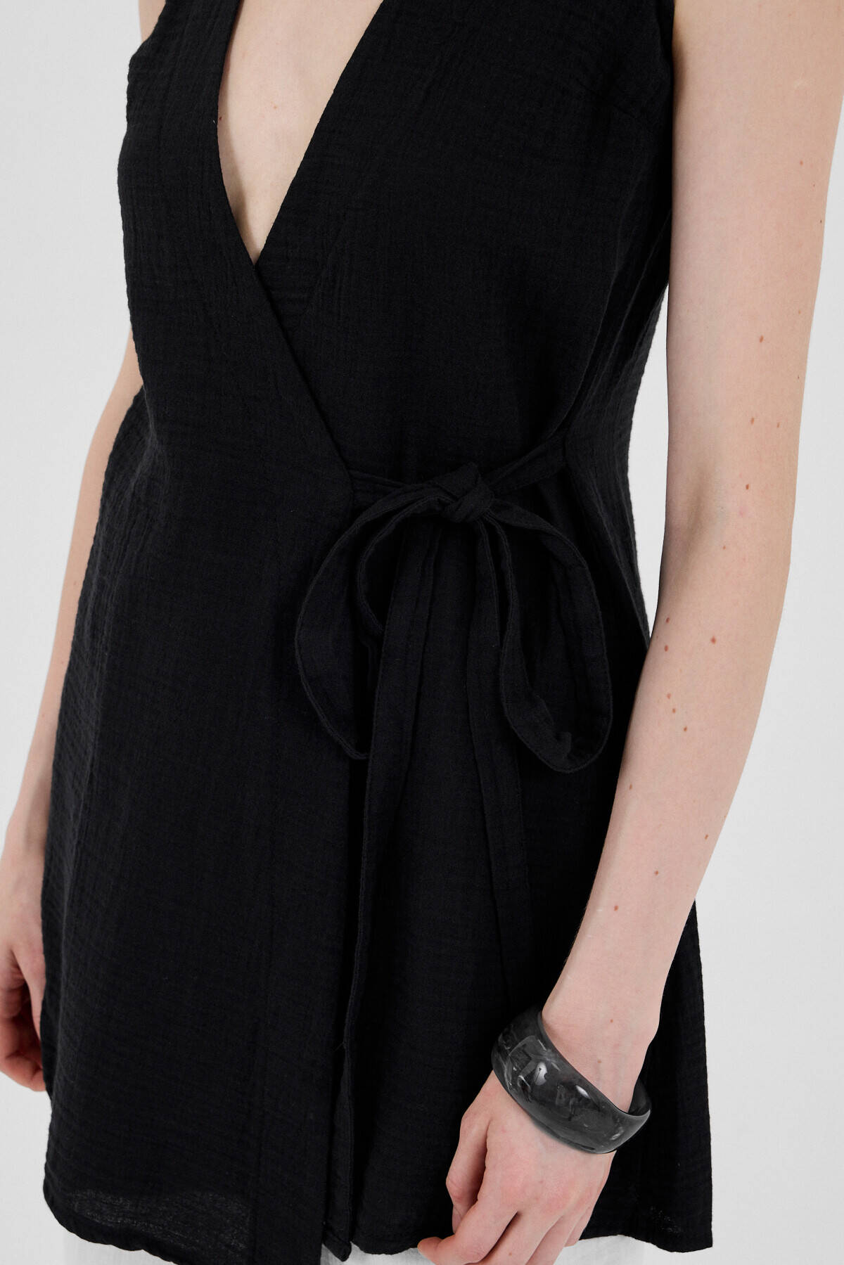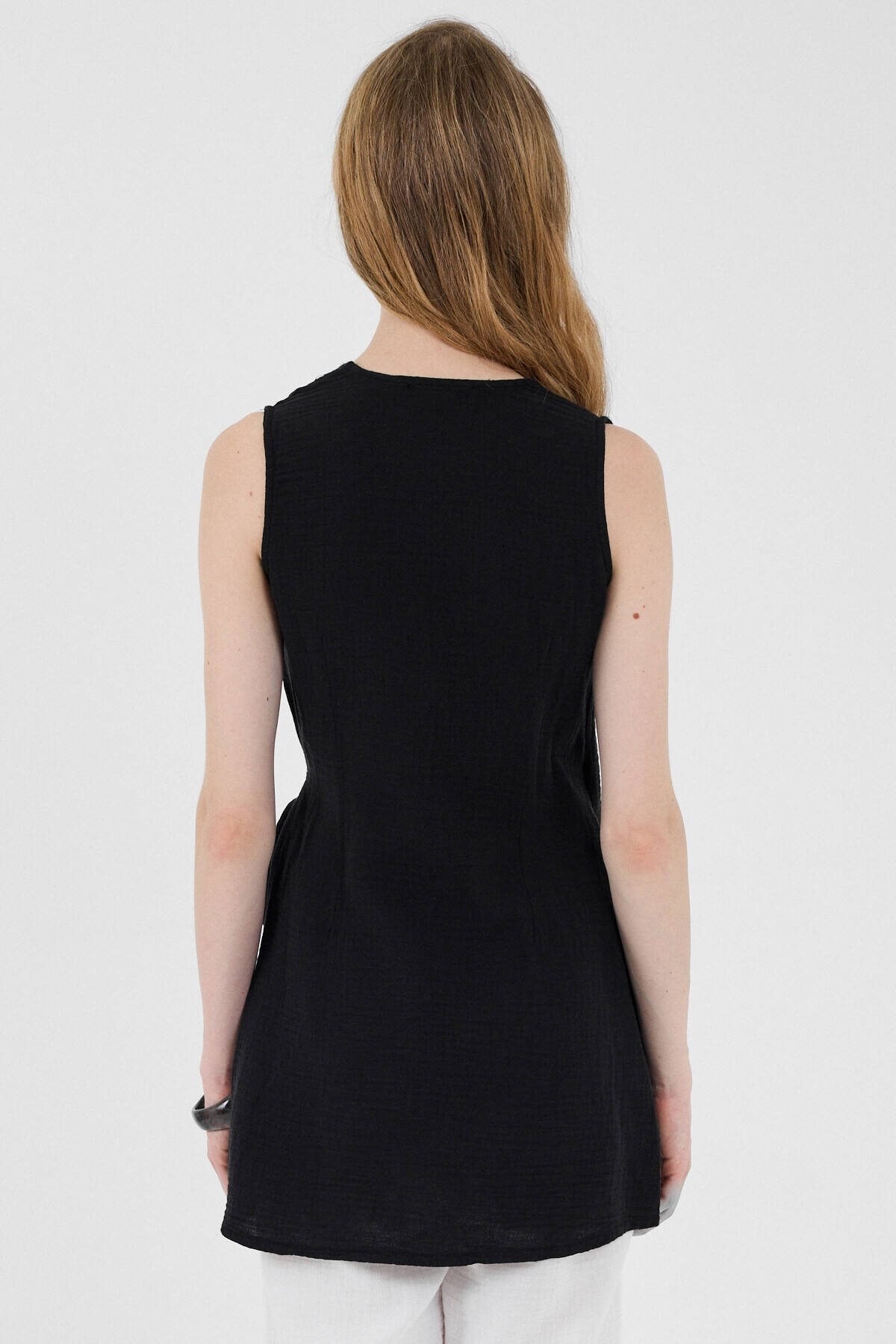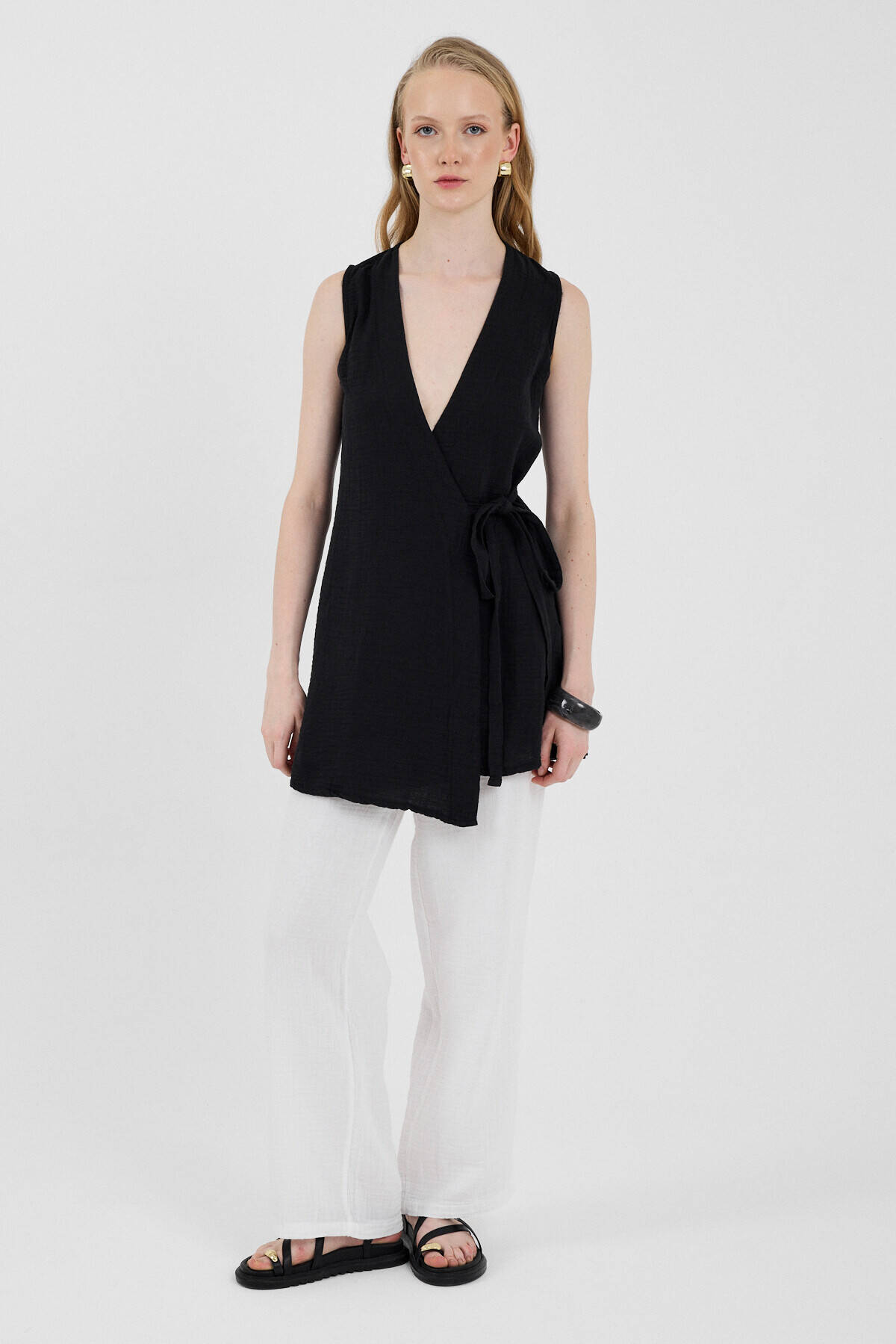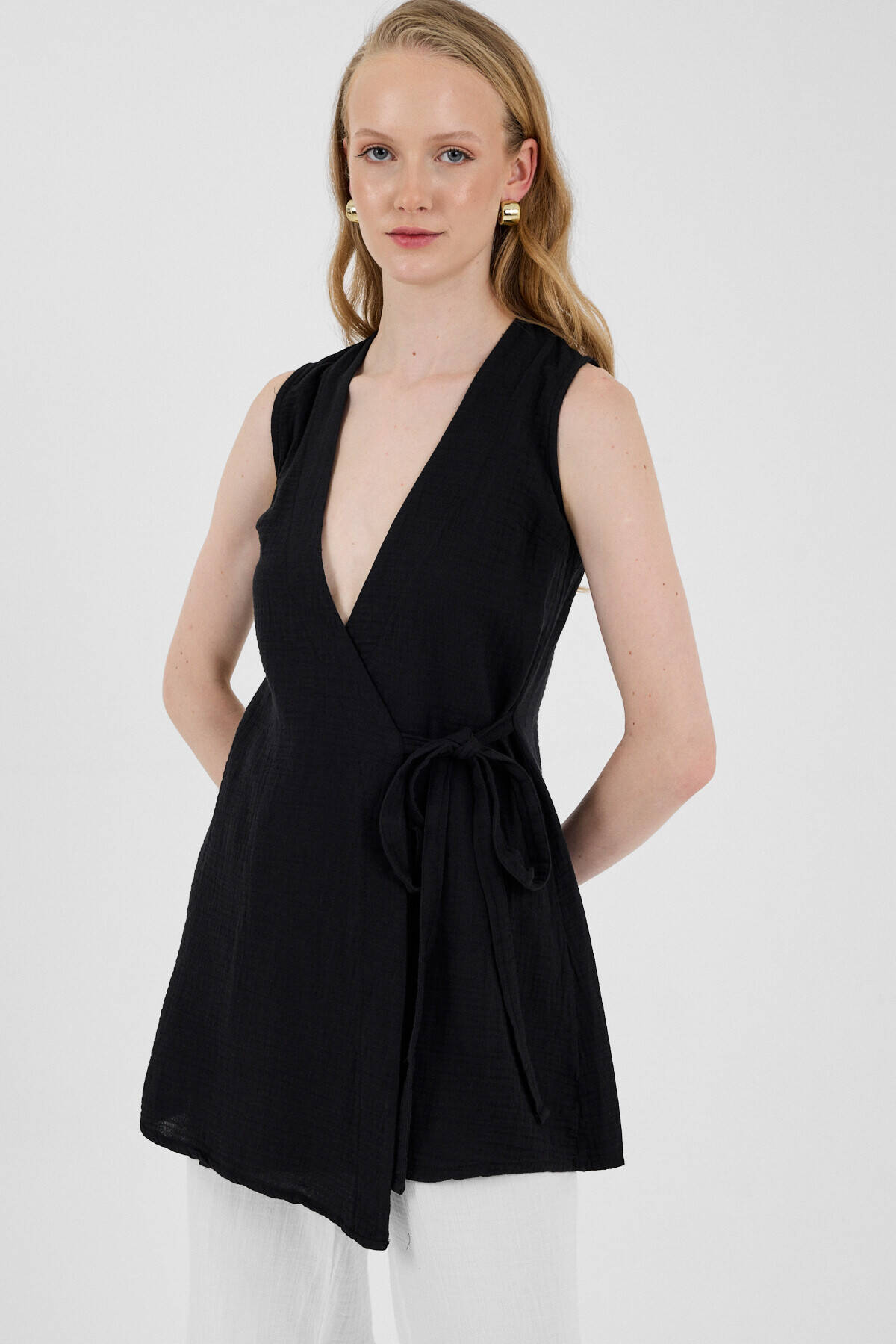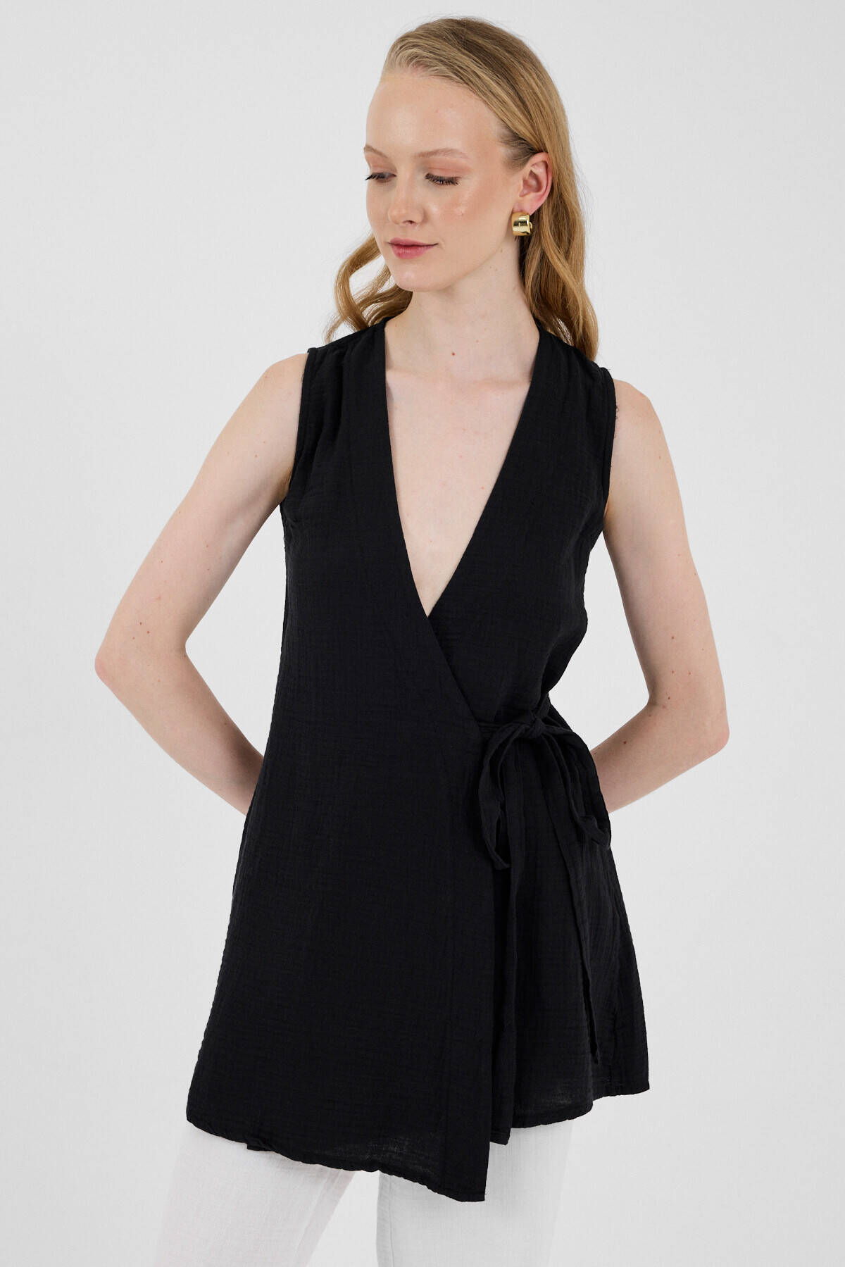 Siyah %100 Pamuk Müslin Yandan Bağlamalı Kuşaklı Yelek 8017A