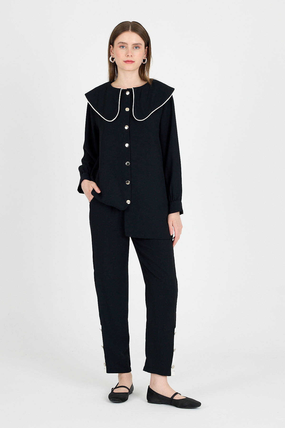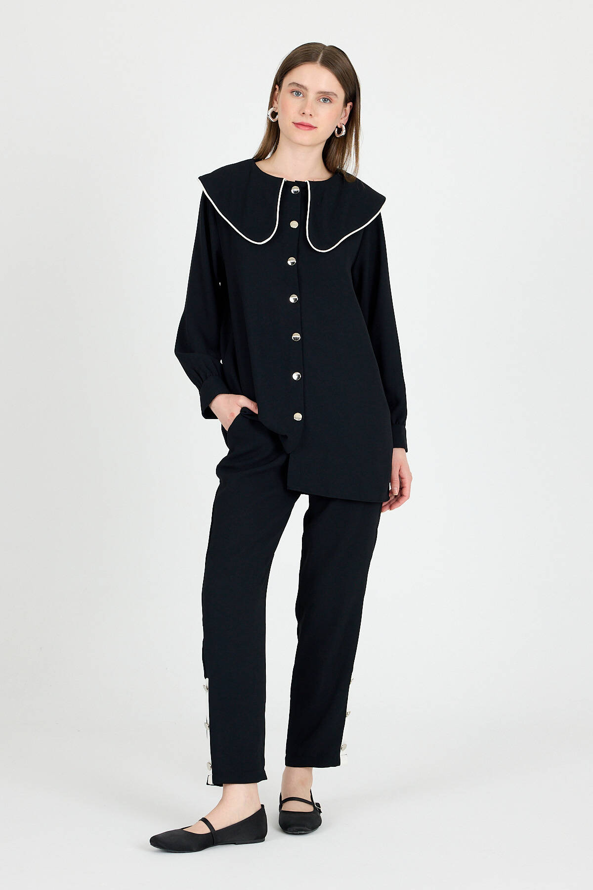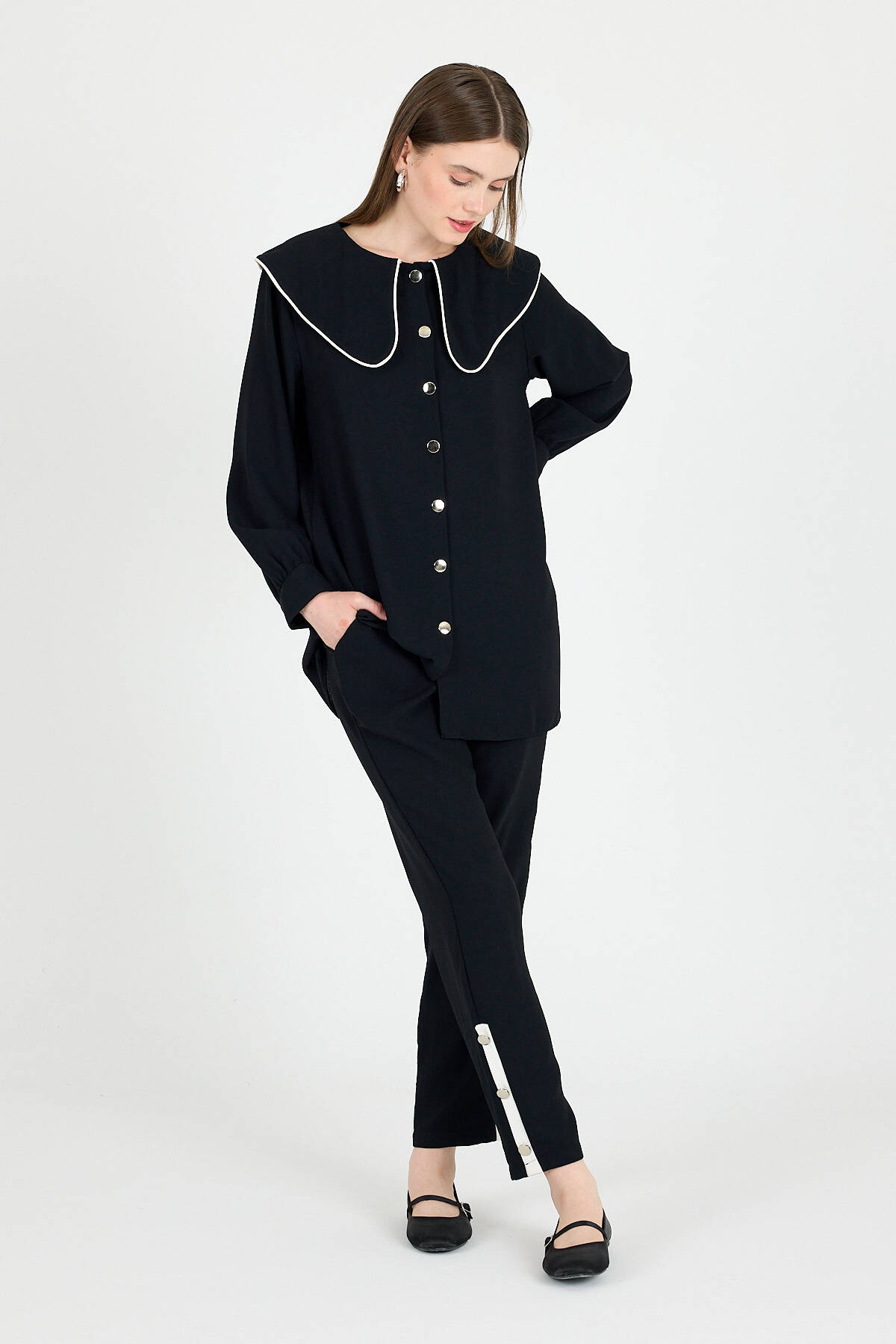 Siyah Bebe Yaka Düğmeli Tunik ve Yanı Şerit Detaylı Pantolon Takım 4661A