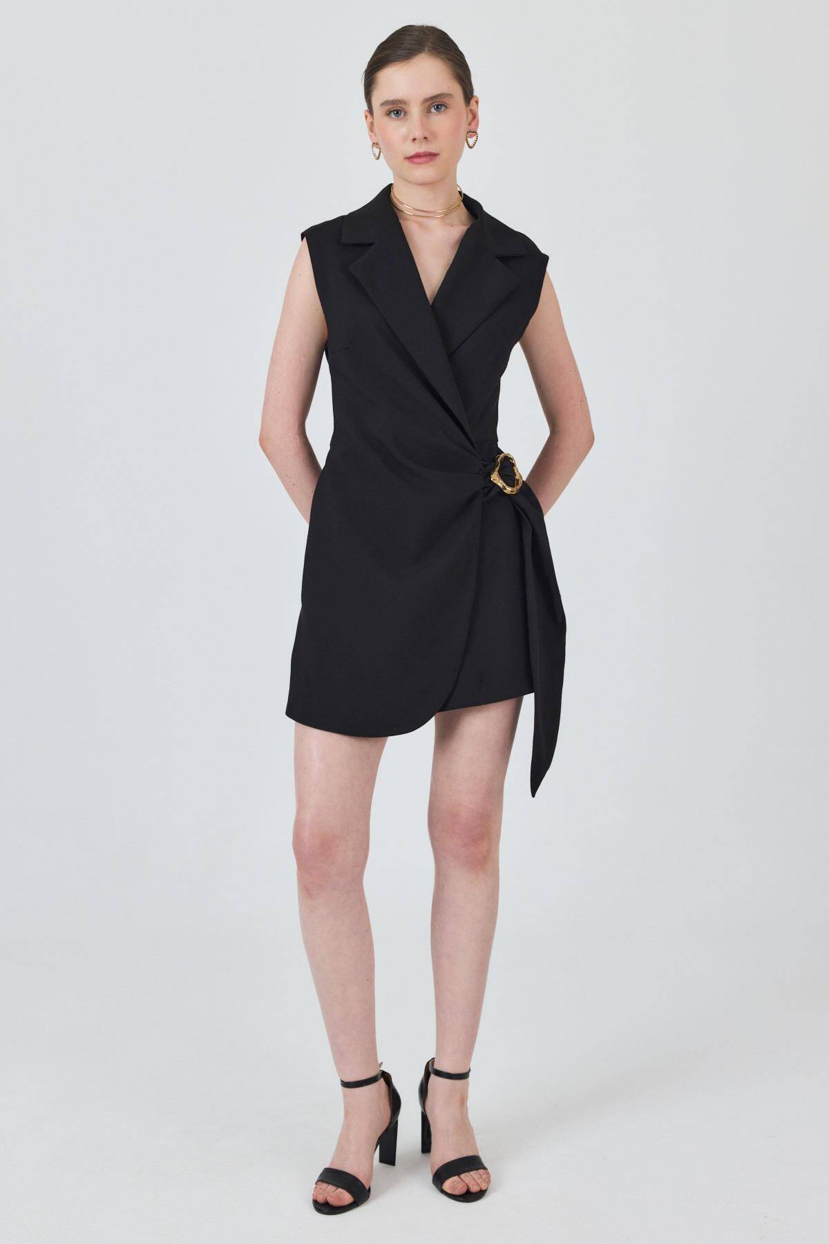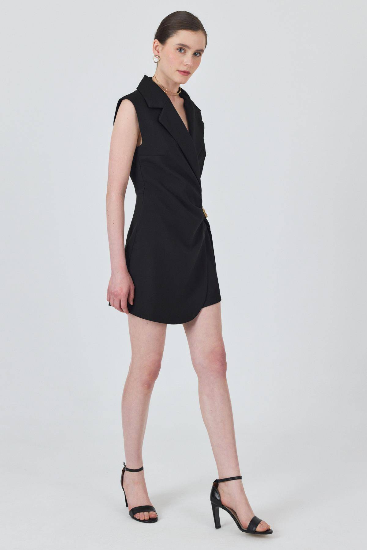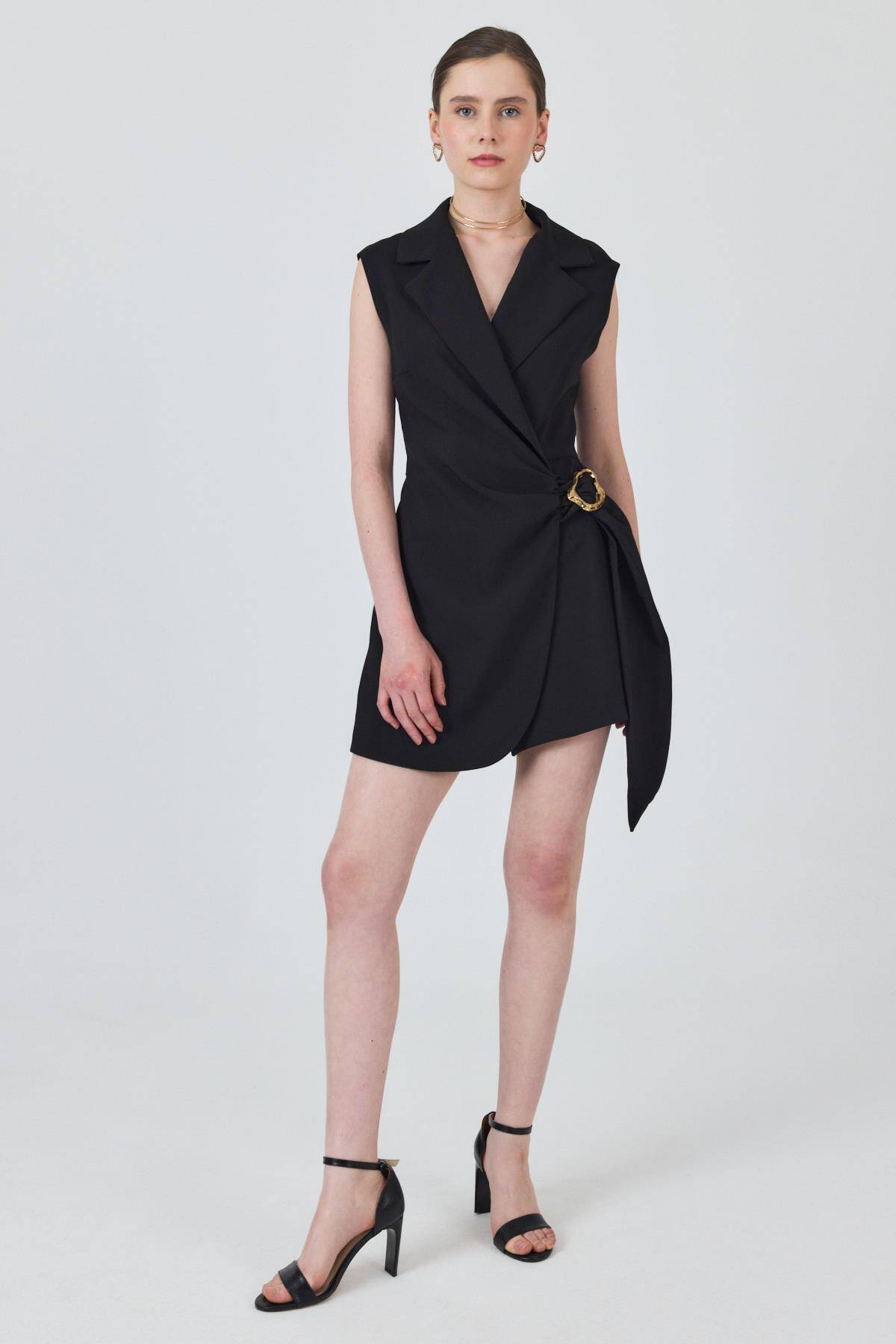 3686 Bel Büzgü Detay Elbise Siyah