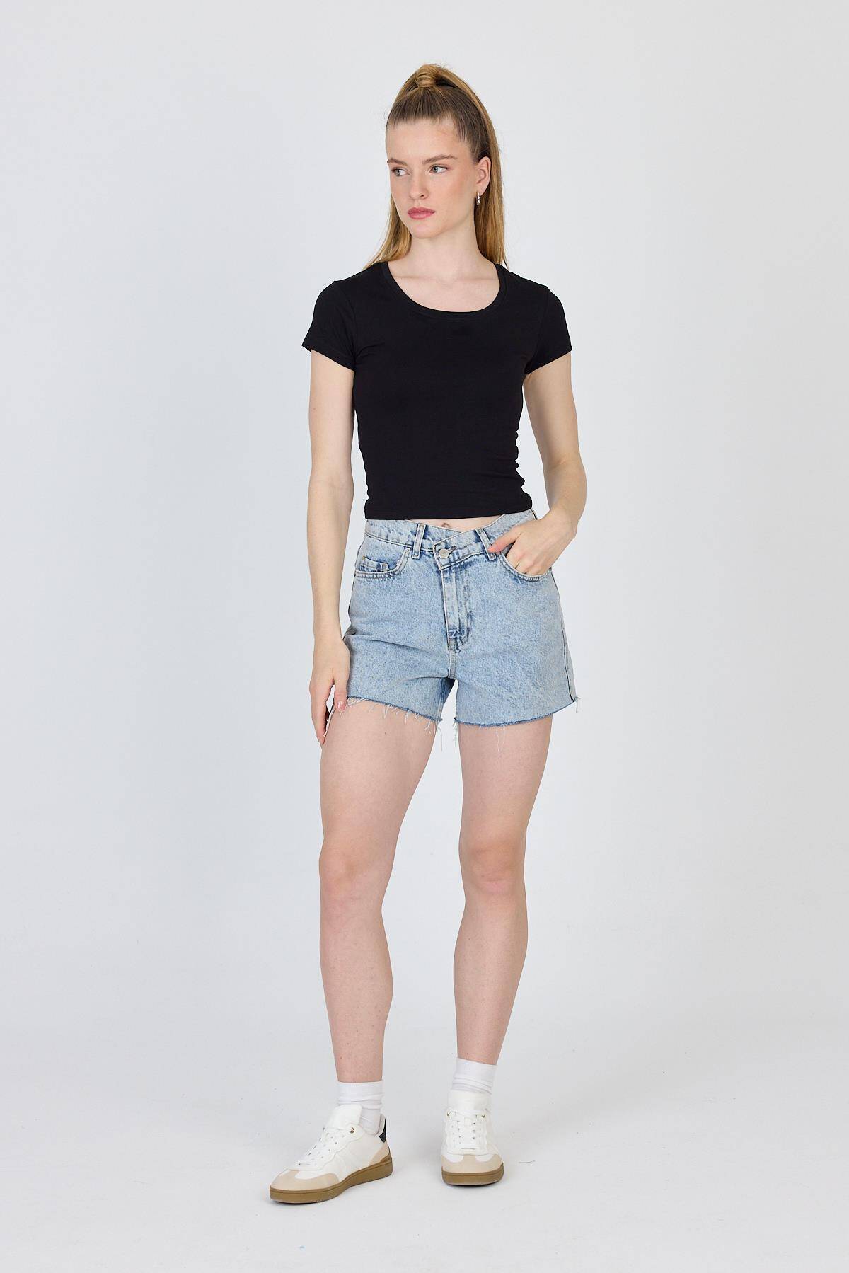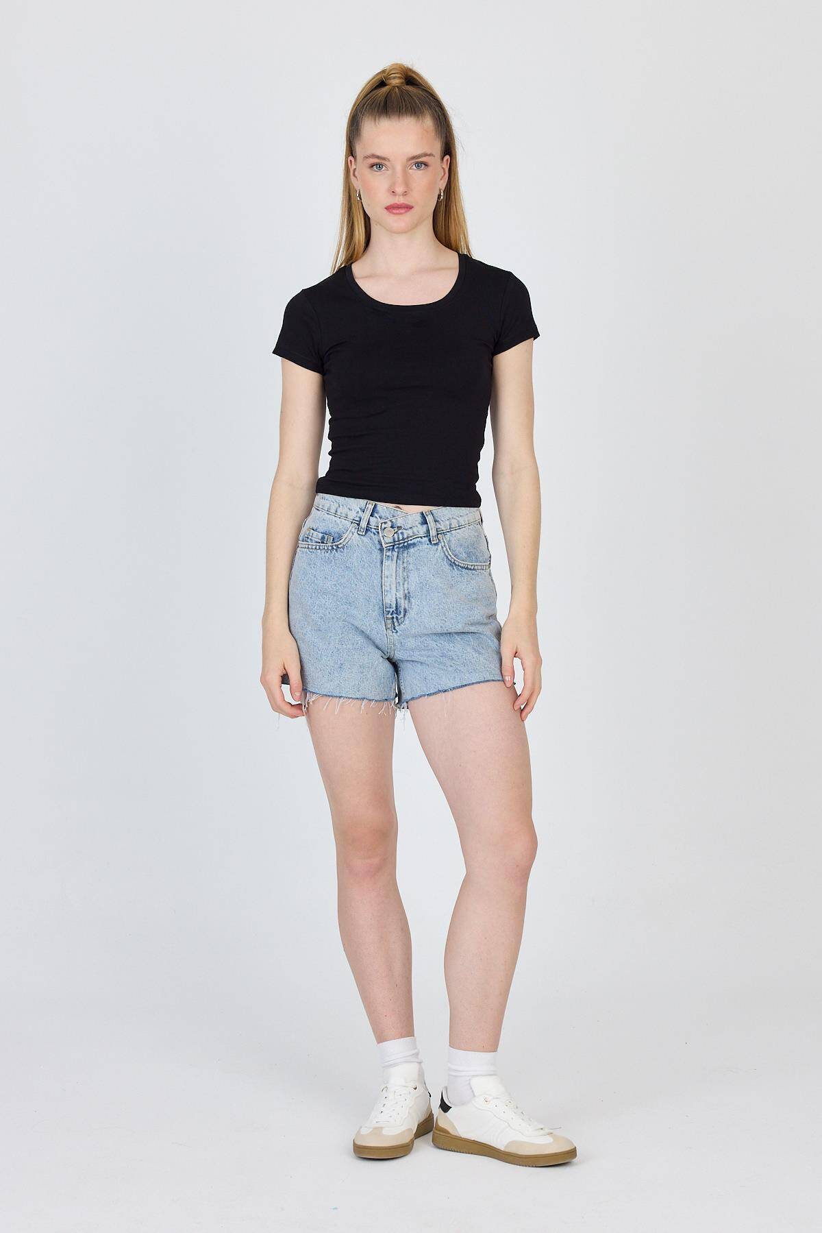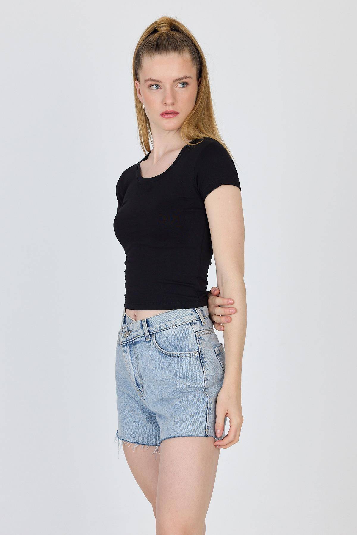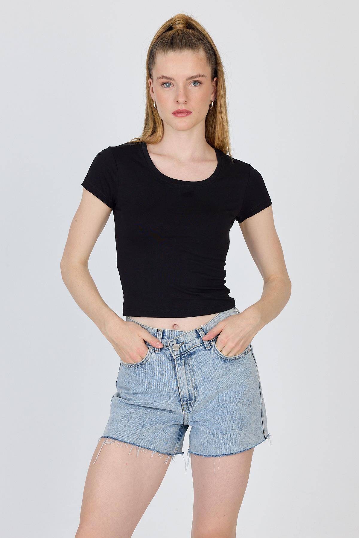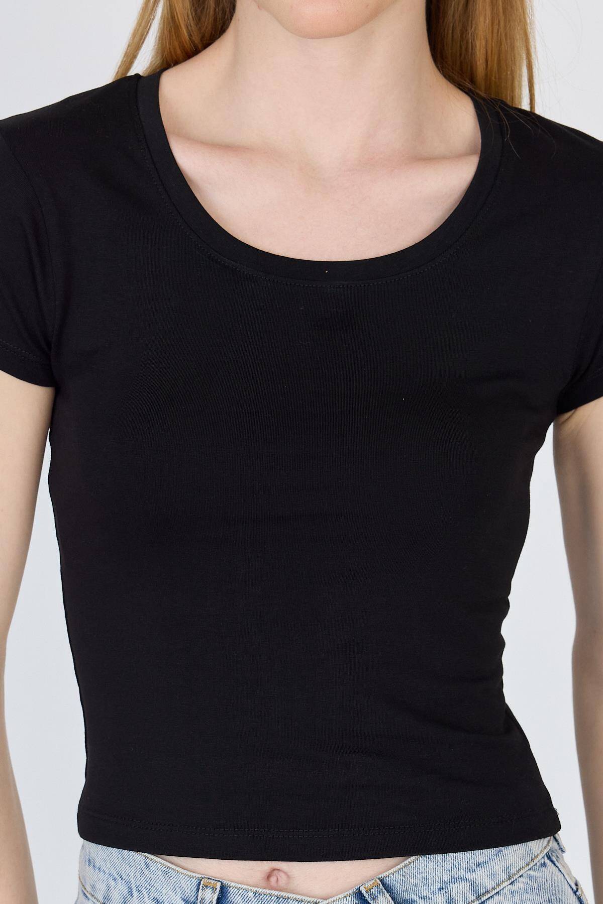 Siyah Bisiklet Yaka Basic Crop Tişört 9200M