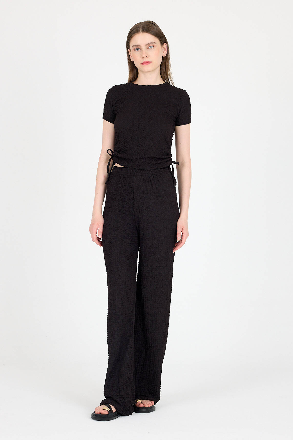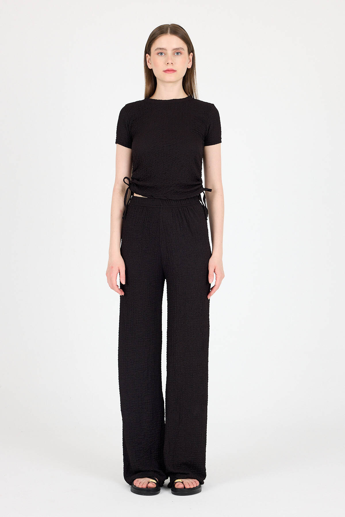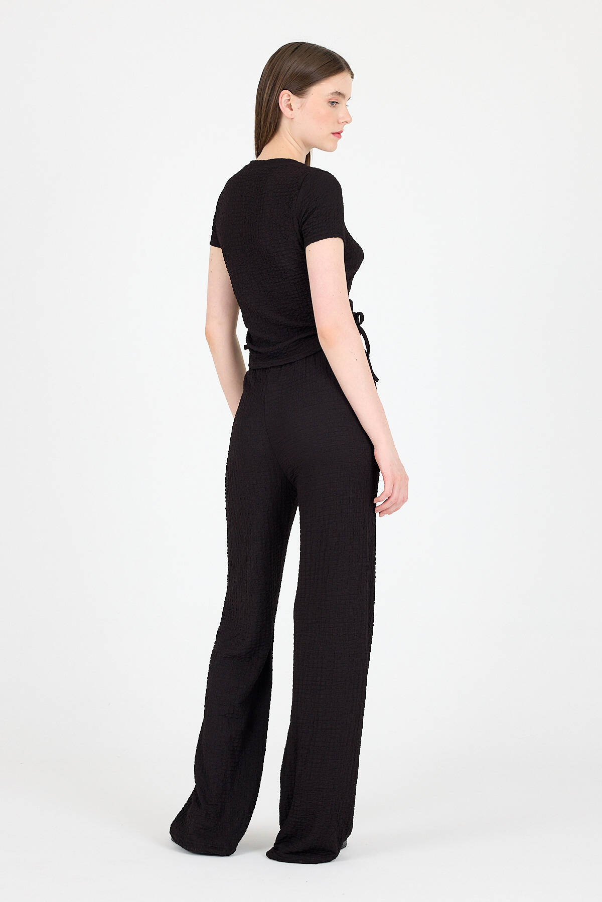 Siyah Bürümcük Dokulu Büzgülü Crop ve Geniş Paça Pantolon Takımı 3001