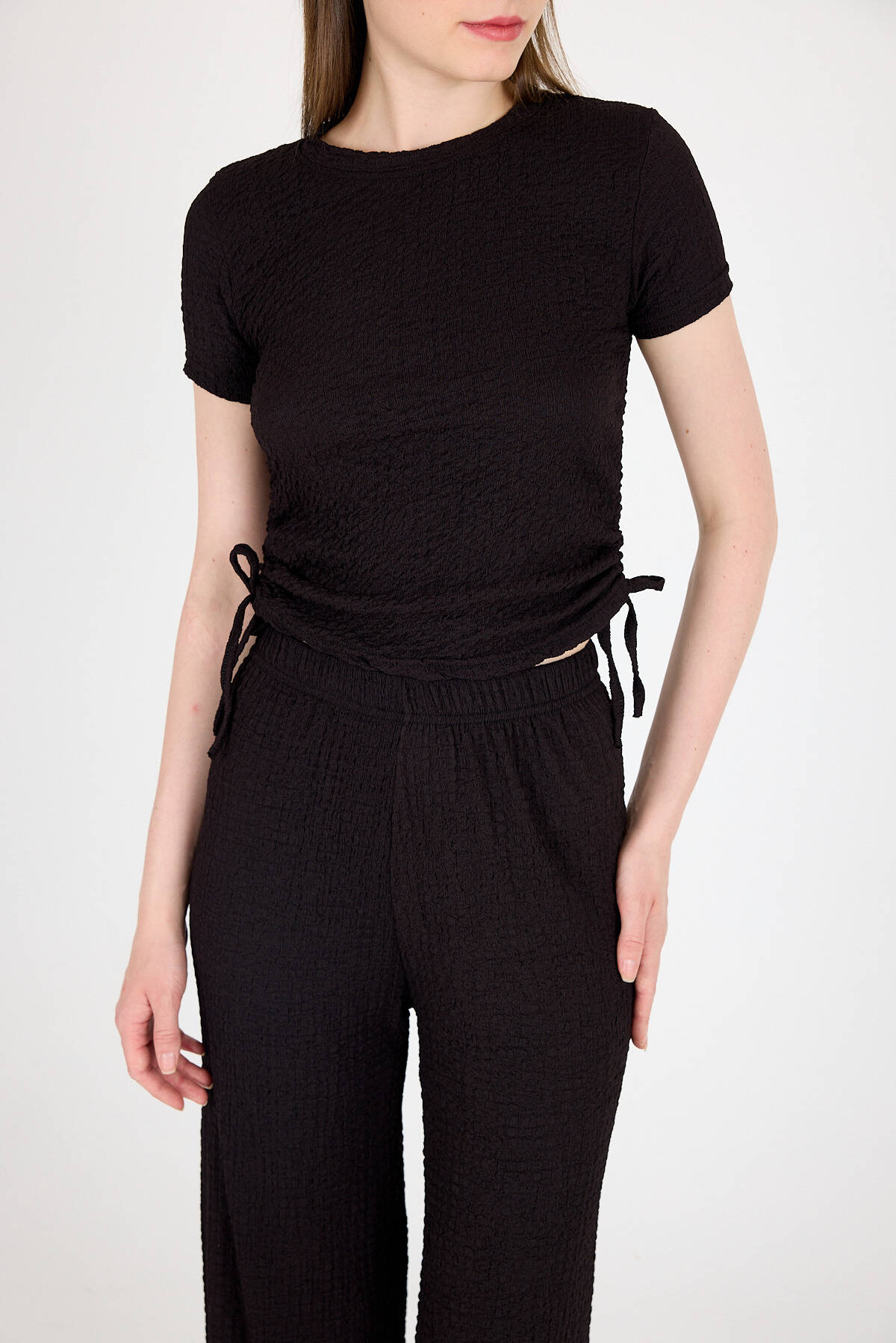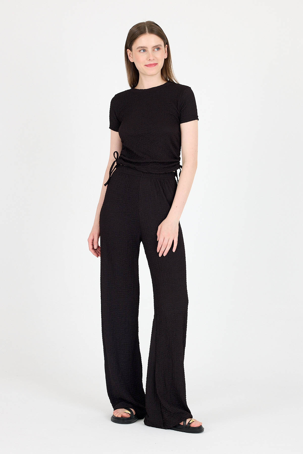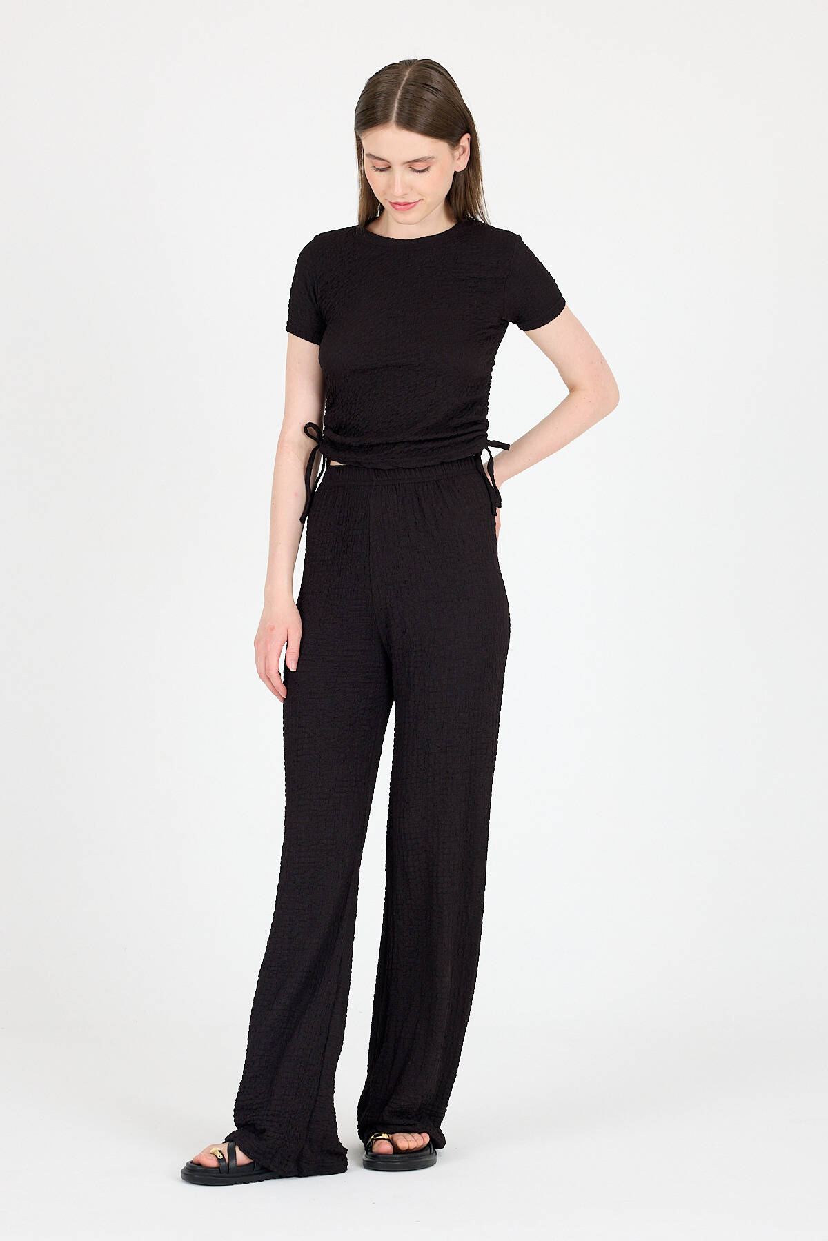 Siyah Bürümcük Dokulu Büzgülü Crop ve Geniş Paça Pantolon Takımı 3001