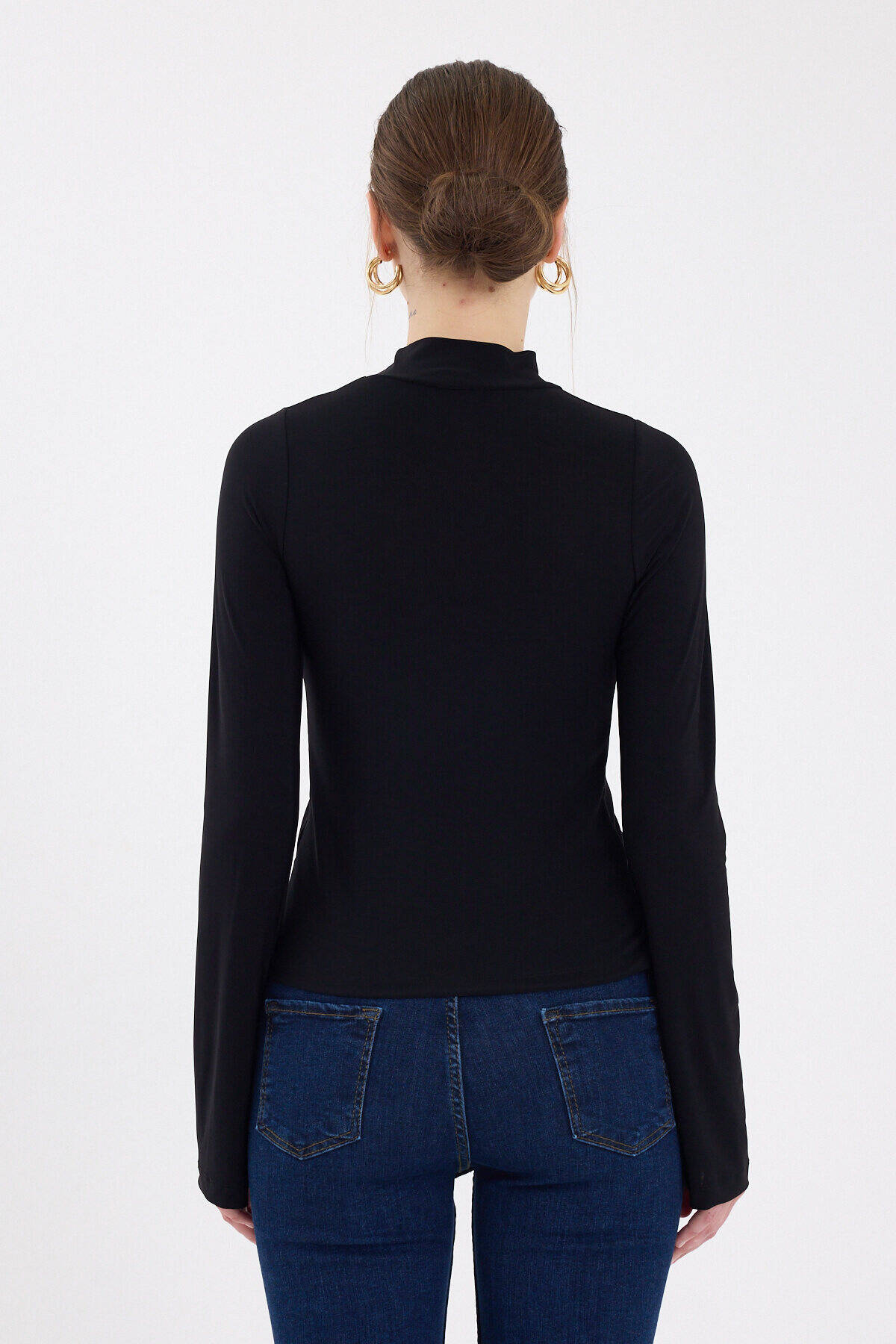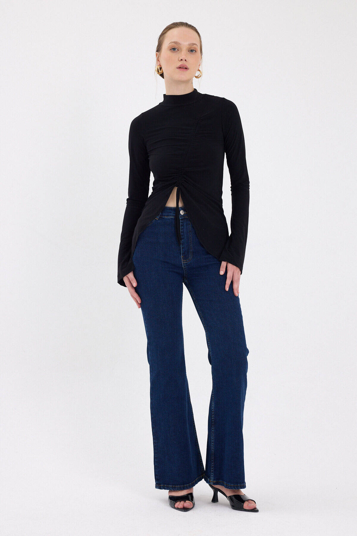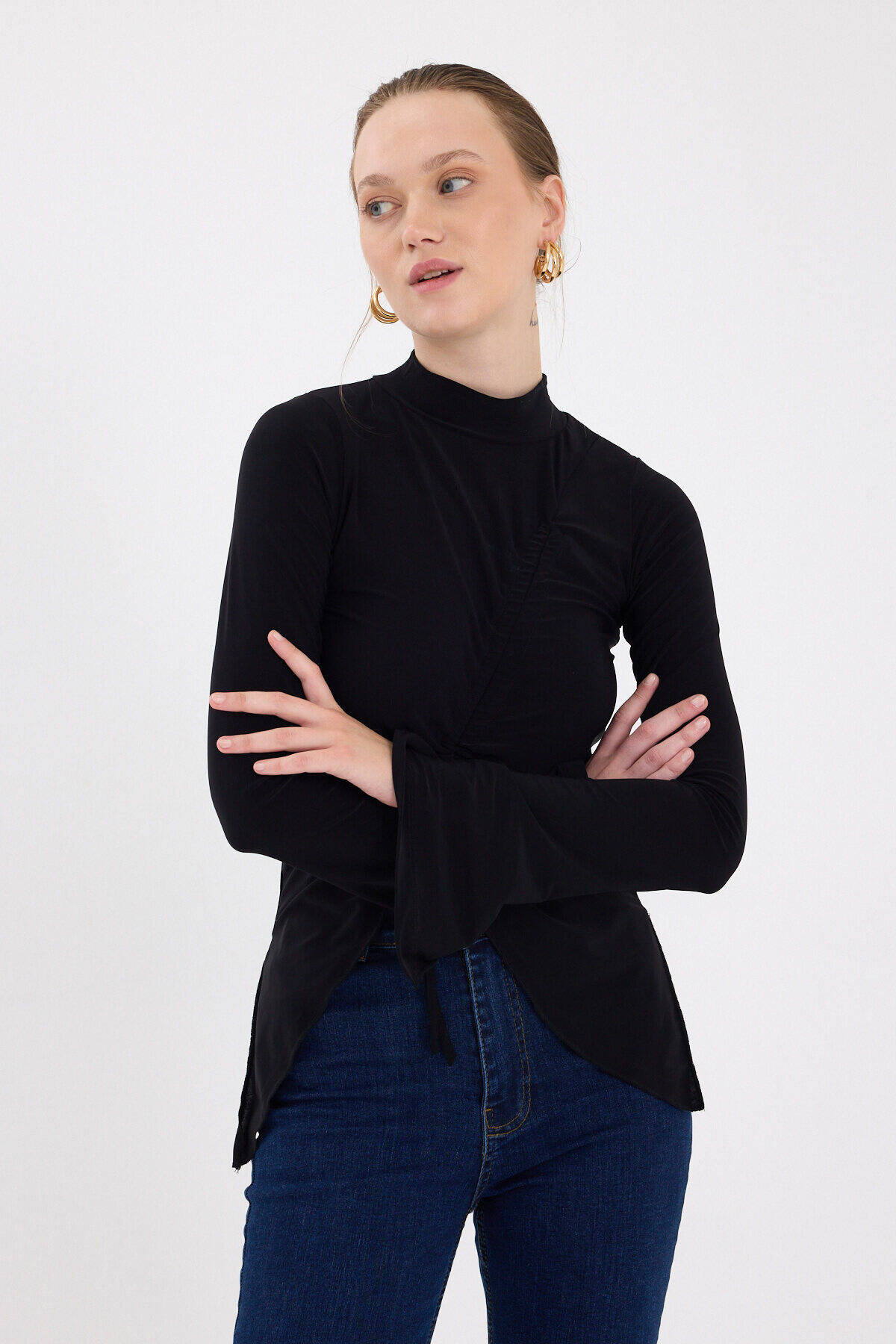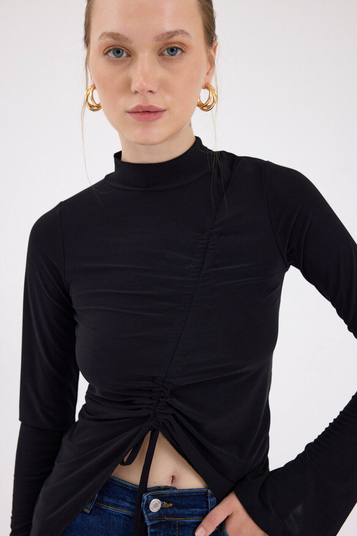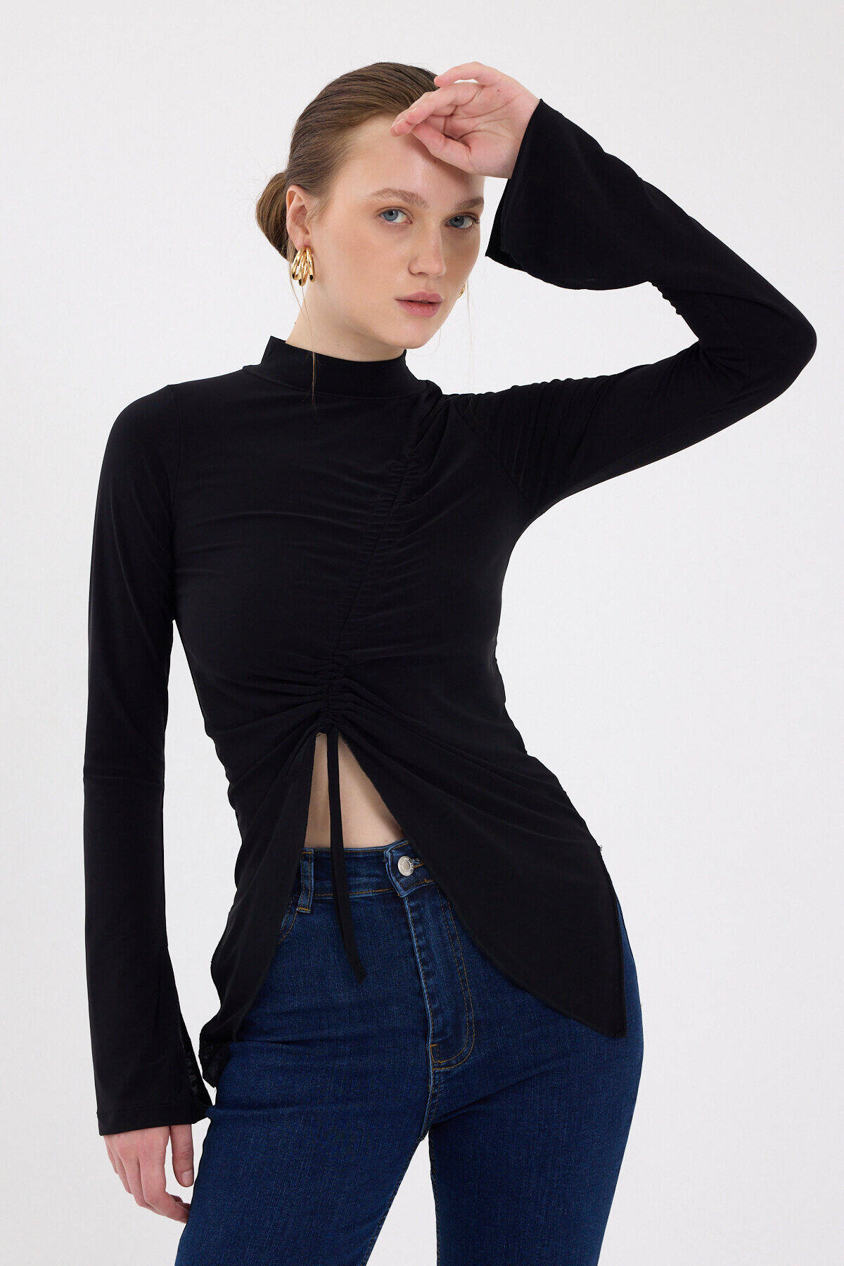 Siyah Büzgü Detaylı Balıkçı Yaka Bluz 2458