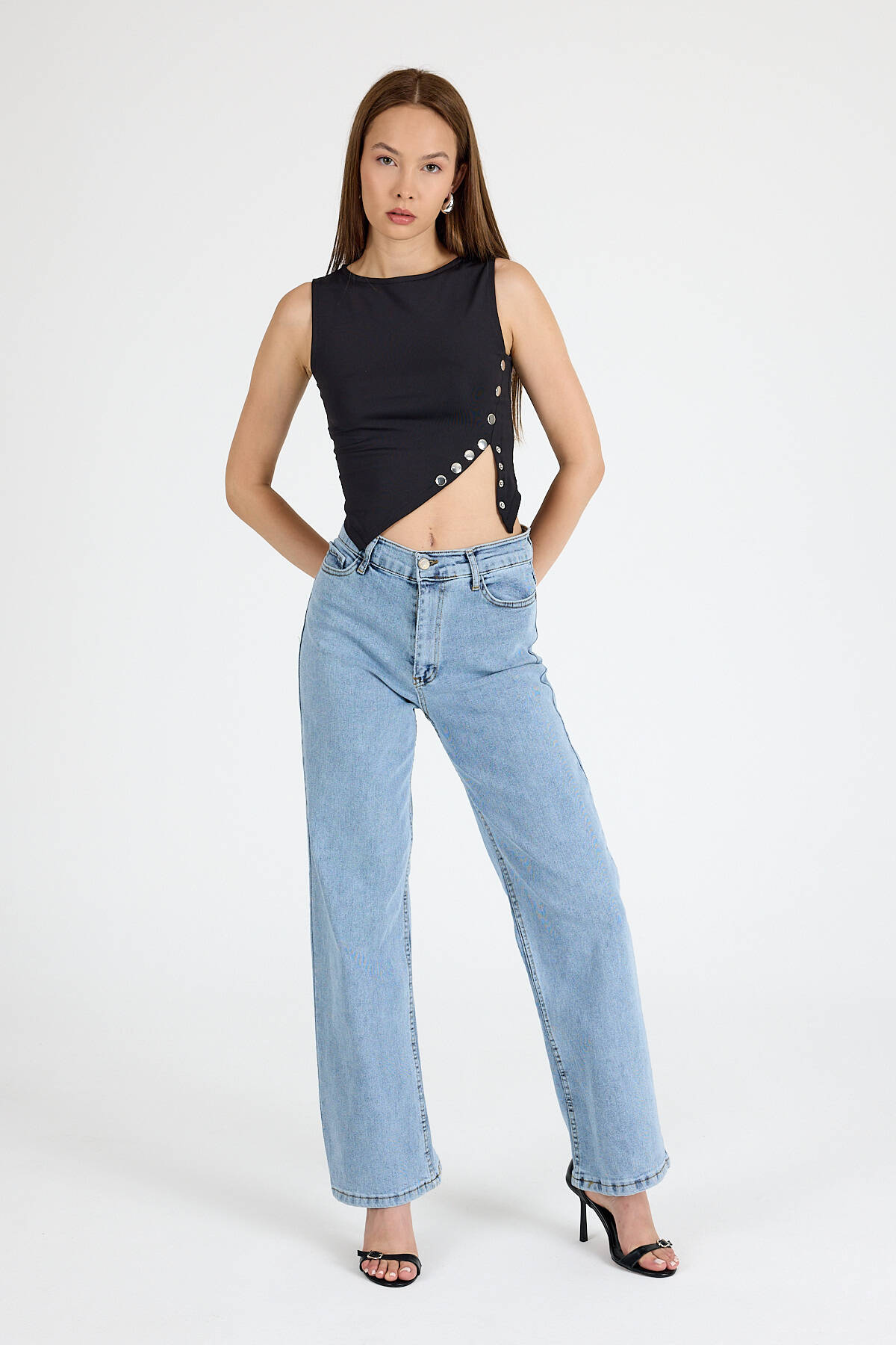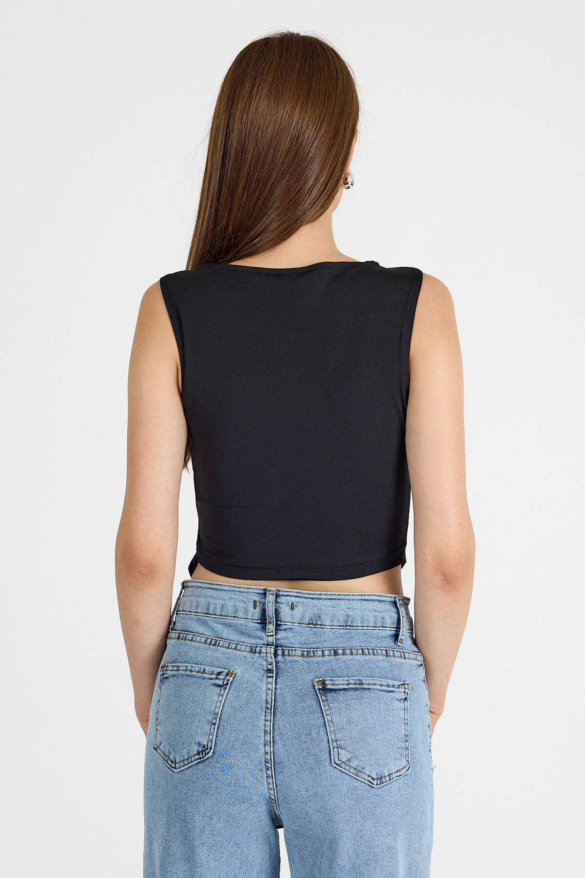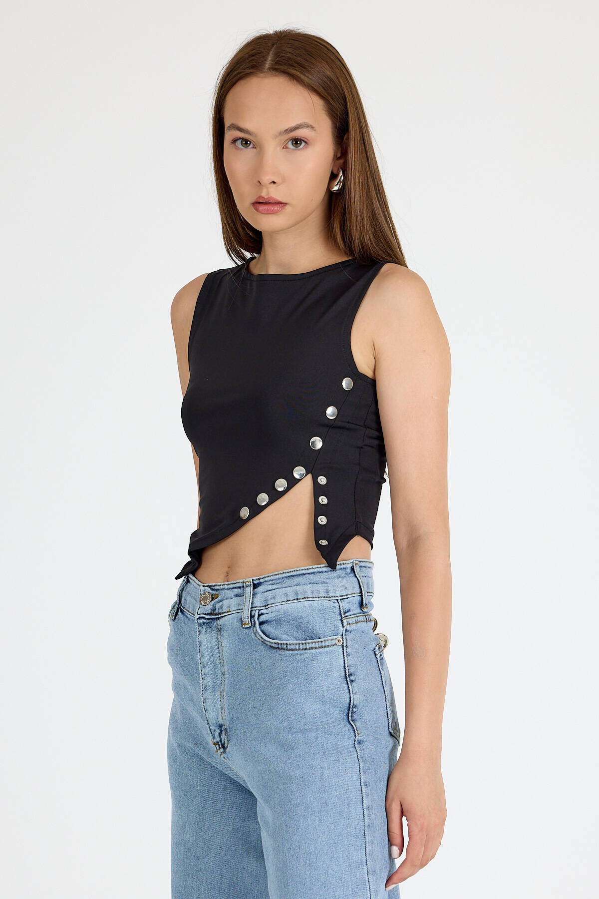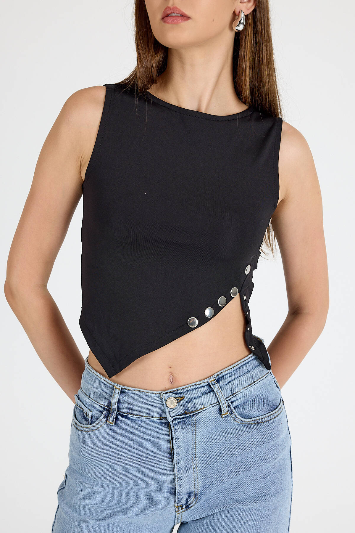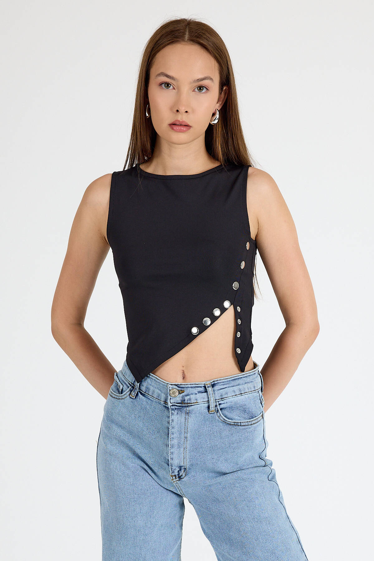 Siyah Çıt Detaylı Asimetrik Kesim Kolsuz Bluz 2494