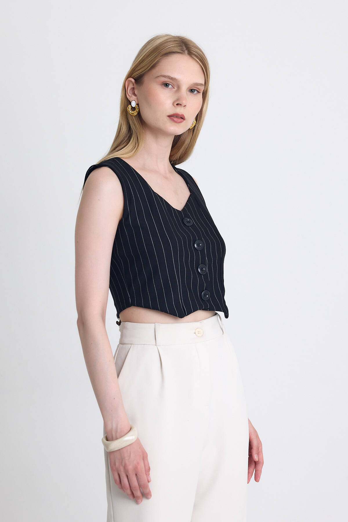 Siyah Çizgili V Yaka Pens Detaylı Düğmeli Crop Yelek 4288A