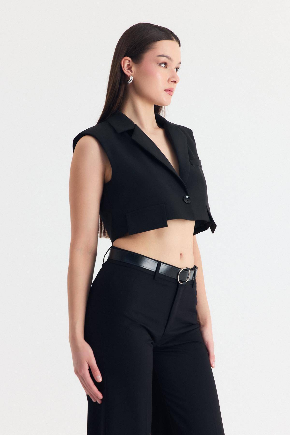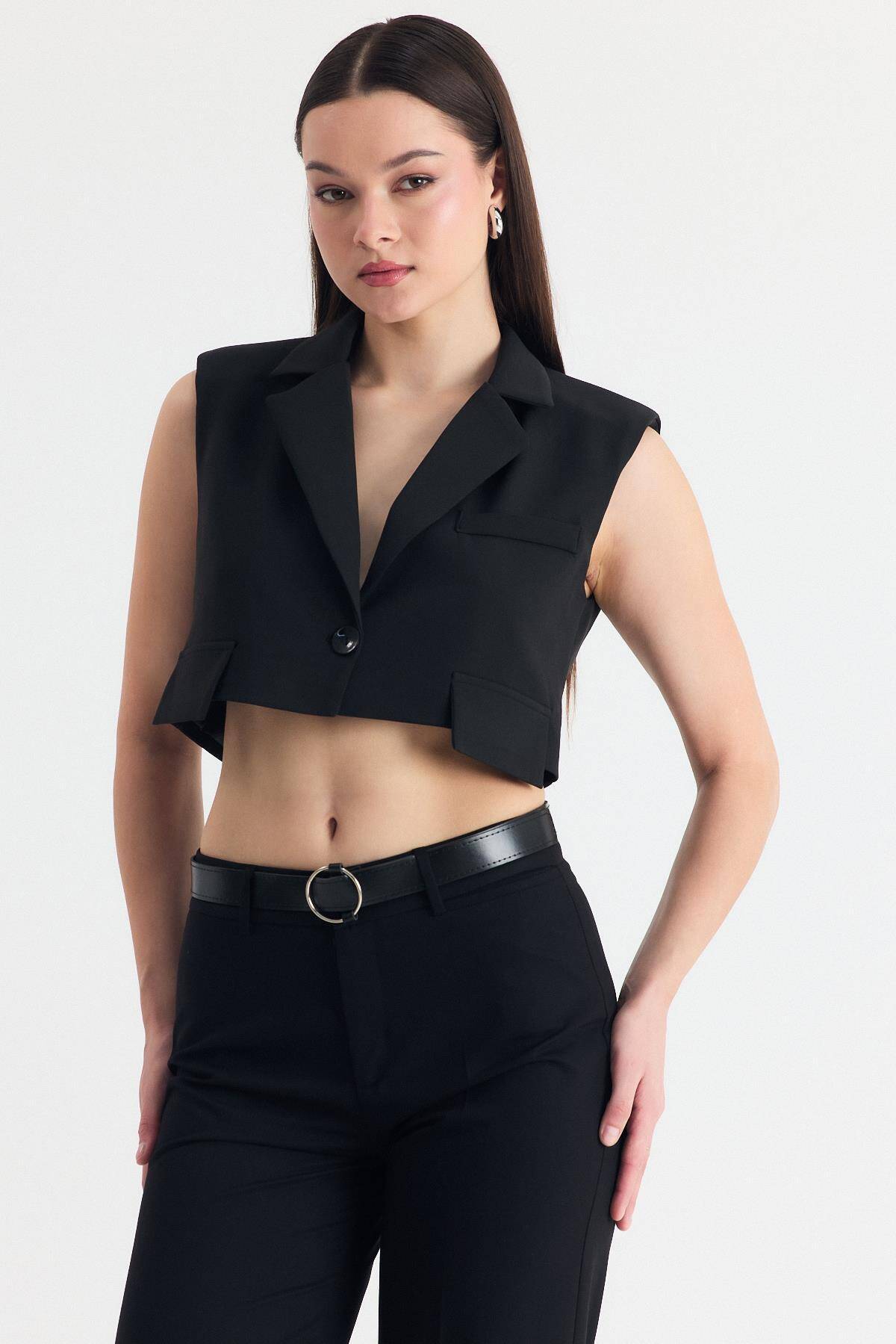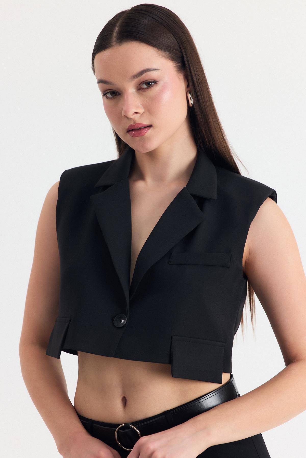 Siyah Crop Vatkalı Tek Düğme Cep Detay Yelek 6929