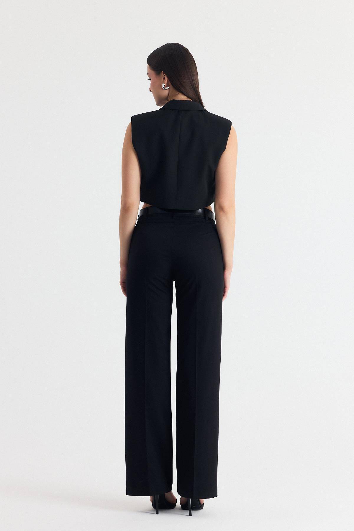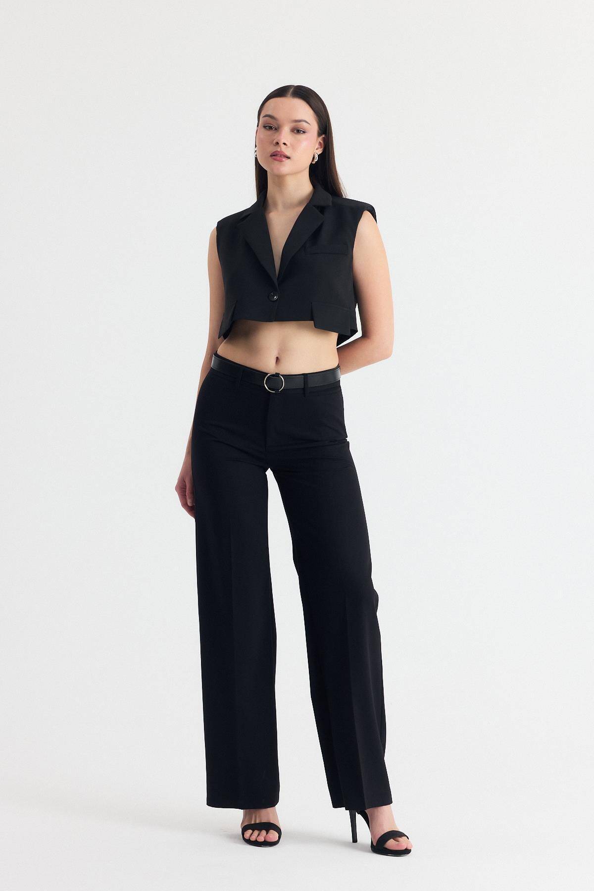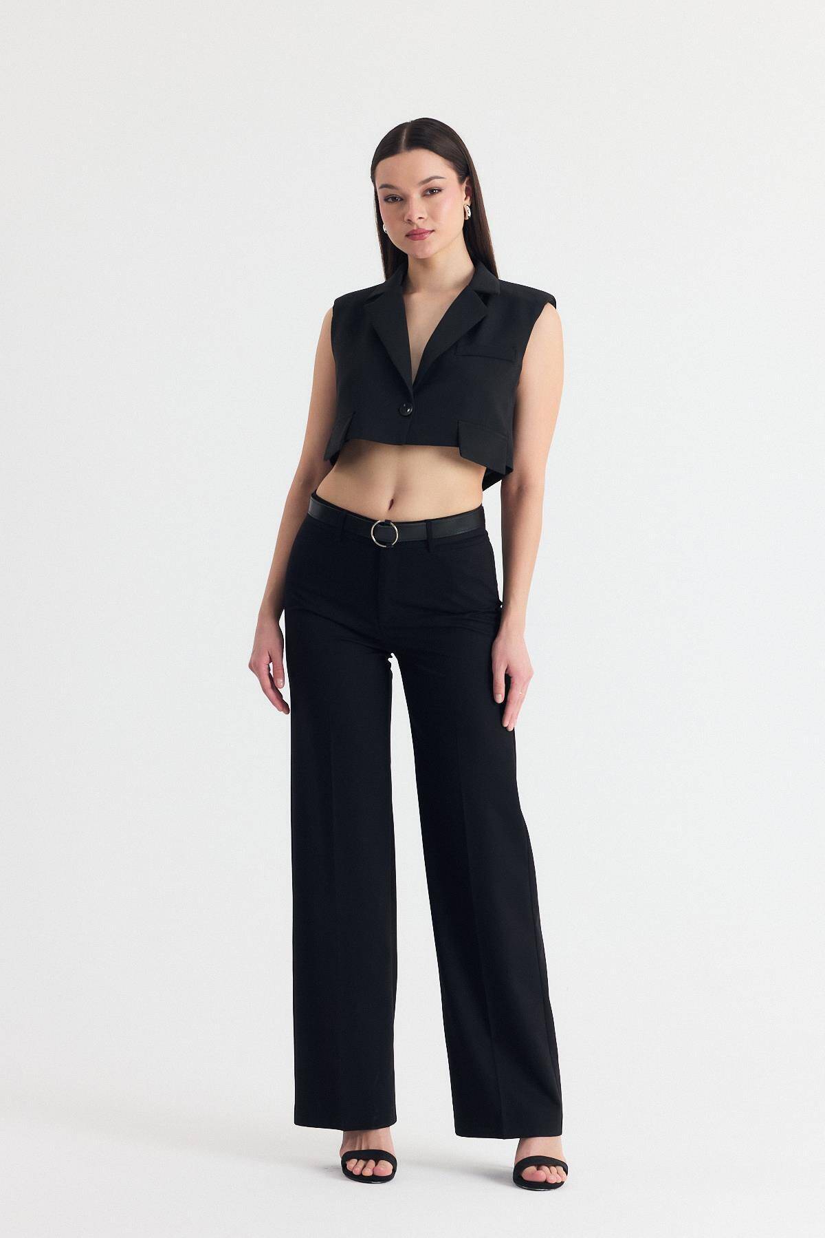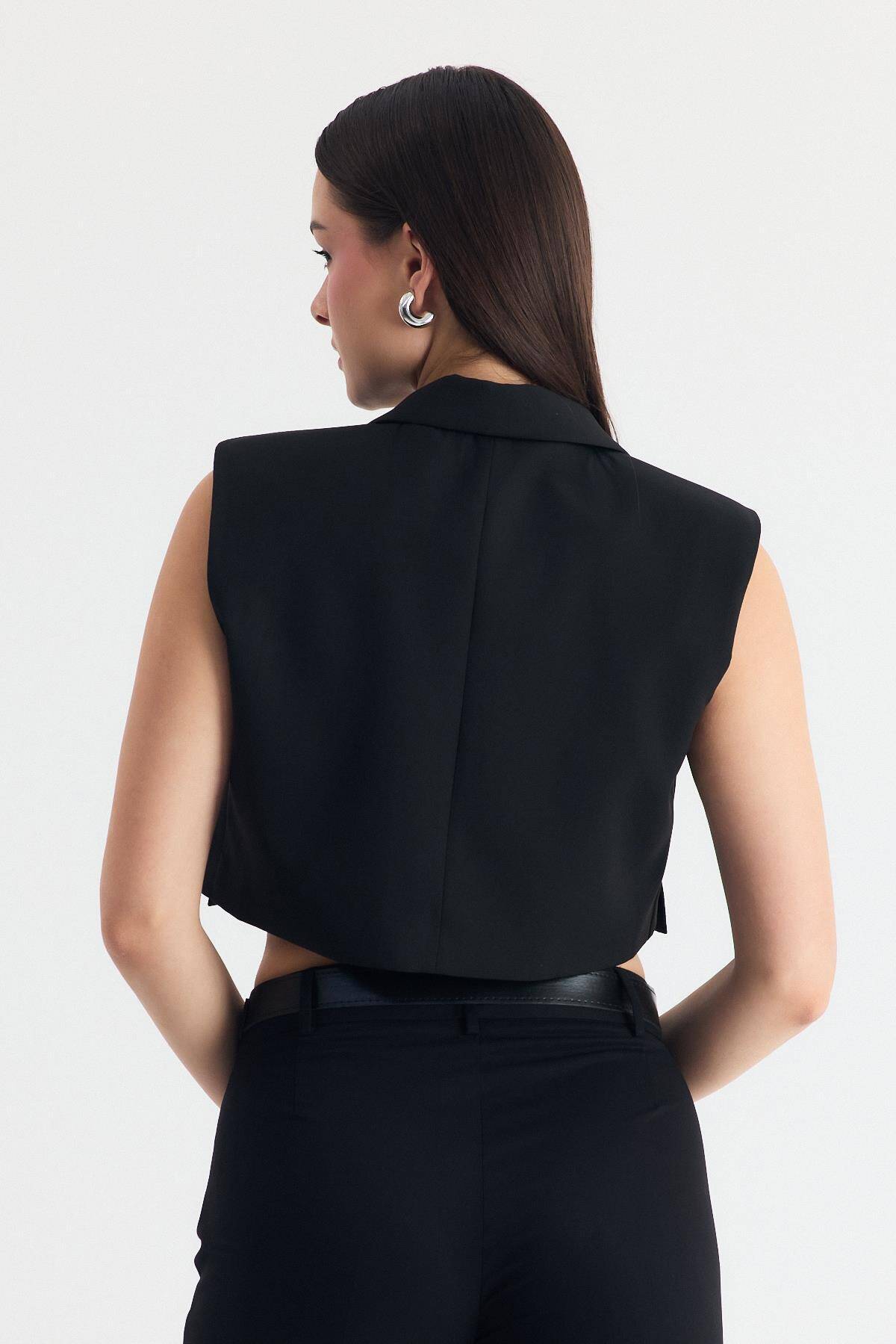 Siyah Crop Vatkalı Tek Düğme Cep Detay Yelek 6929