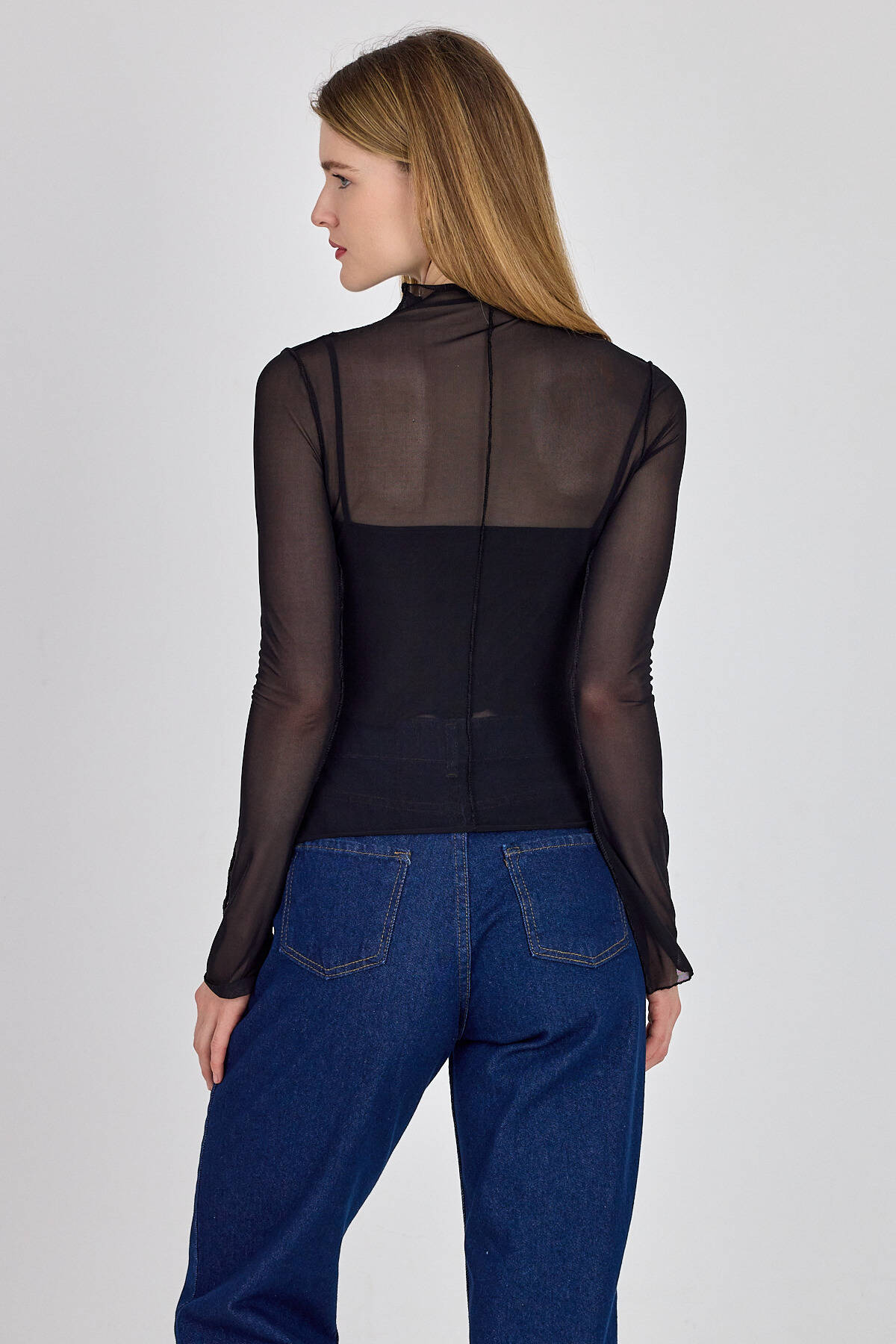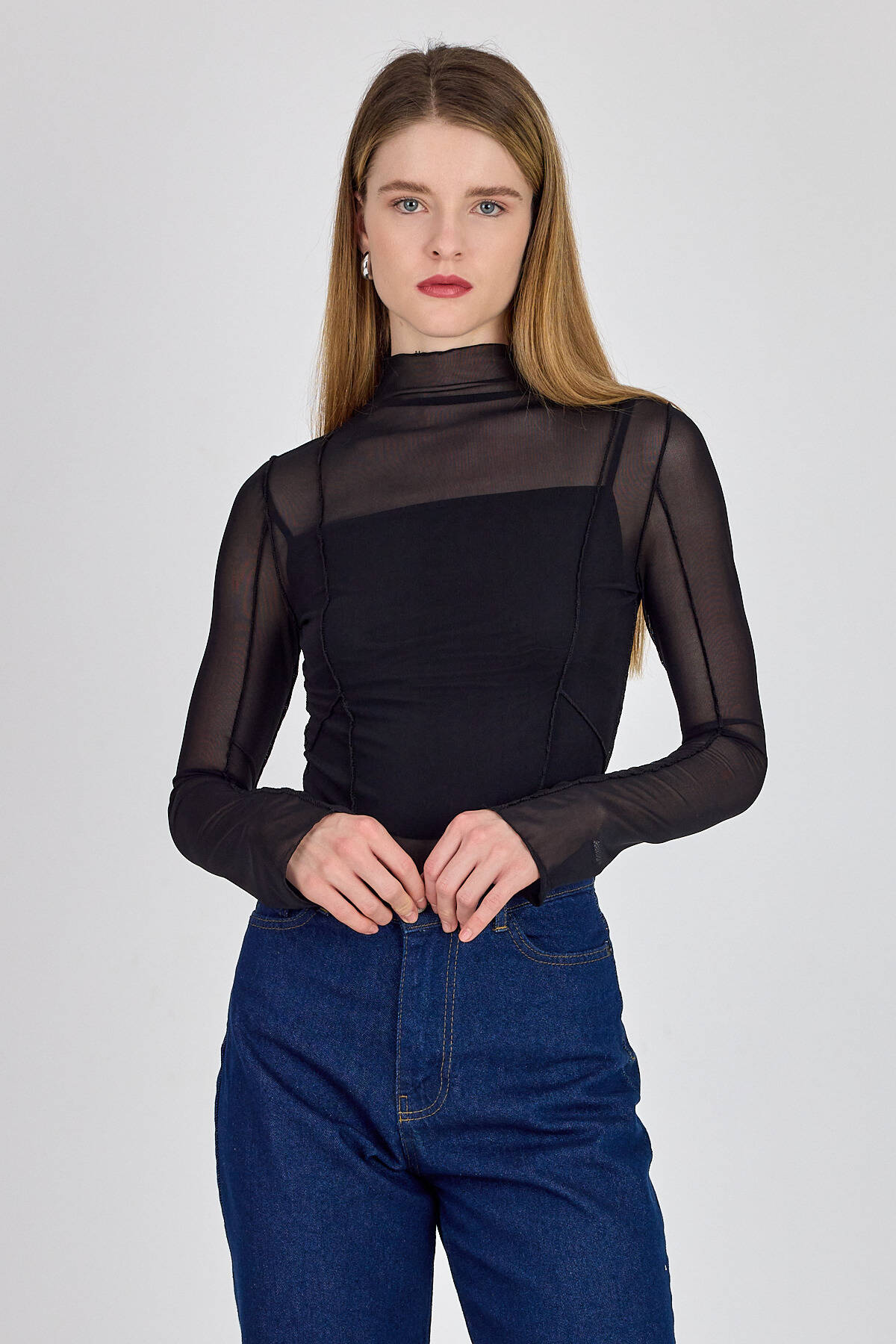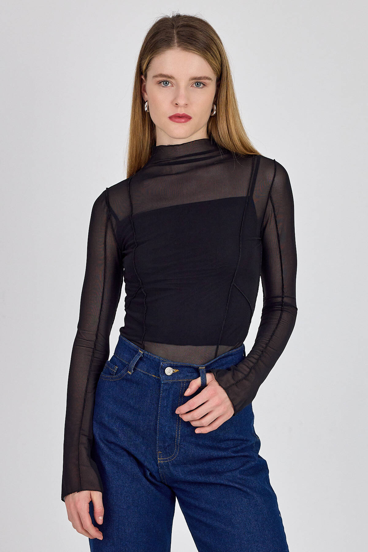 Siyah Dikiş Detaylı Uzun Kollu Tül Bluz 233163