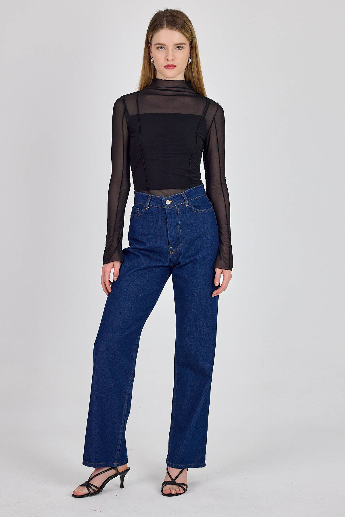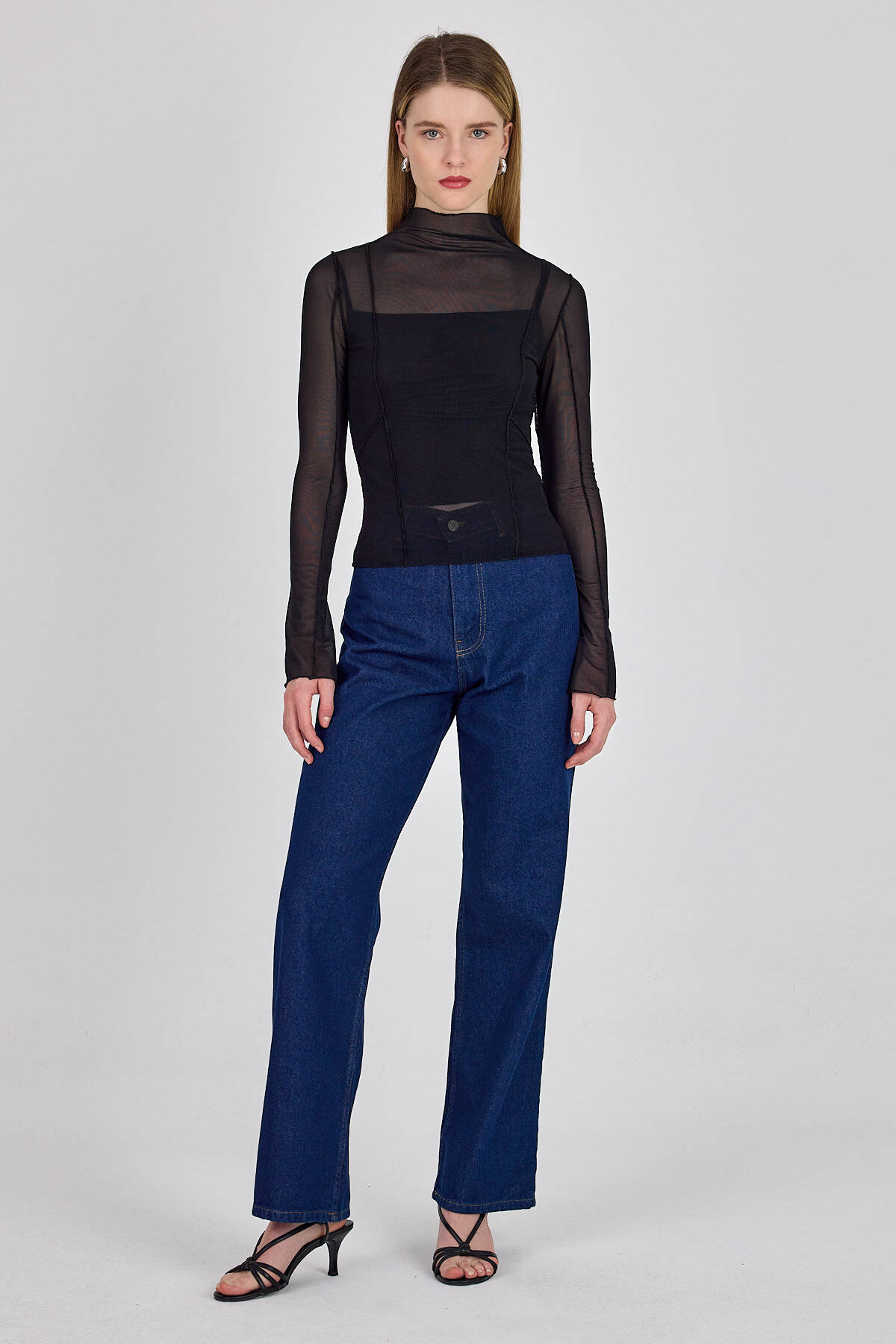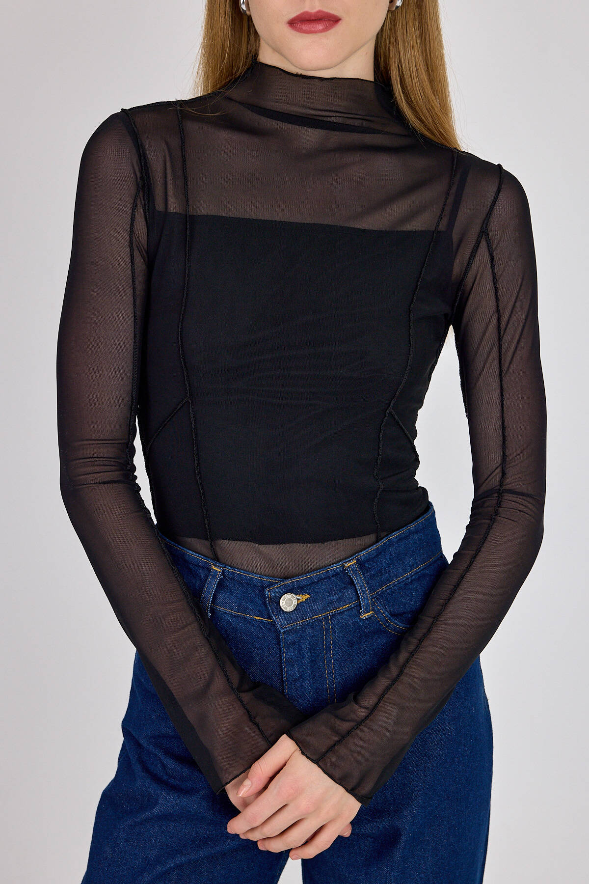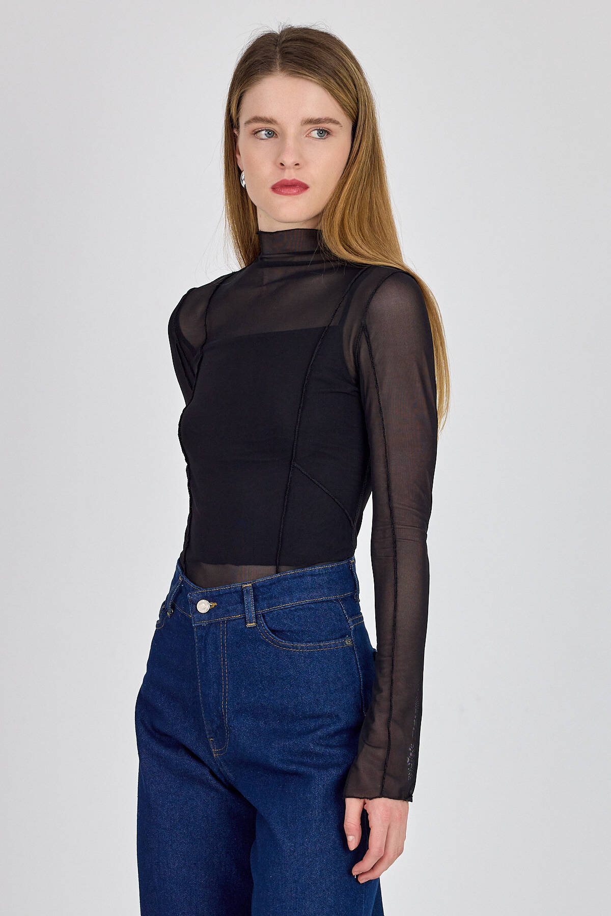 Siyah Dikiş Detaylı Uzun Kollu Tül Bluz 233163