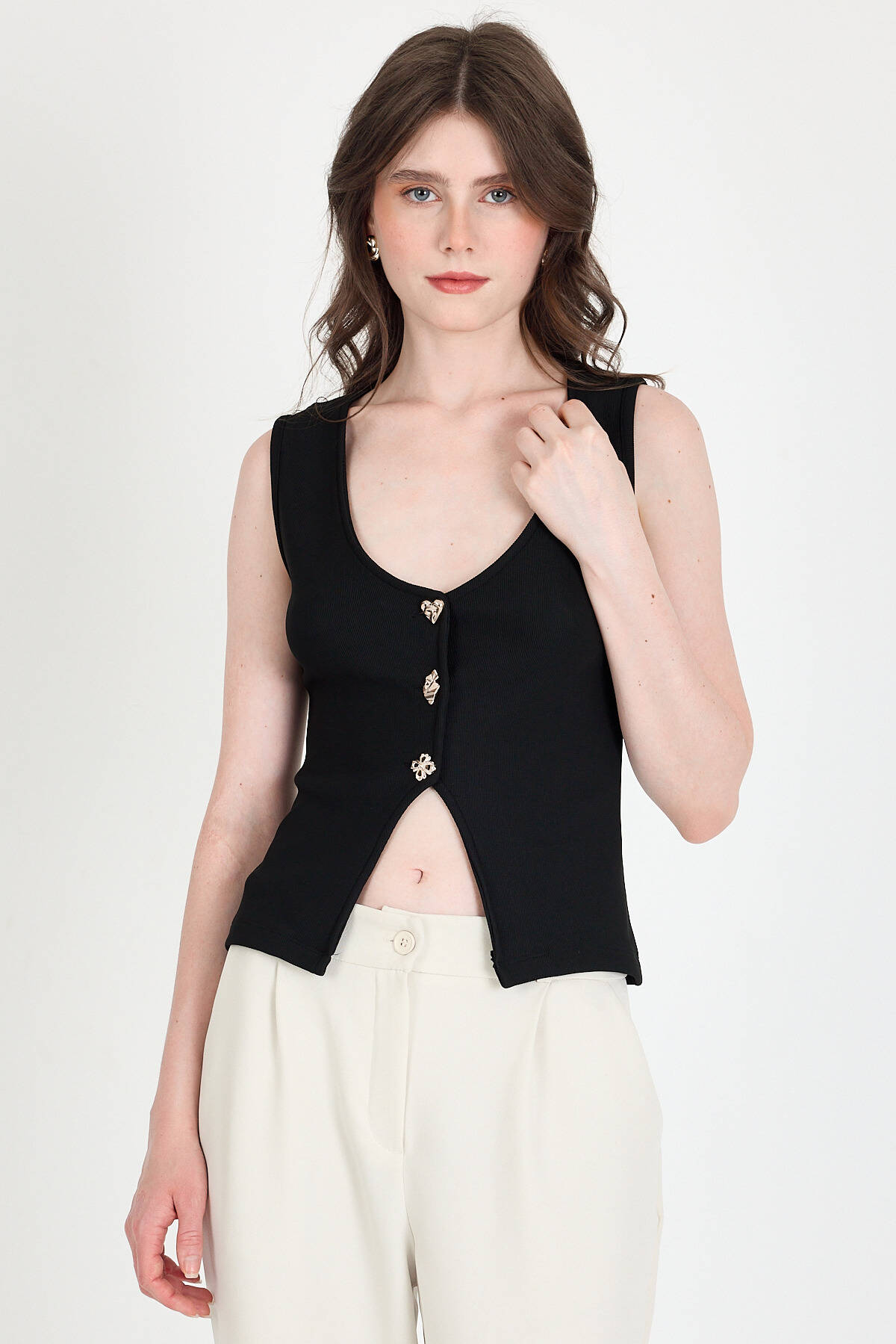 Siyah Düğme Detaylı V Yaka Bluz 018