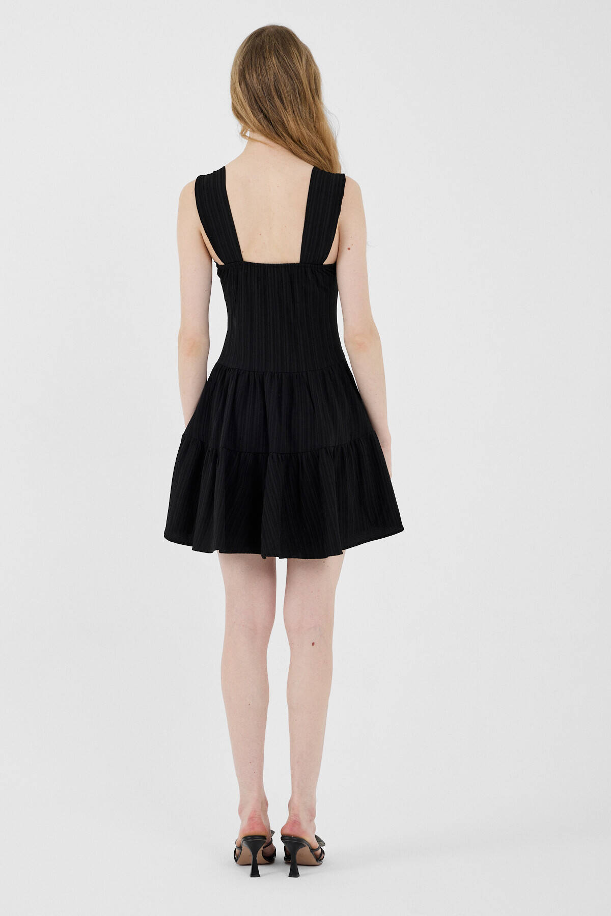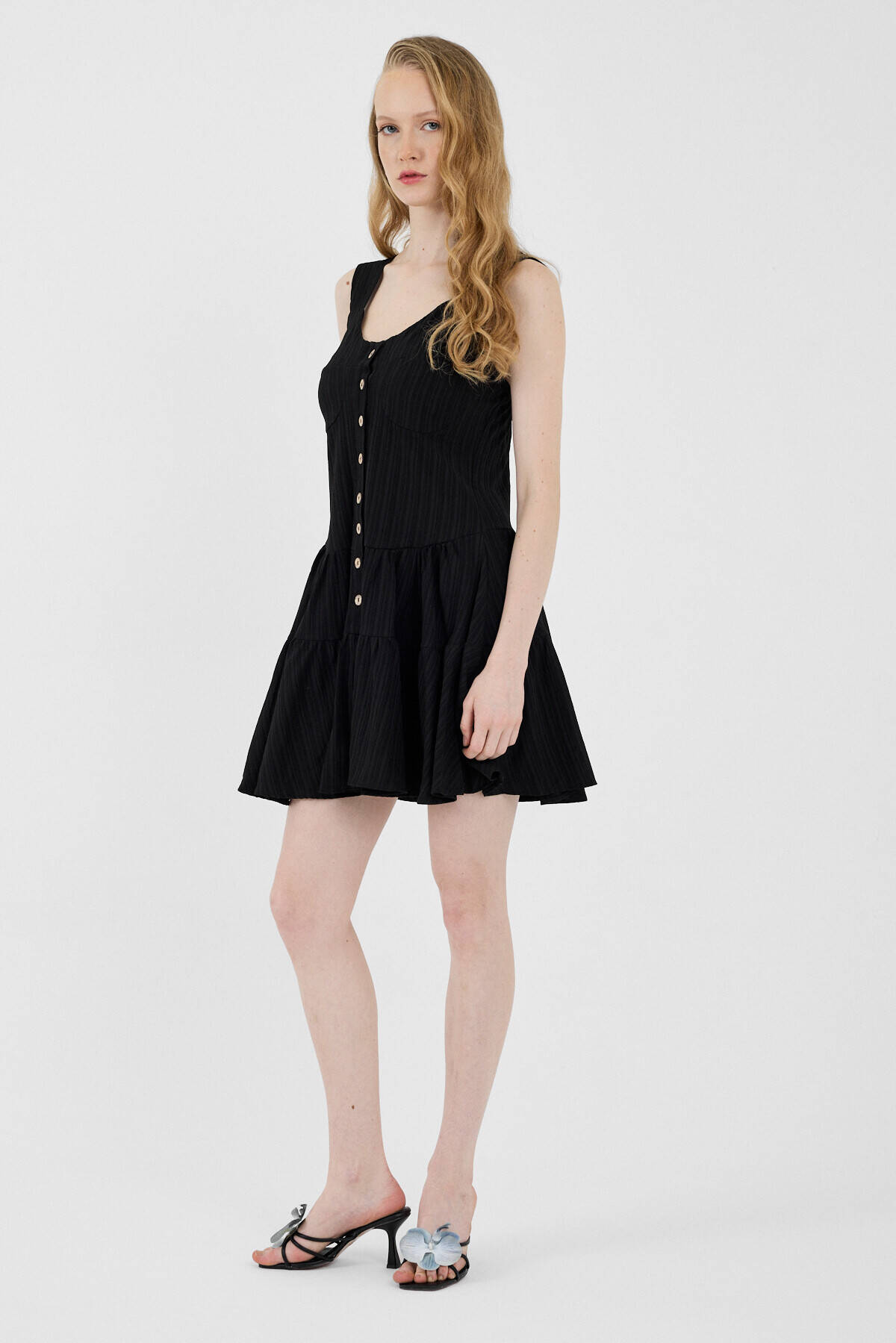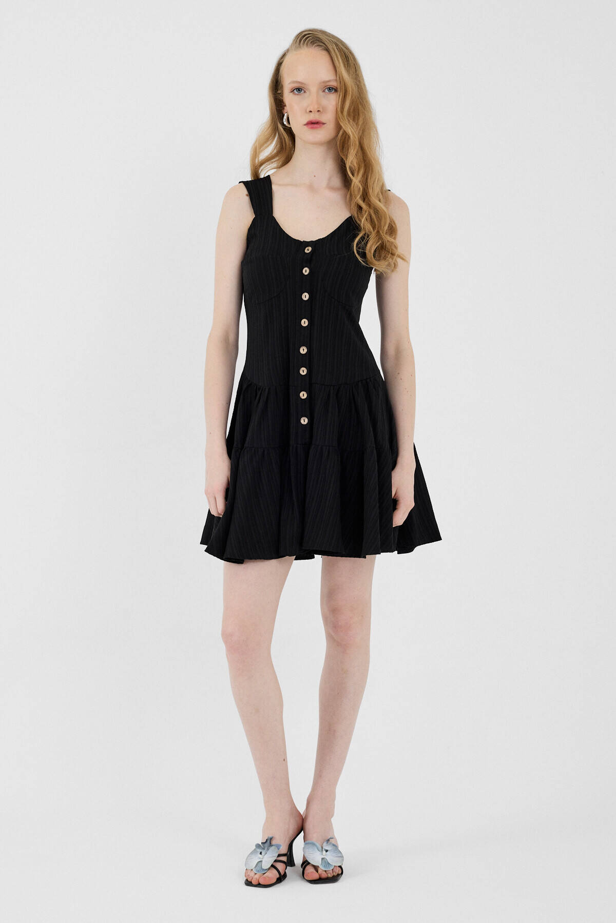Siyah Düğmeli Askılı Kat Etekli Mini Elbise 8042A