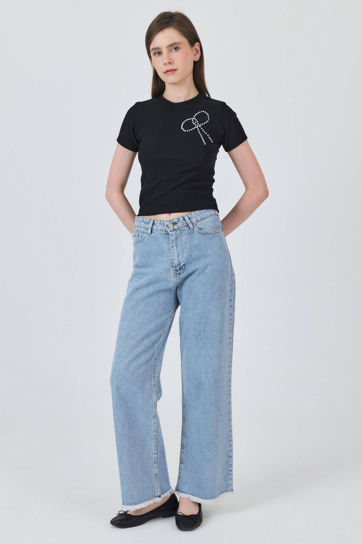 Siyah İnci Kurdele İşlemeli Crop Slim Fit Tişört 2229