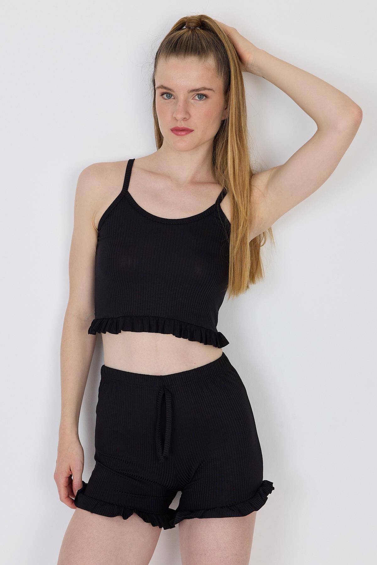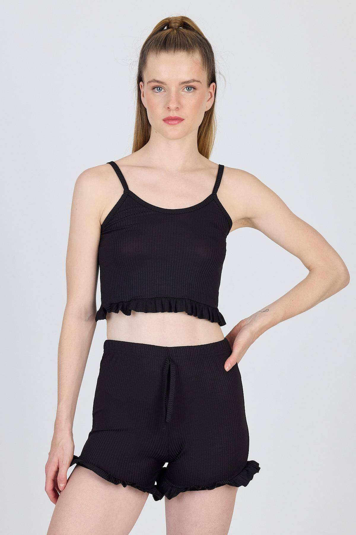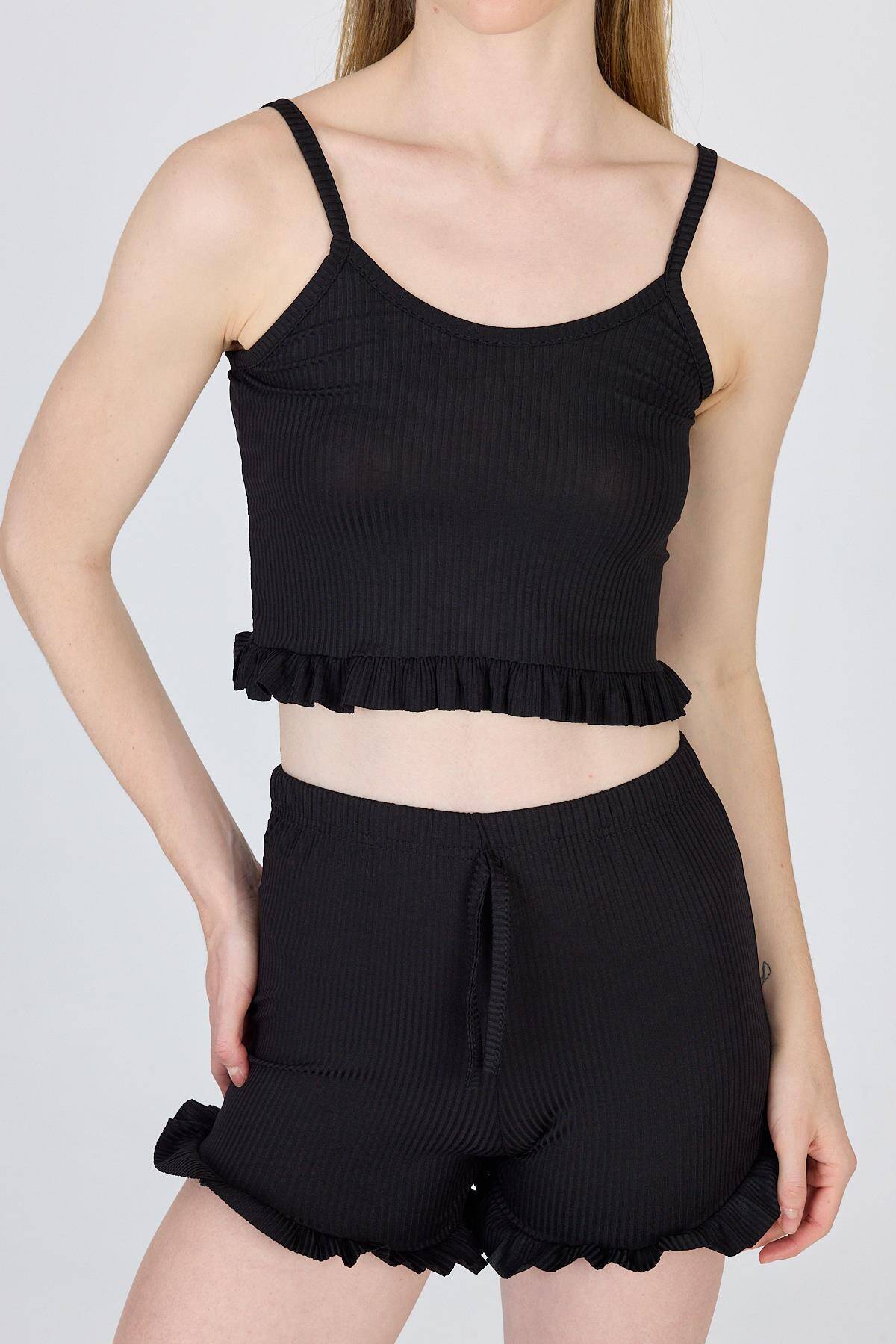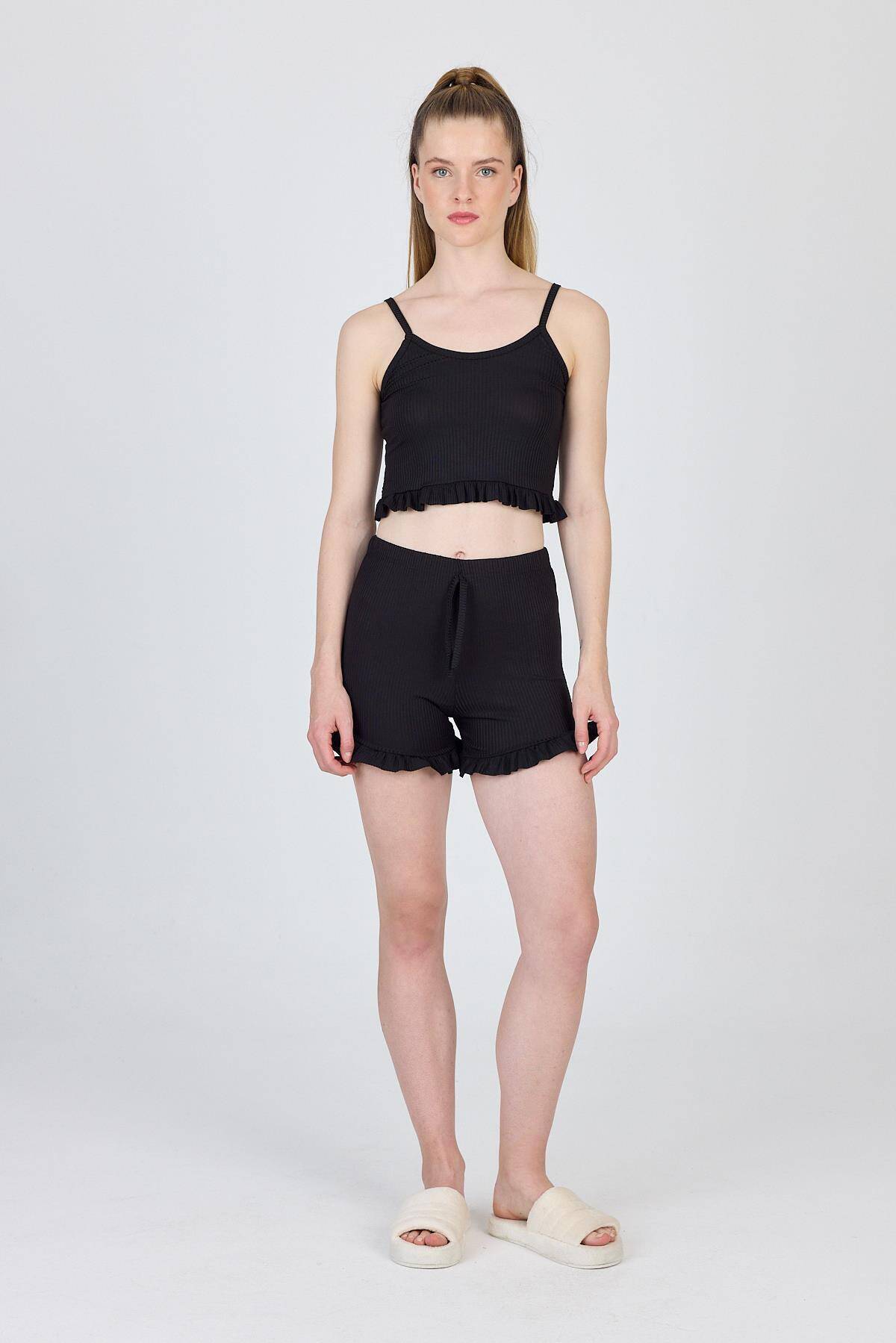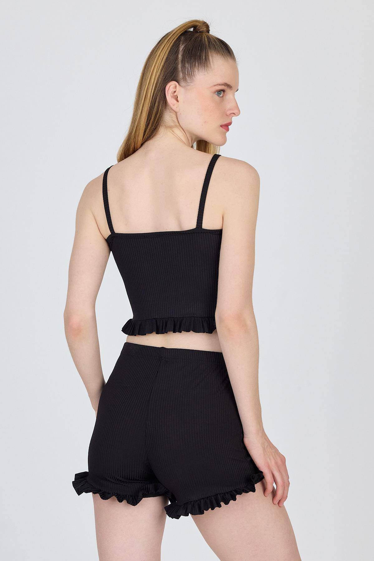 Siyah İp Askılı Fırfırlı Şortlu Takım 0703