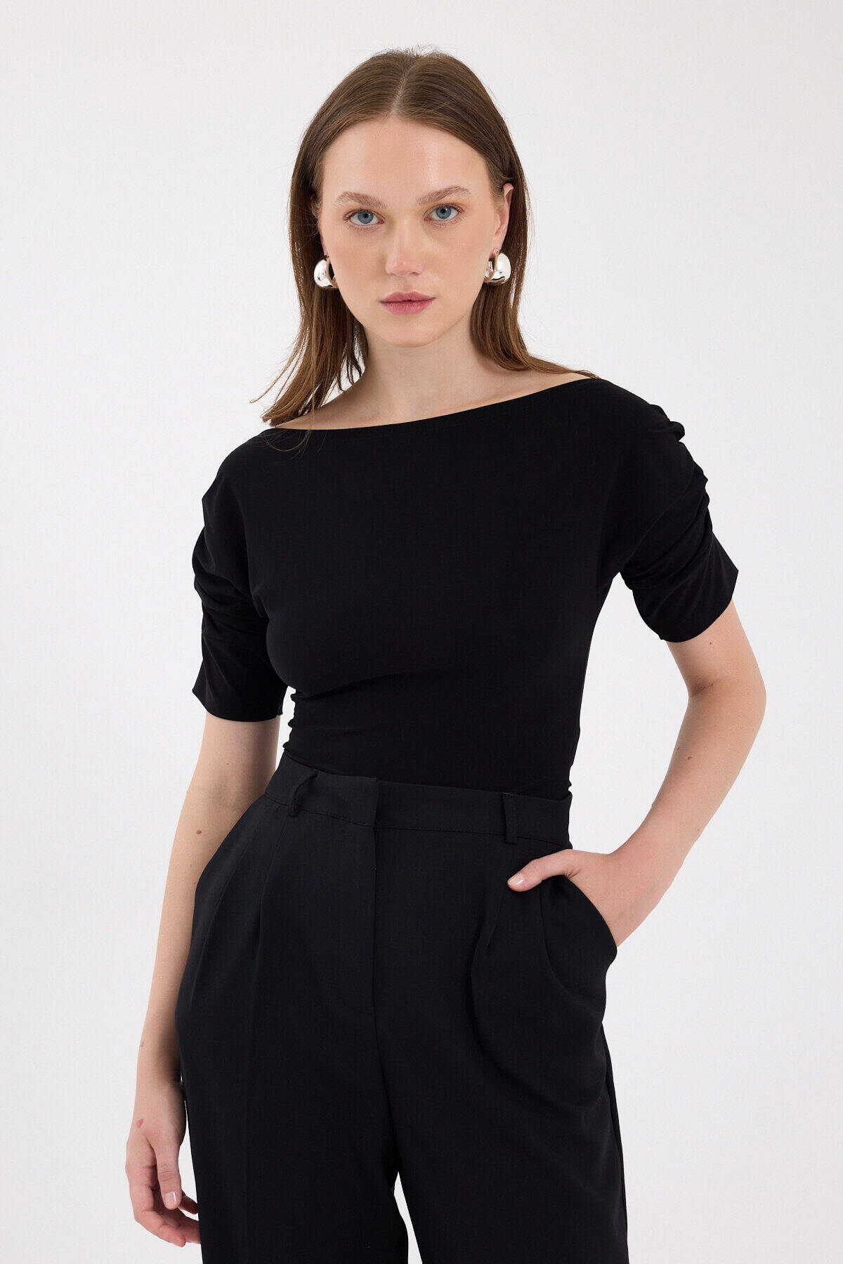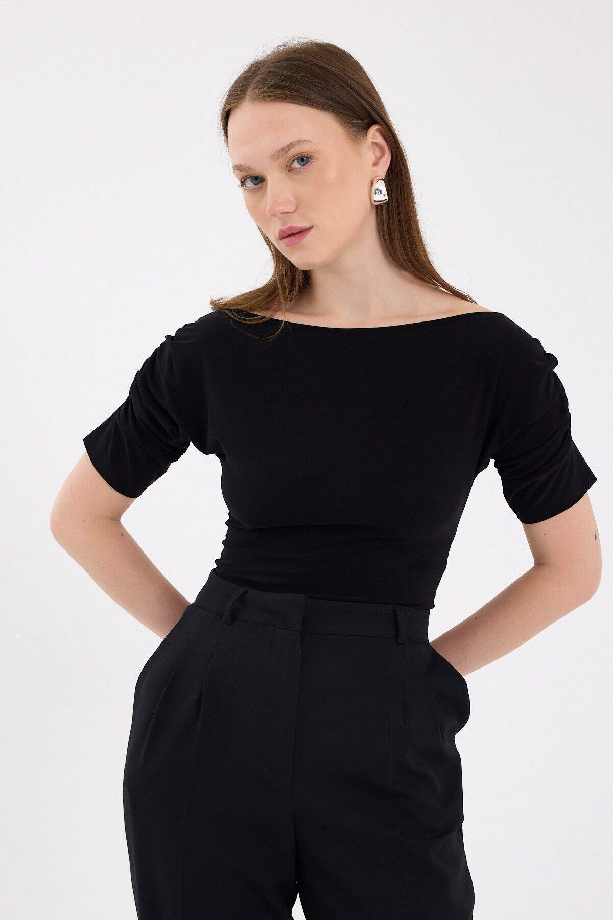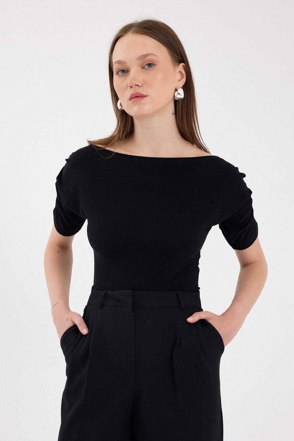 Siyah Kayık Yaka Kol Büzgülü Bluz 2515