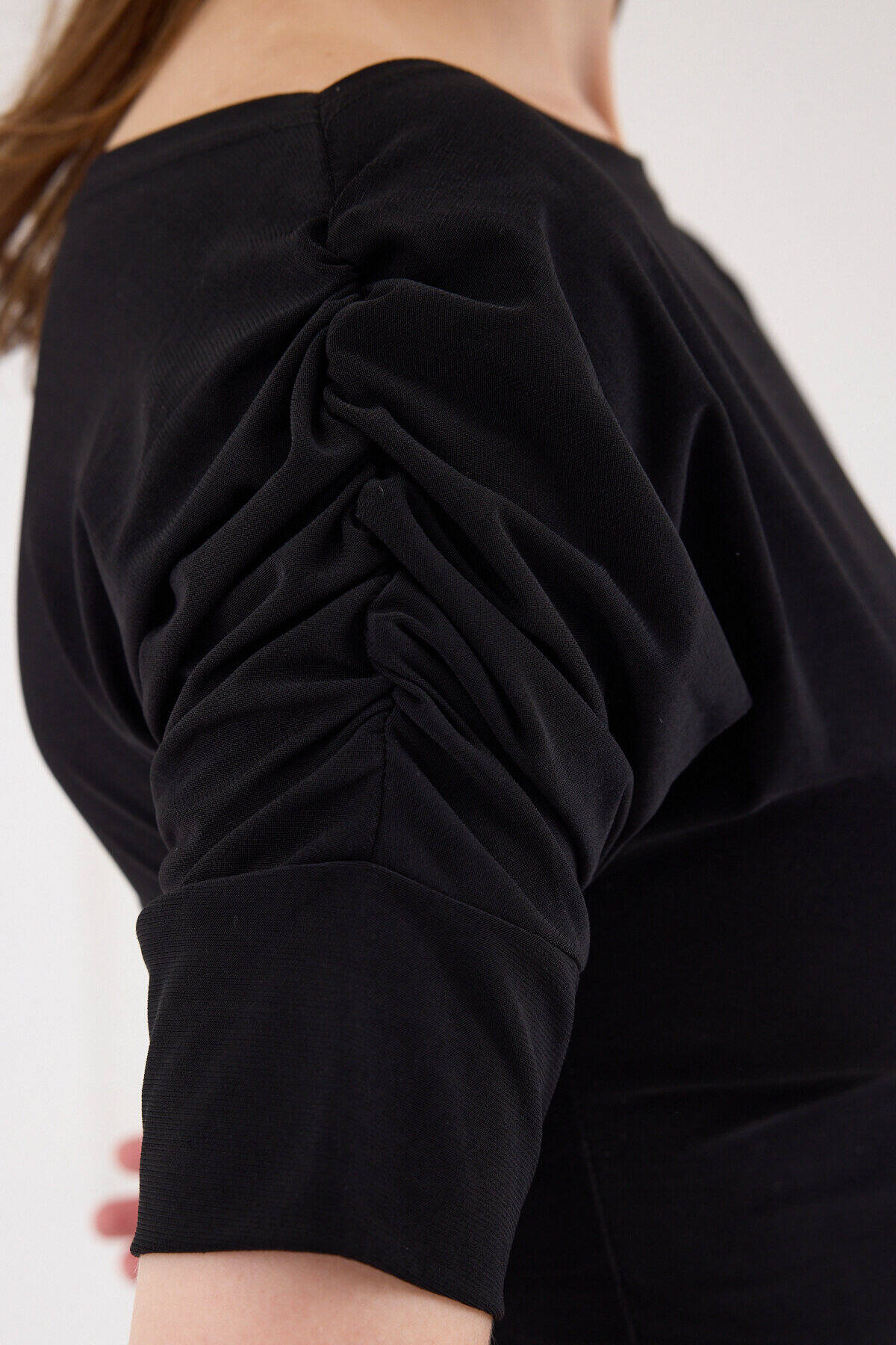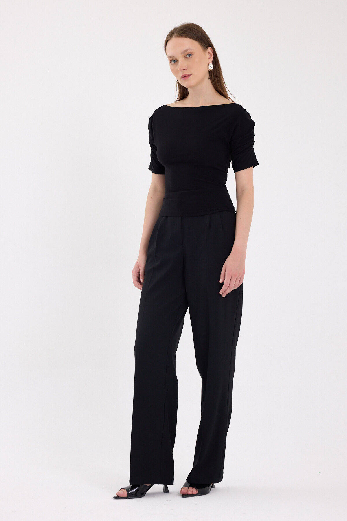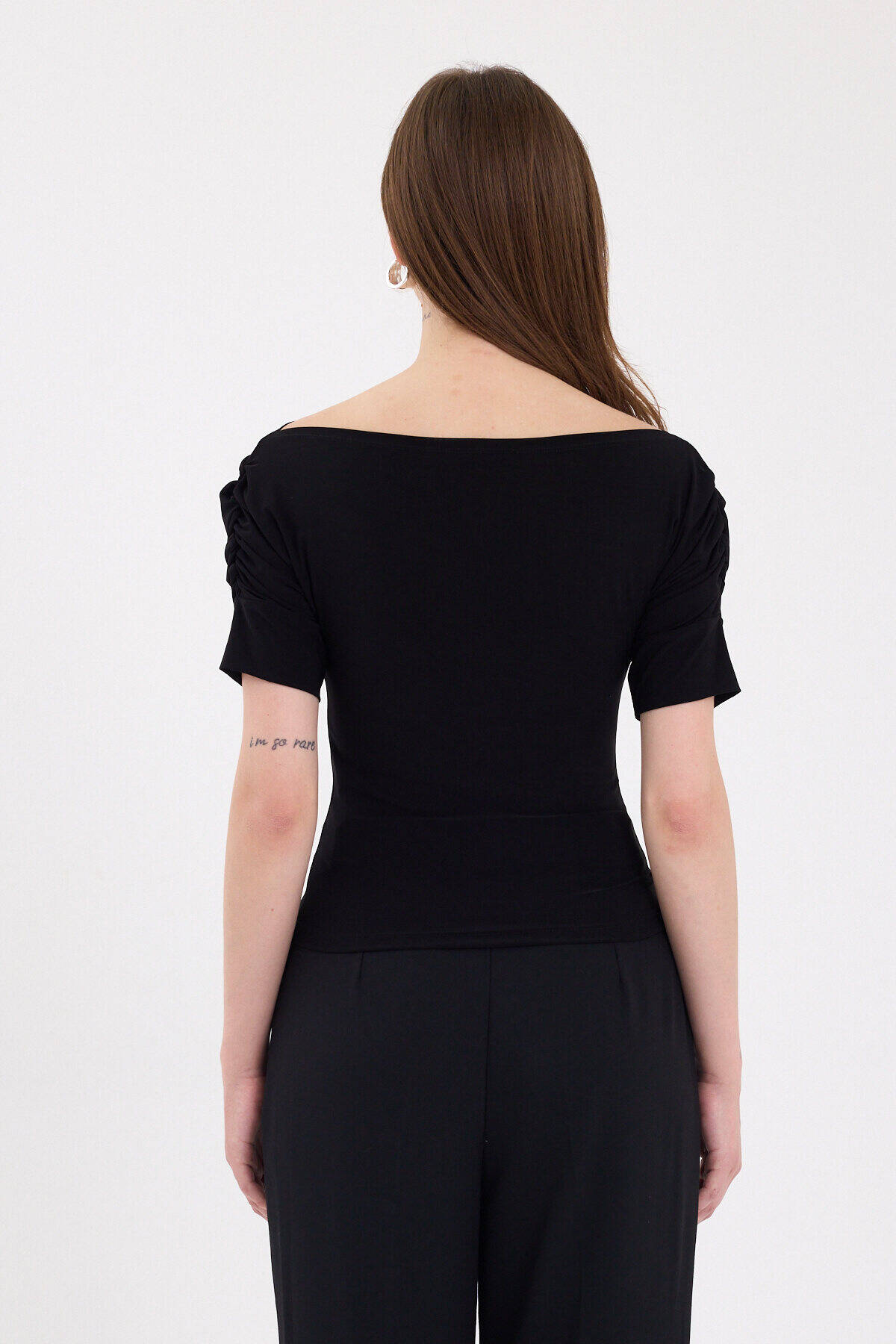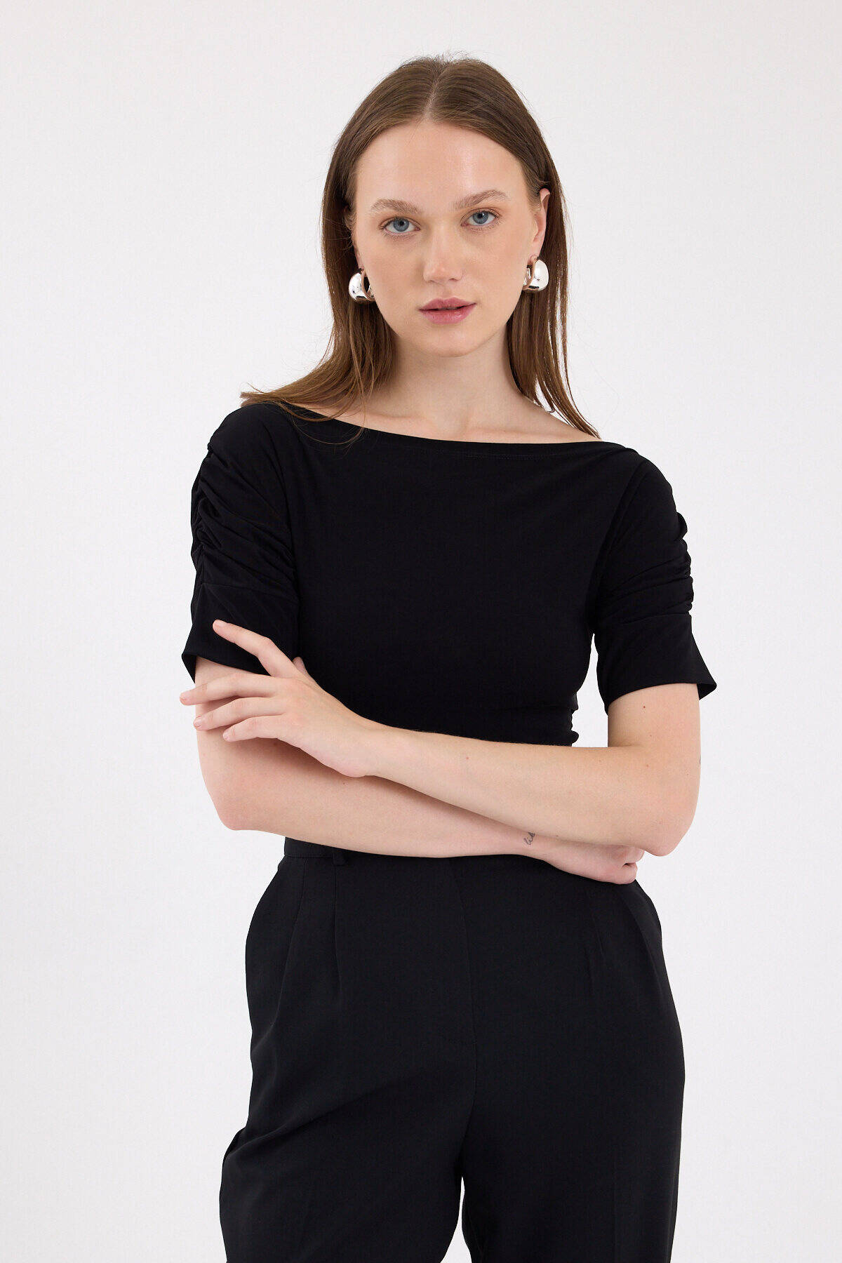 Siyah Kayık Yaka Kol Büzgülü Bluz 2515