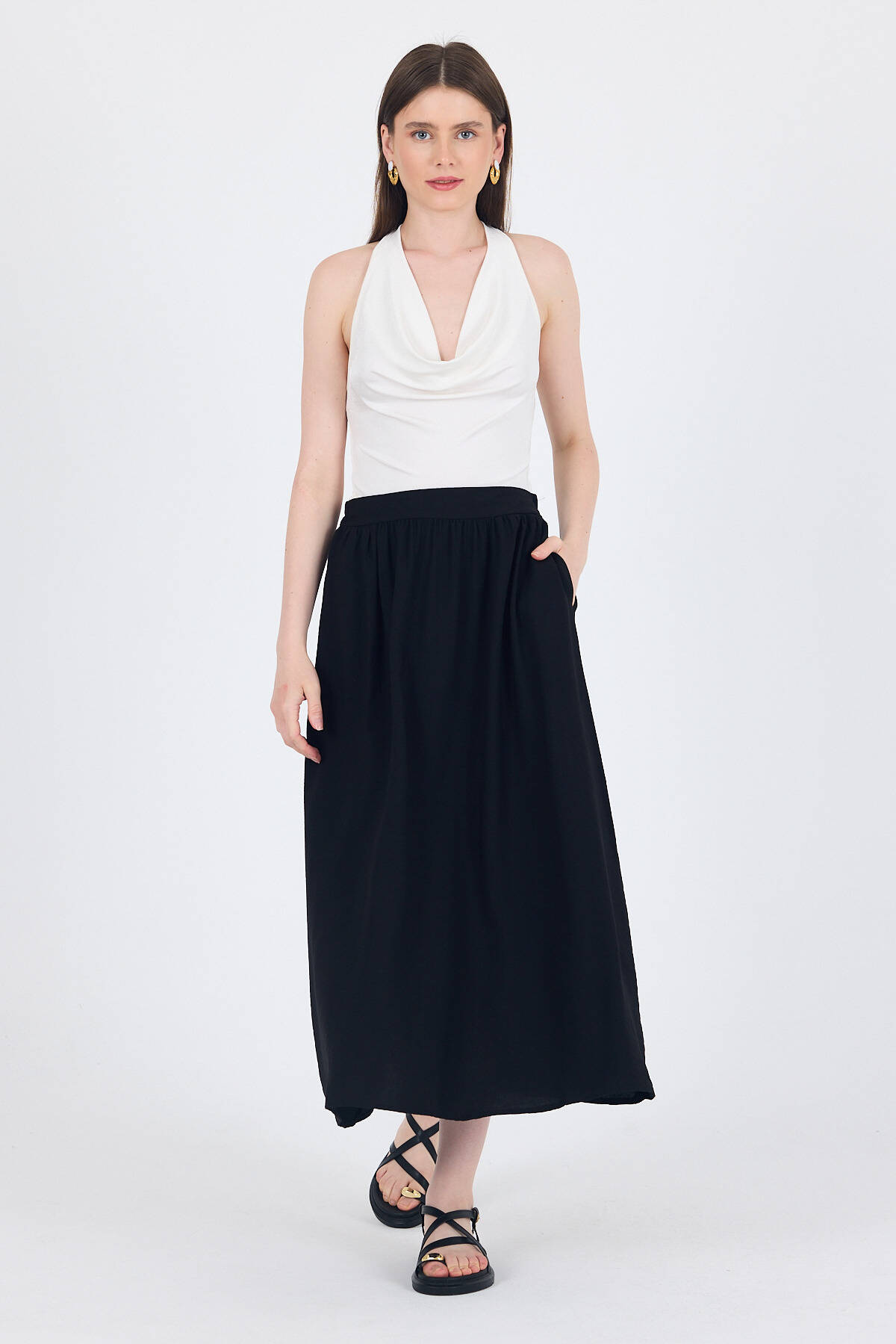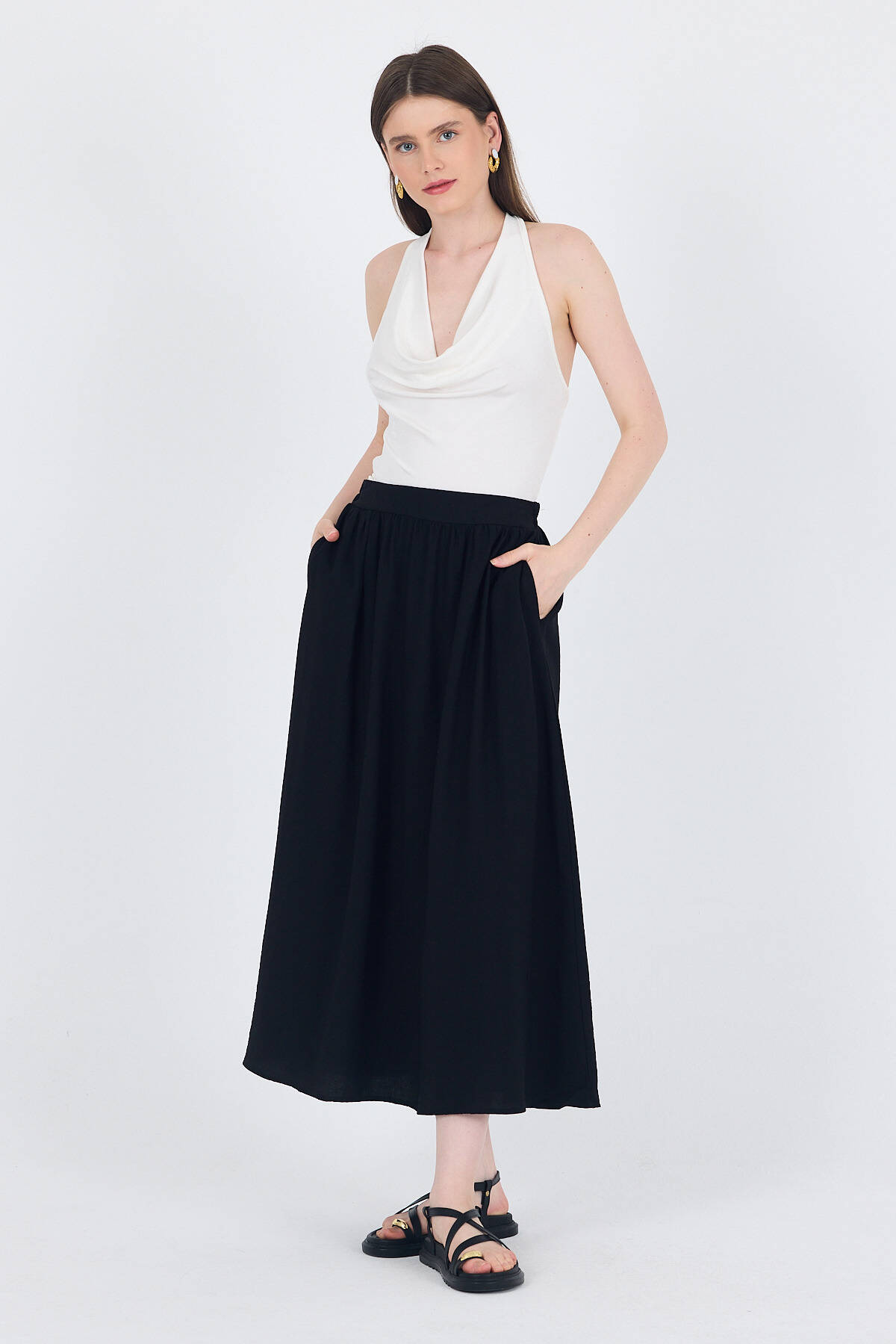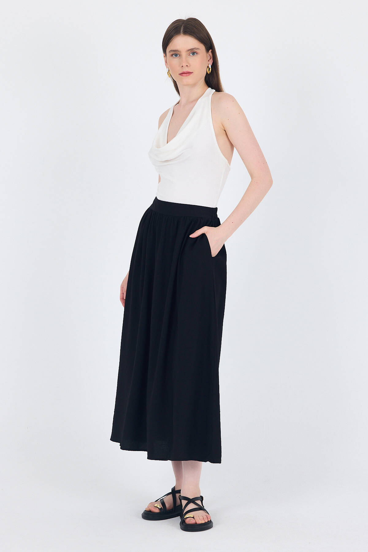 Siyah Keten Görünümlü Cep Detaylı Midi Etek 2344
