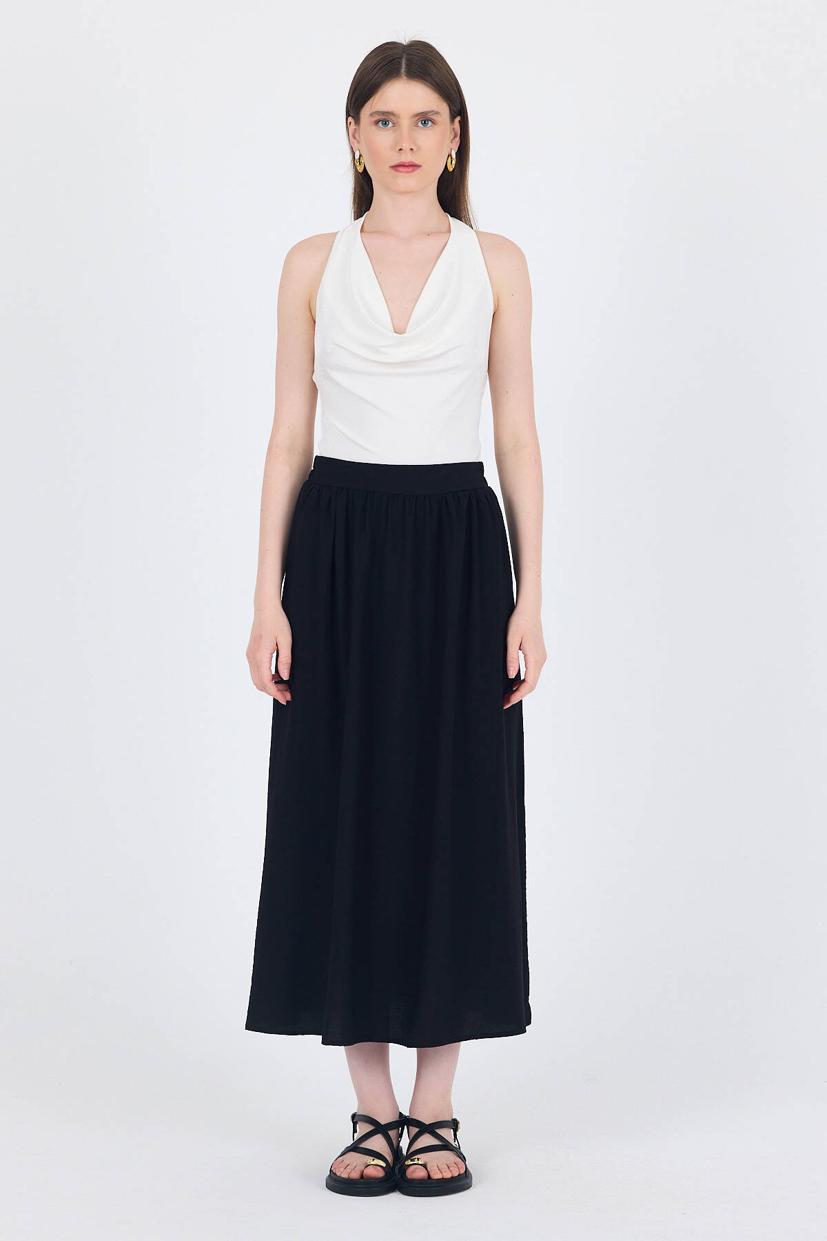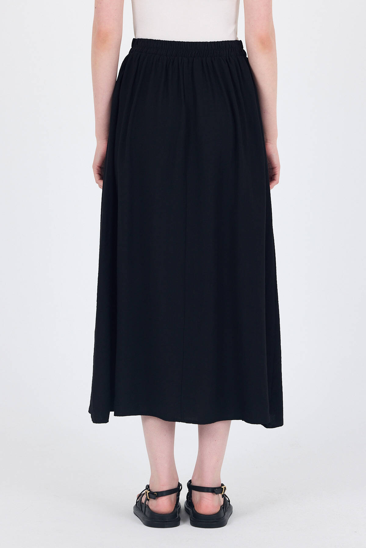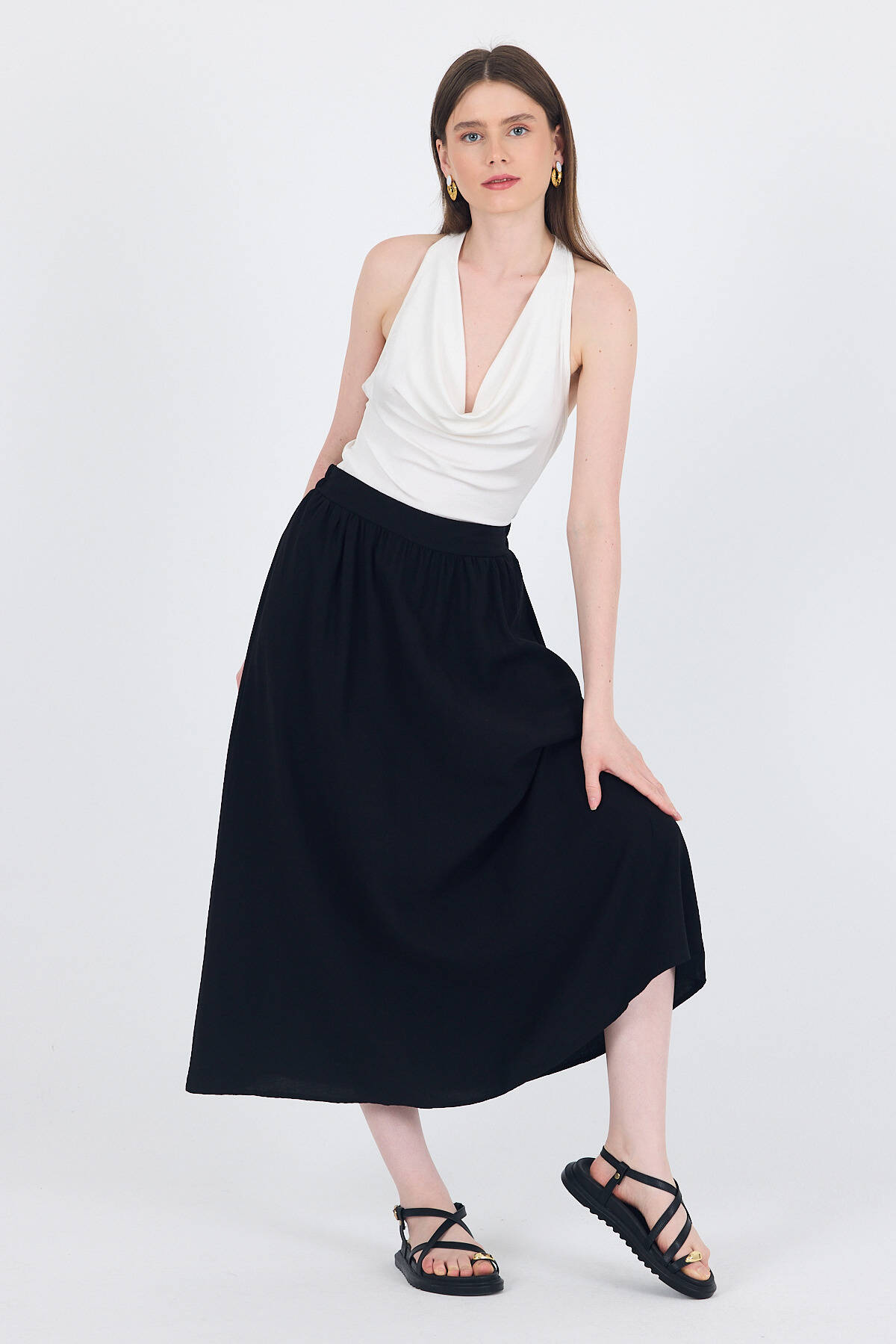 Siyah Keten Görünümlü Cep Detaylı Midi Etek 2344