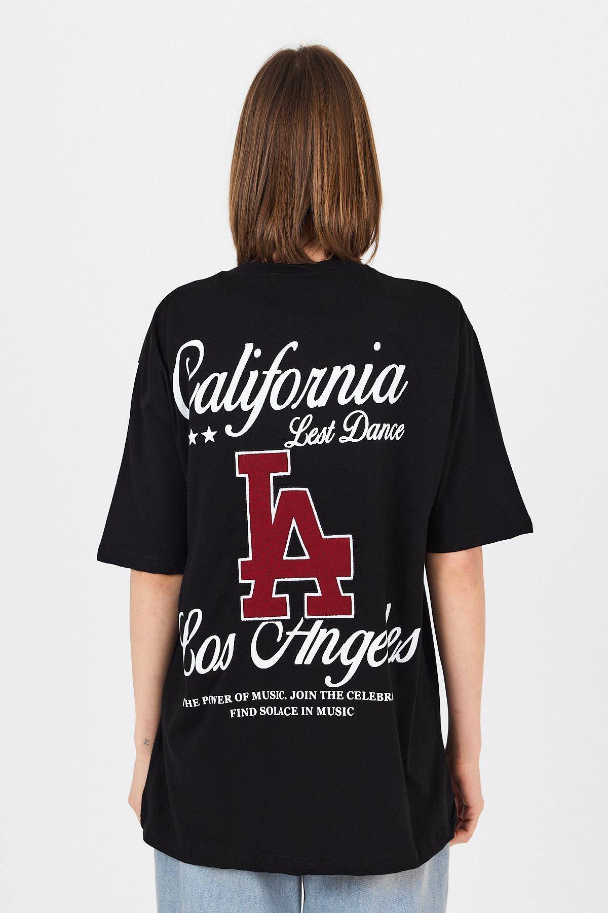 Siyah LA Baskılı California Yazılı Oversize Tişört 5197