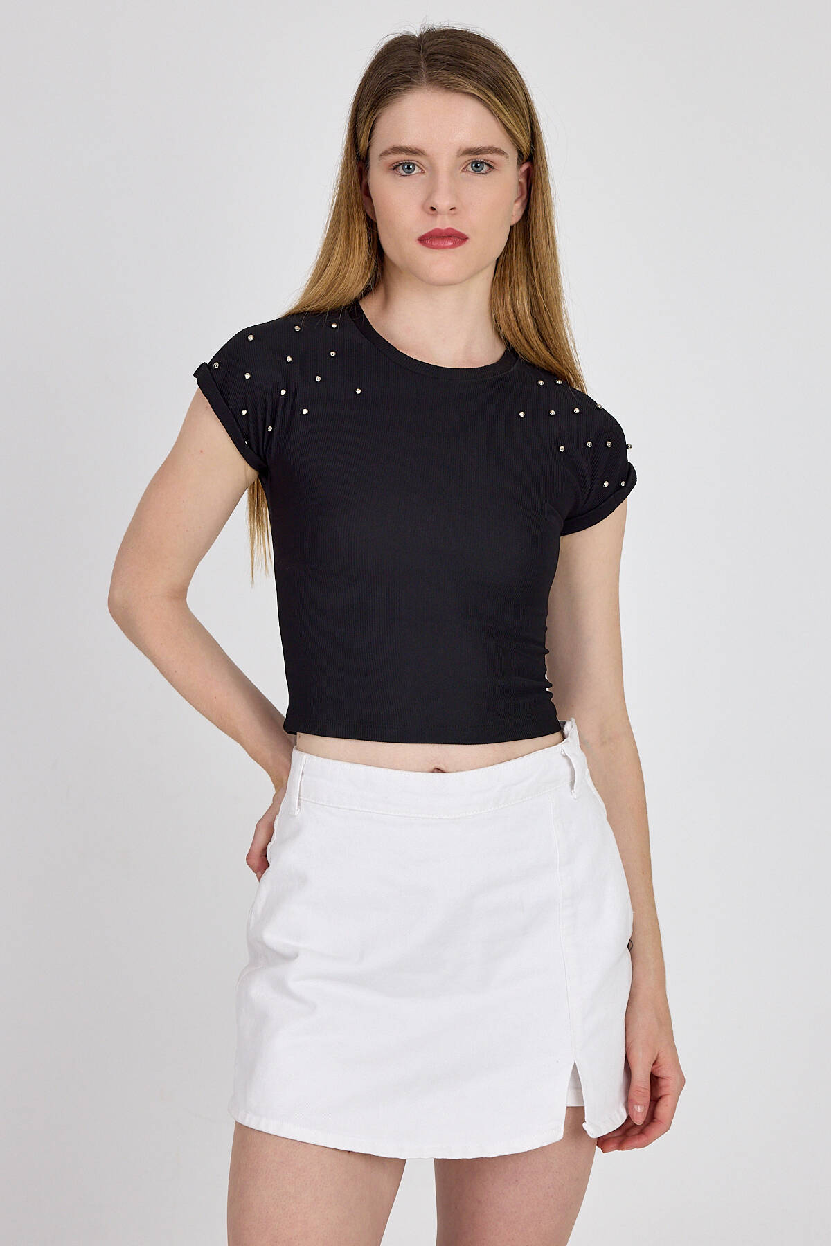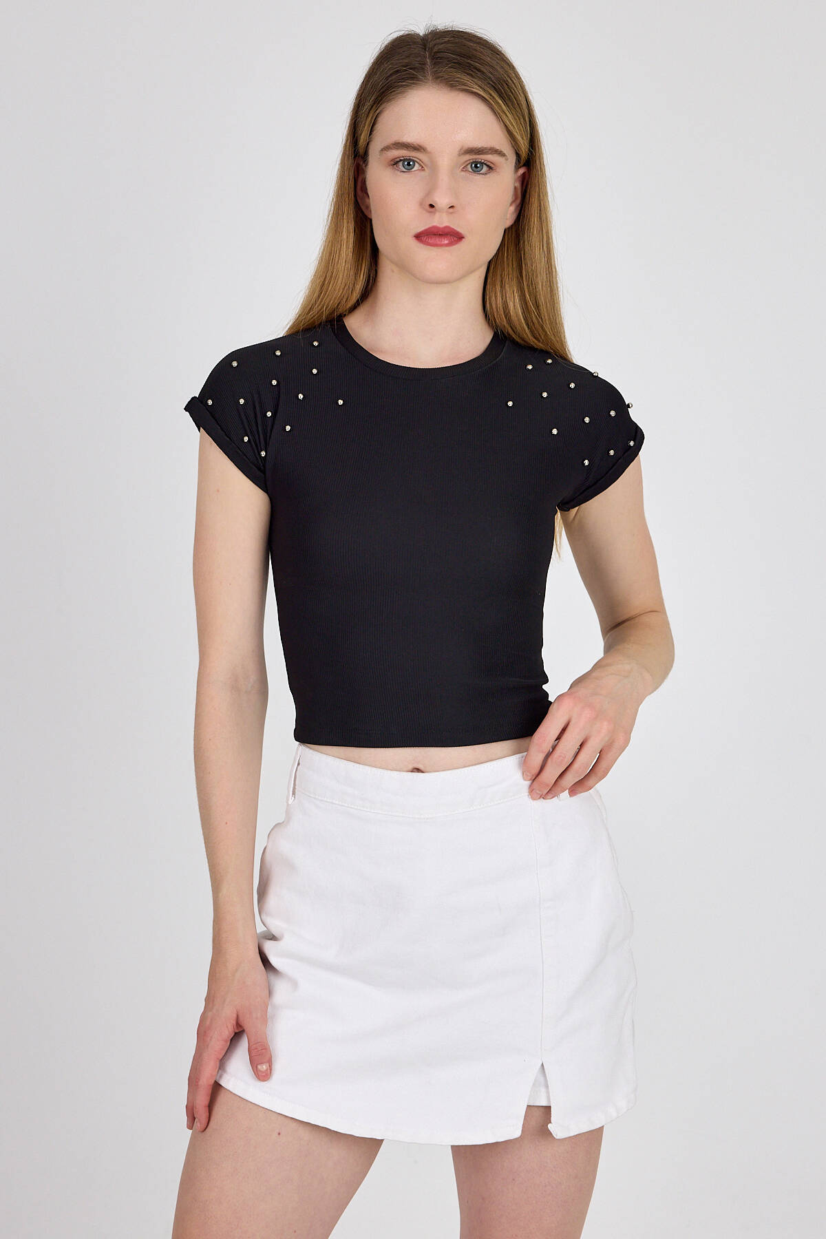 Siyah Omuz Boncuk Detaylı Slim Fit Crop Tişört 9208M