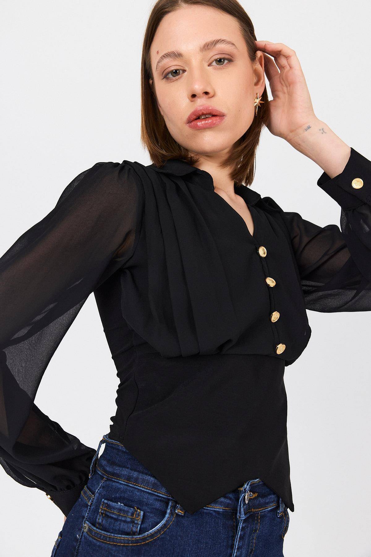 Siyah Pileli Gömlek Yaka Düğmeli Bluz 9471